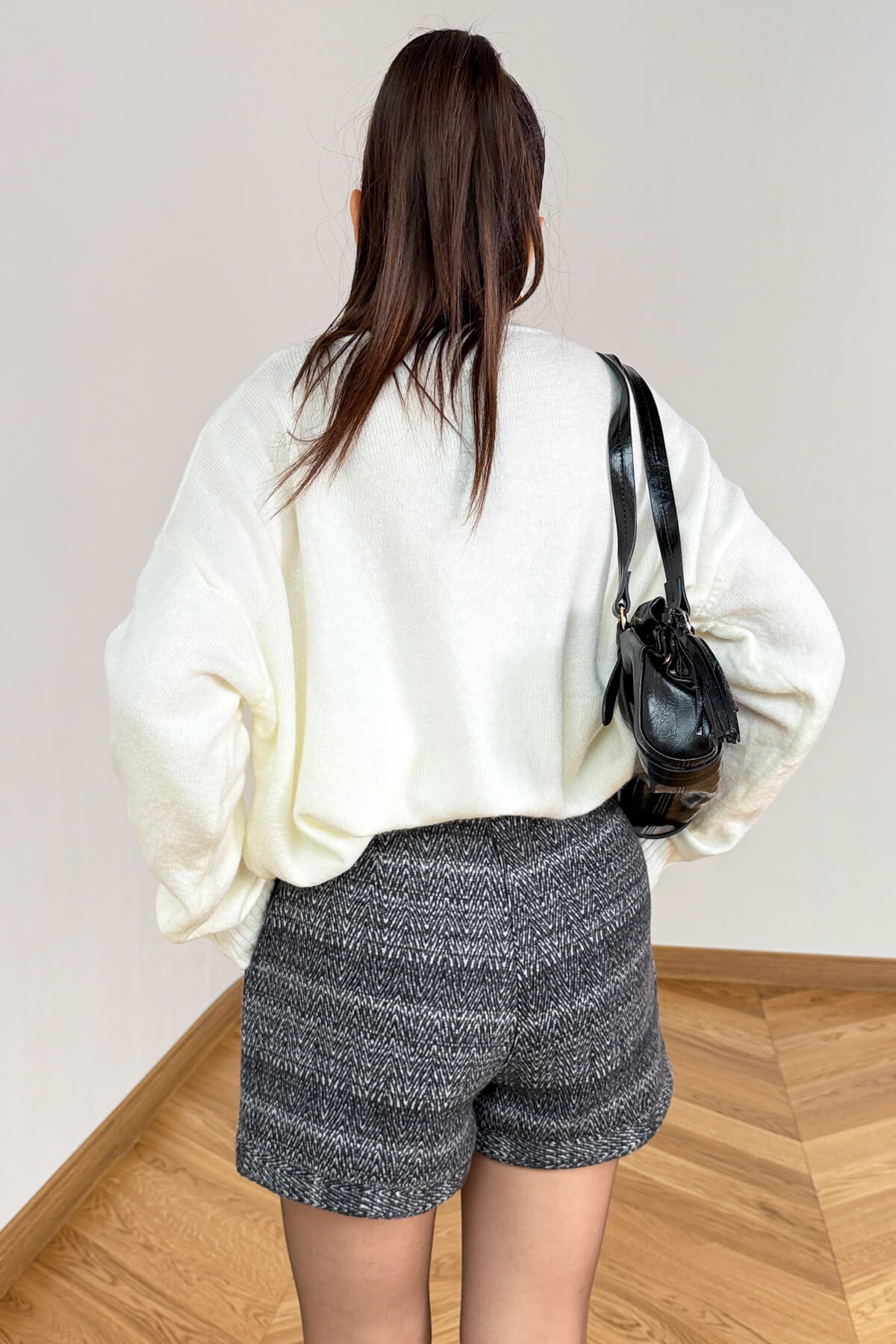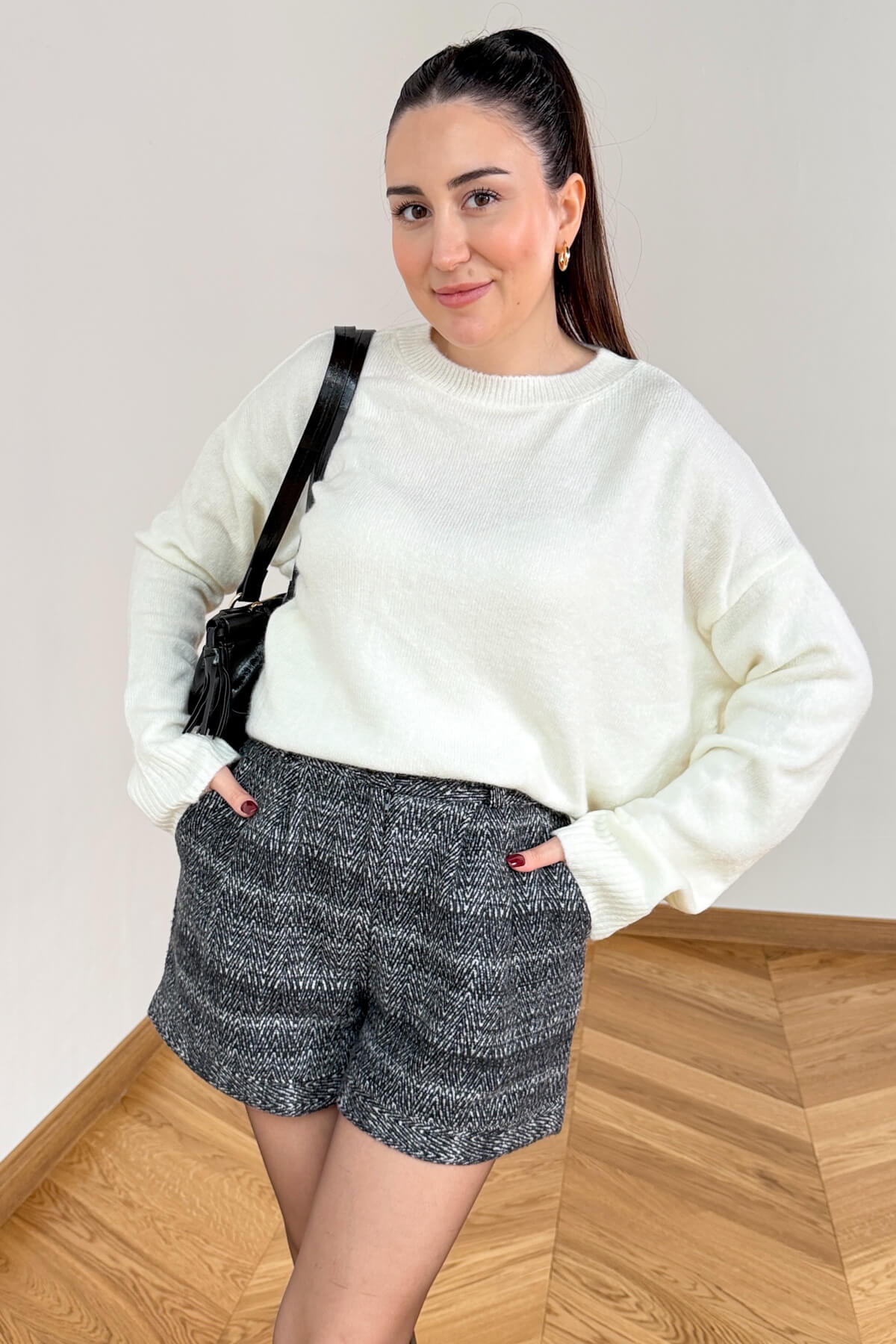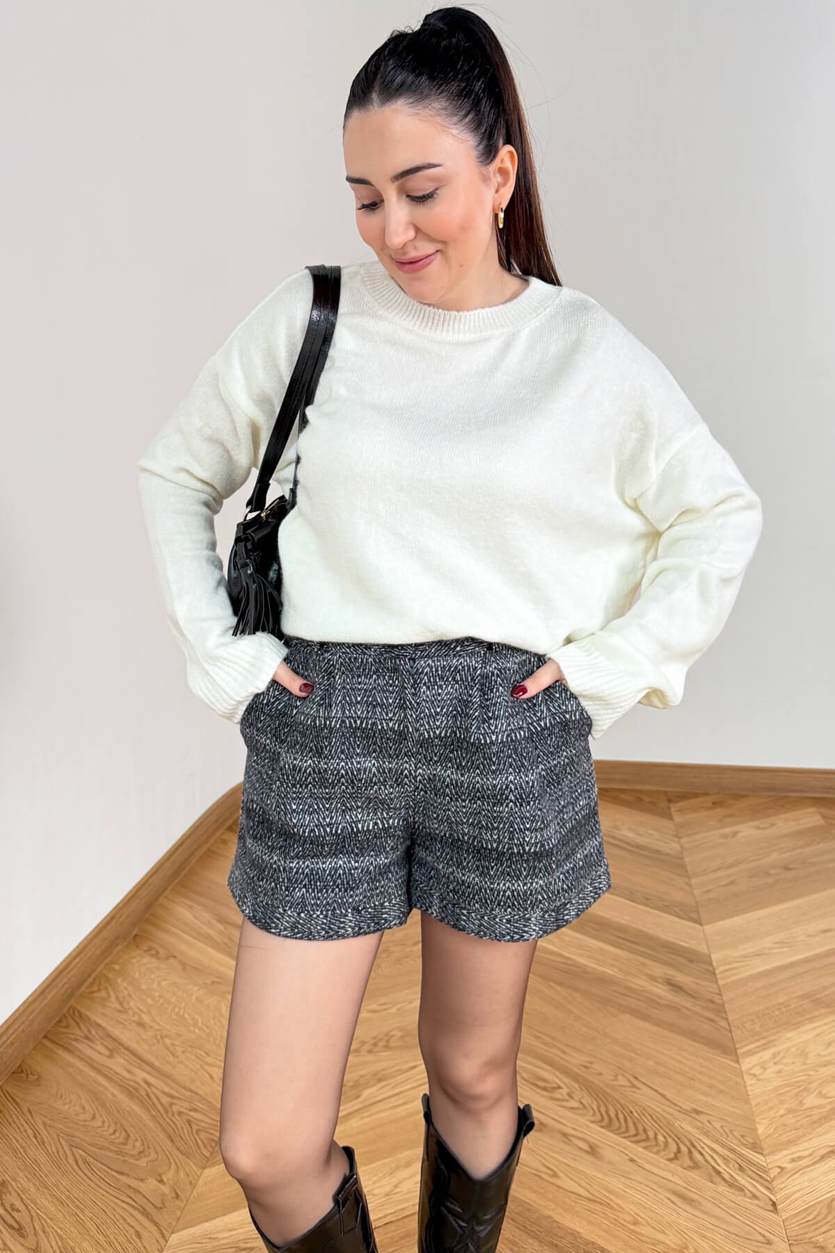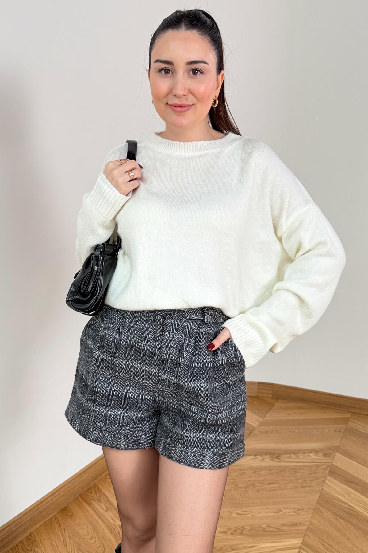 Kış gardırobunun vazgeçilmezi olan kalın dokuma kumaş, bu tasarımda zamansız balıksırtı deseniyle buluşuyor. 40 cm uzunluğundaki ideal mini boyu, hem opak çoraplarla hem de uzun çizmelerle kusursuz bir uyum yakalar. Beldeki zarif gold düğme detayı ve kullanışlı cep yapısıyla hem fonksiyonel hem de sofistike bir duruş sergileyen bu şort, soğuk havalarda stilinizden ödün vermeden sıcak kalmanızı sağlar.