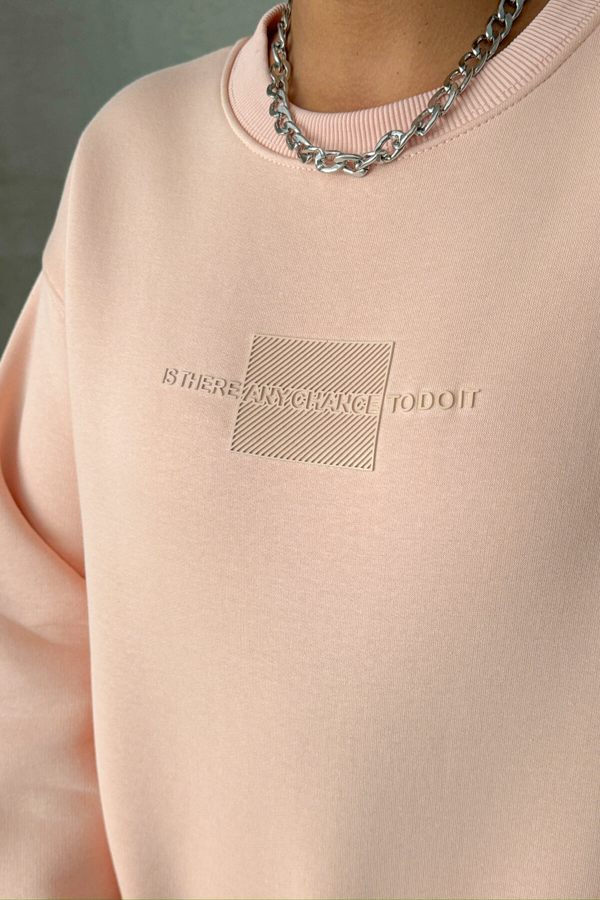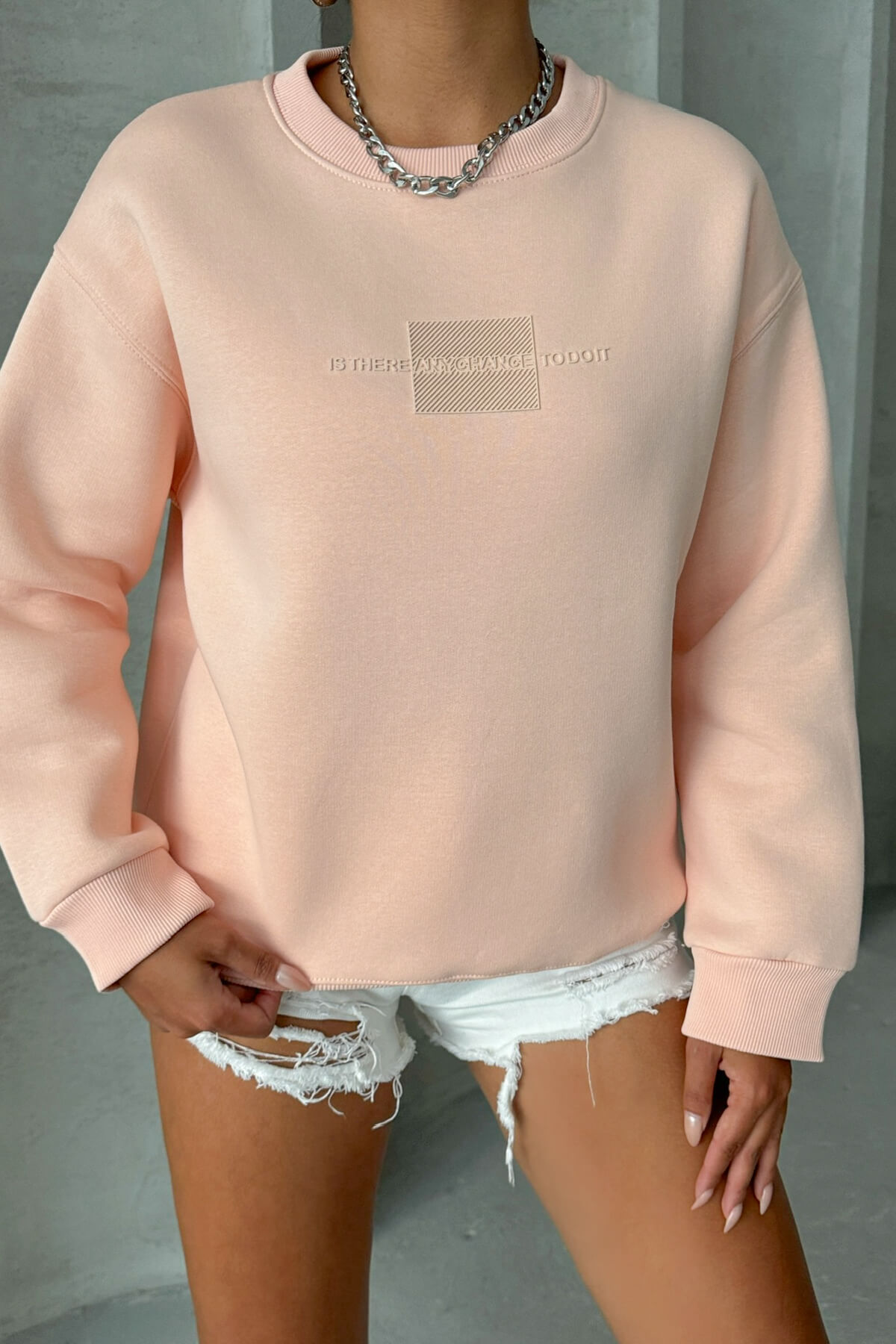 SWT-14285 Pudra Kabartma Yazı Baskılı Bisiklet Yaka Sweatshirt