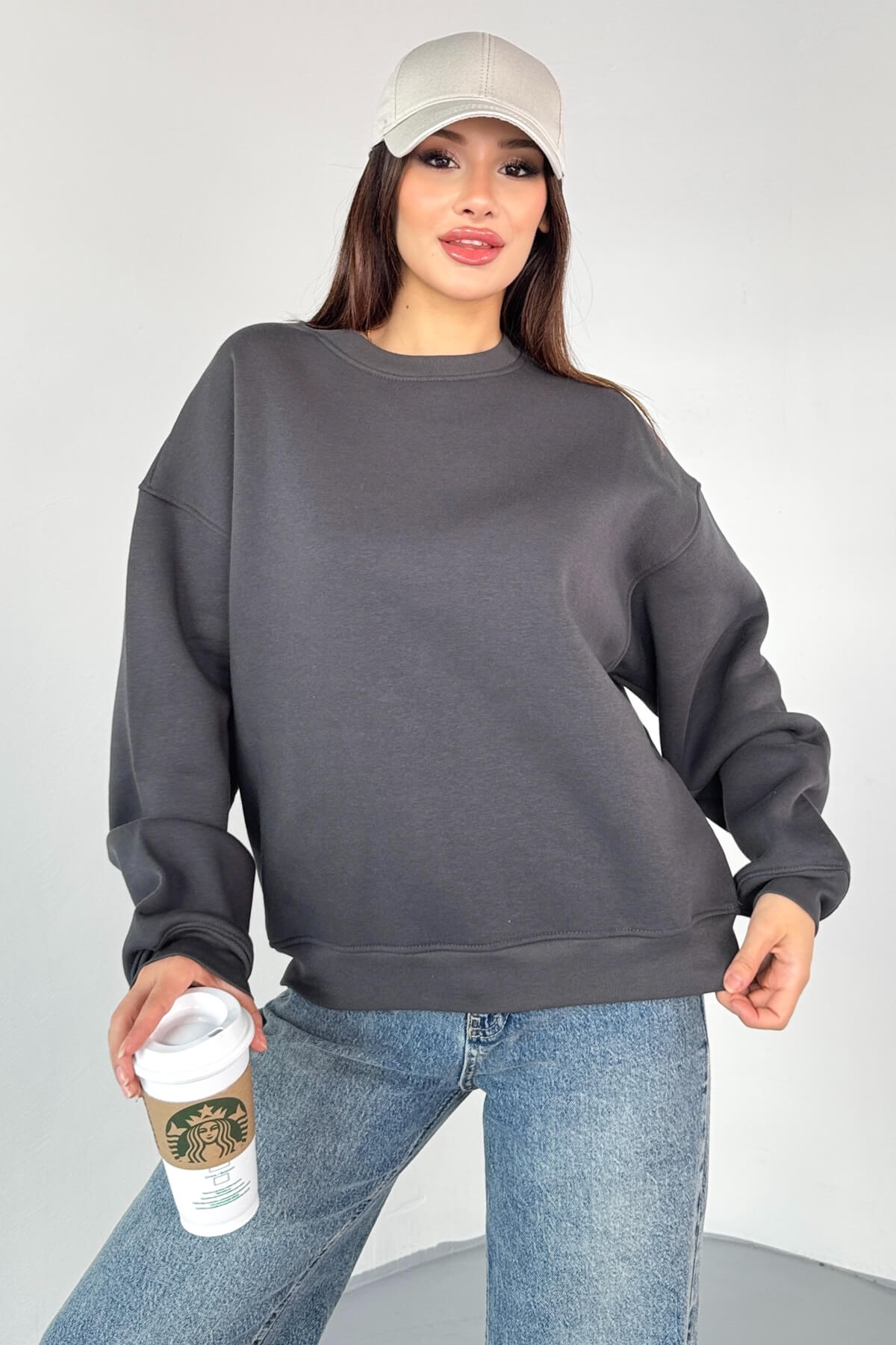 Yuvarlak yaka ve uzun kol ile klasik sweatshirt formu.