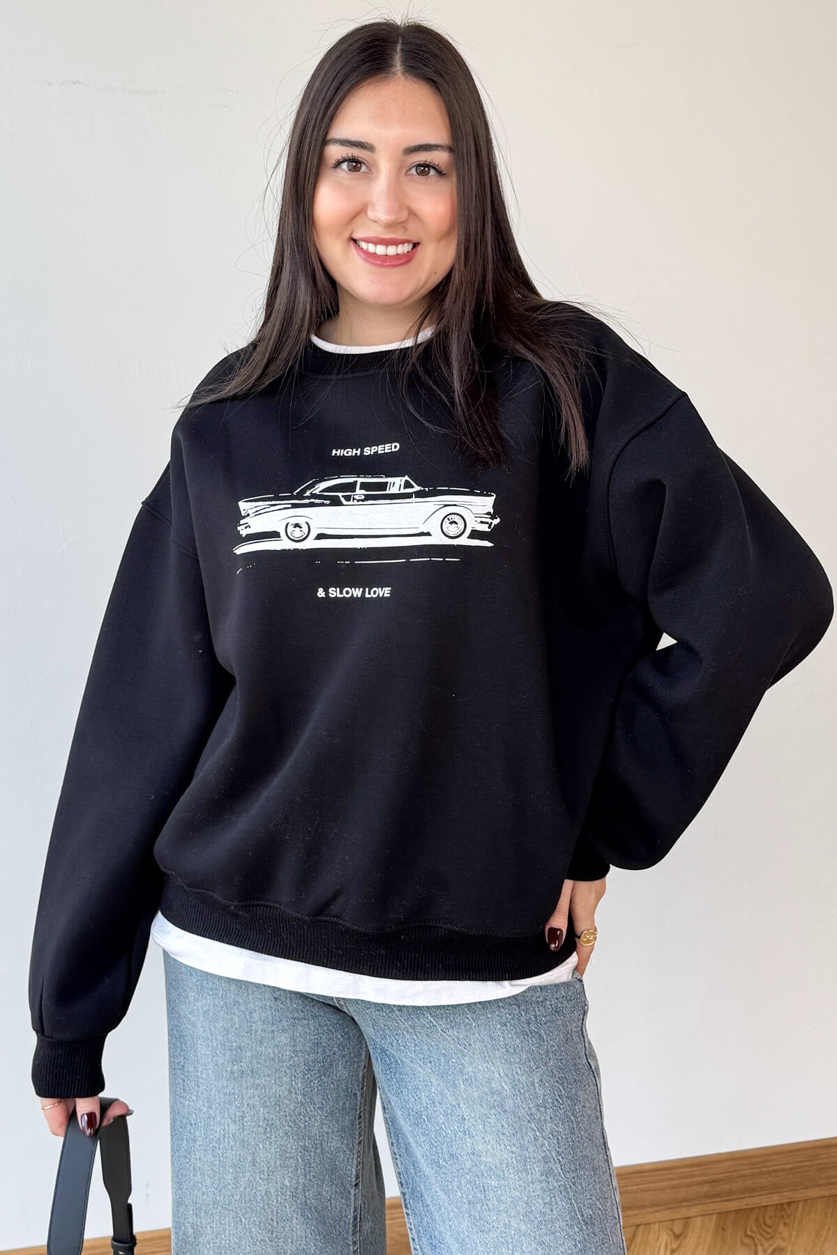 SWT-1894 Siyah Baskılı Şardonlu Üç İplik Kompakt Penye Kumaş Sweatshirt