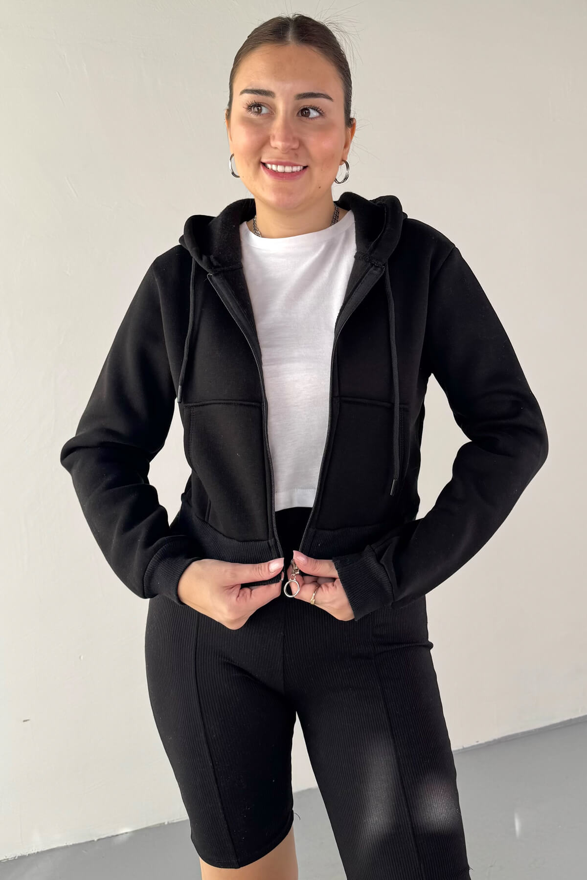 SWT-212 Siyah Kapüşonlu Fermuarlı Cep Detaylı Cropped Sweat