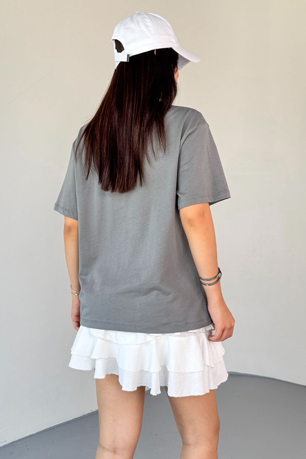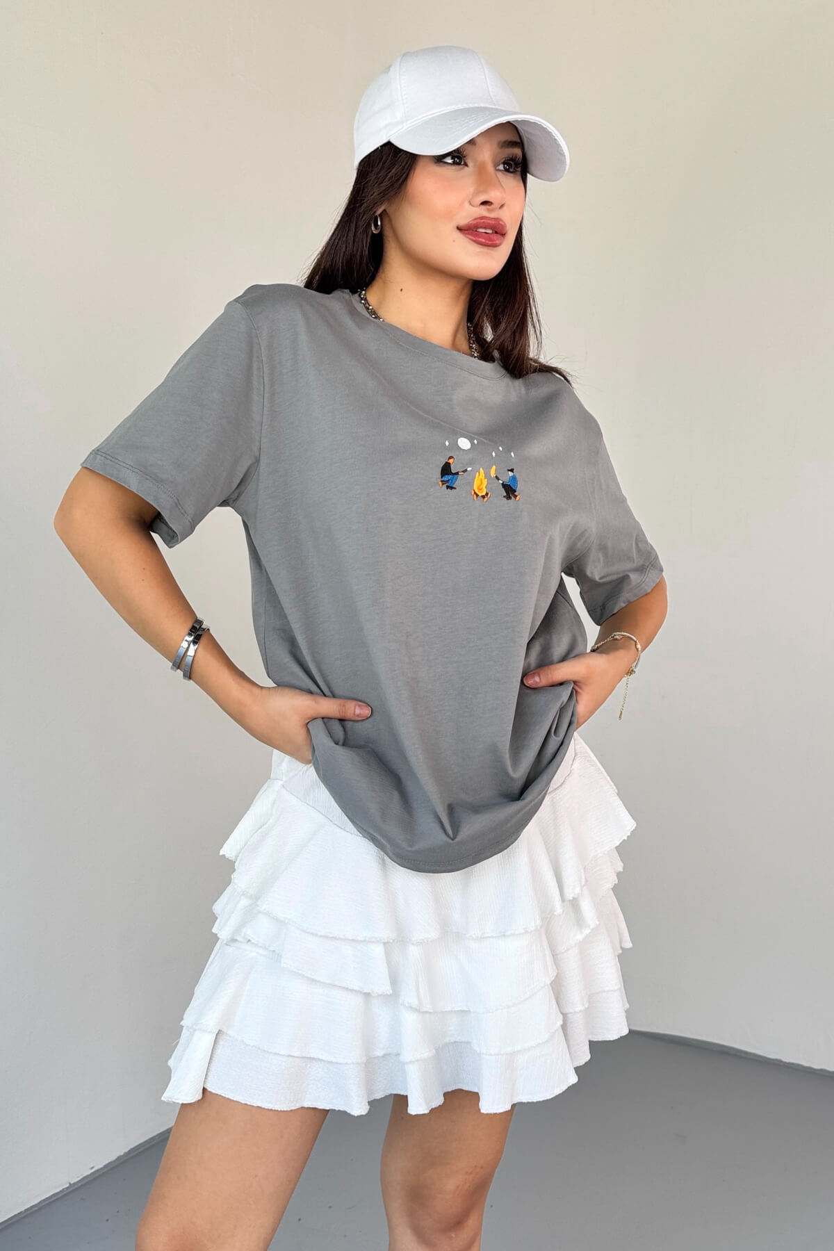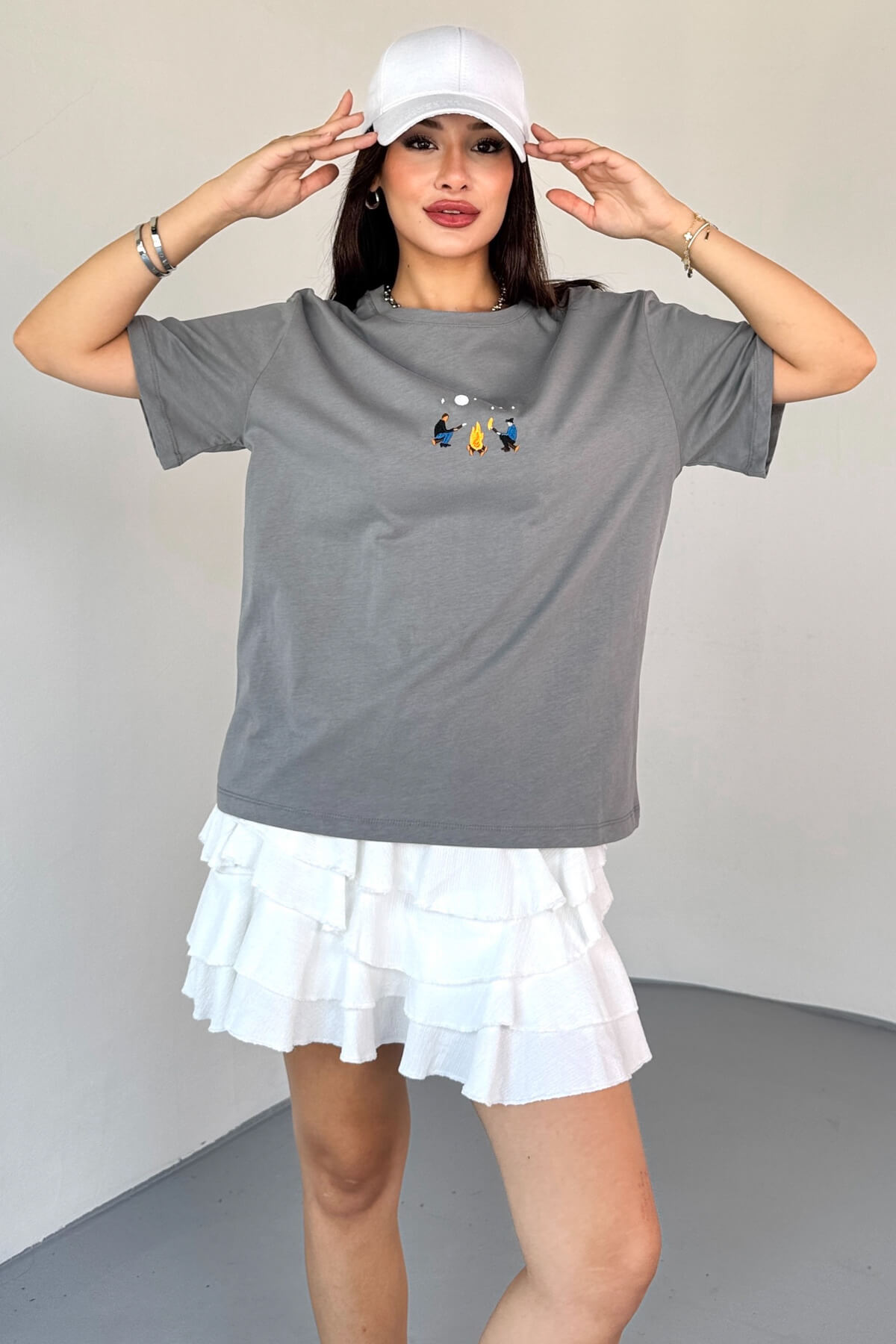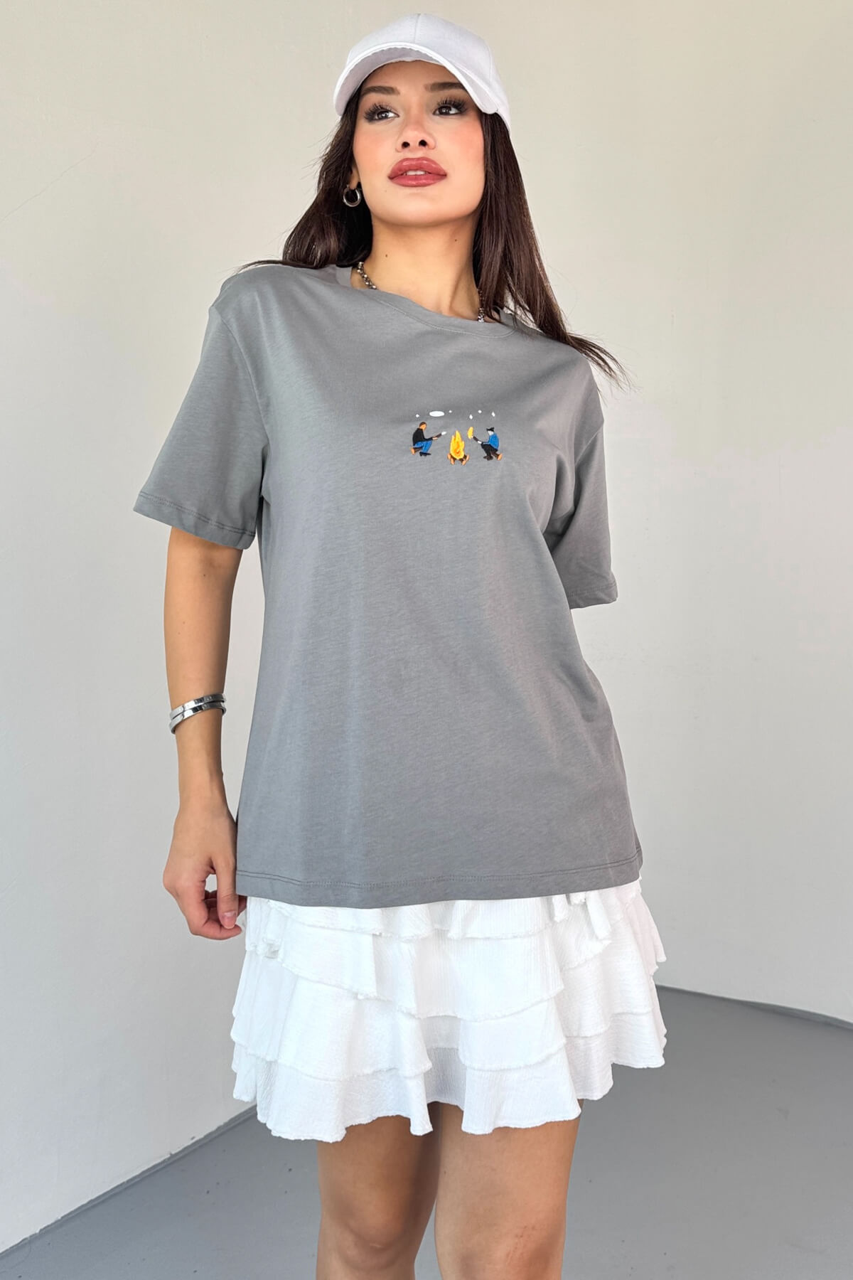 T-910 Füme Ateş Nakışlı Kısa Kollu Salaş Pamuklu Tişört