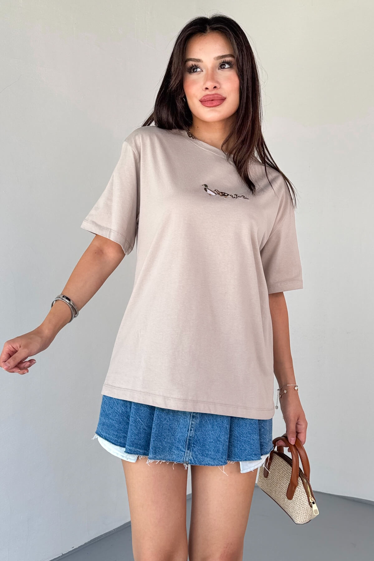 T-913 Taş Rengi Ördek Nakışlı Kısa Kollu Pamuklu Tişört