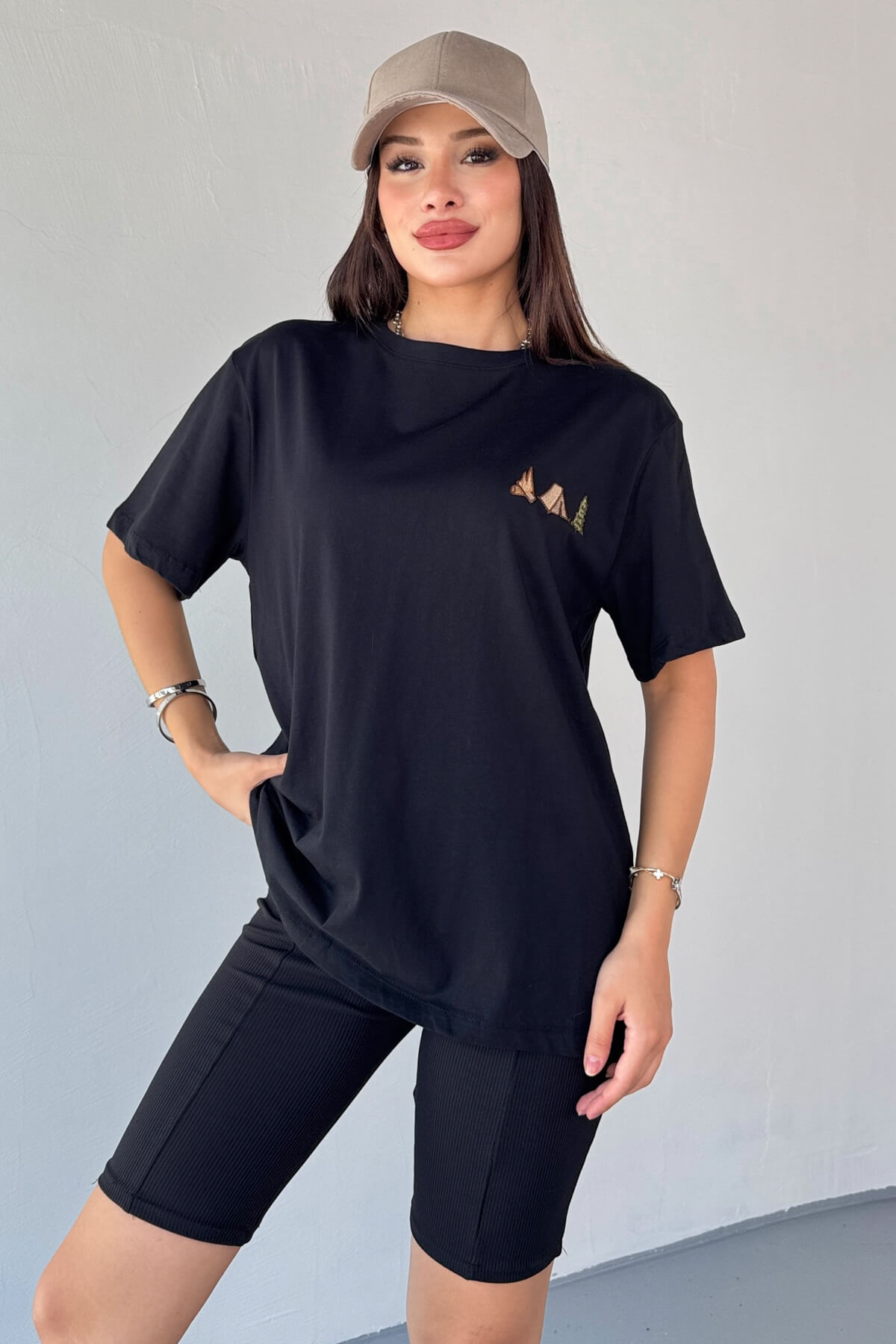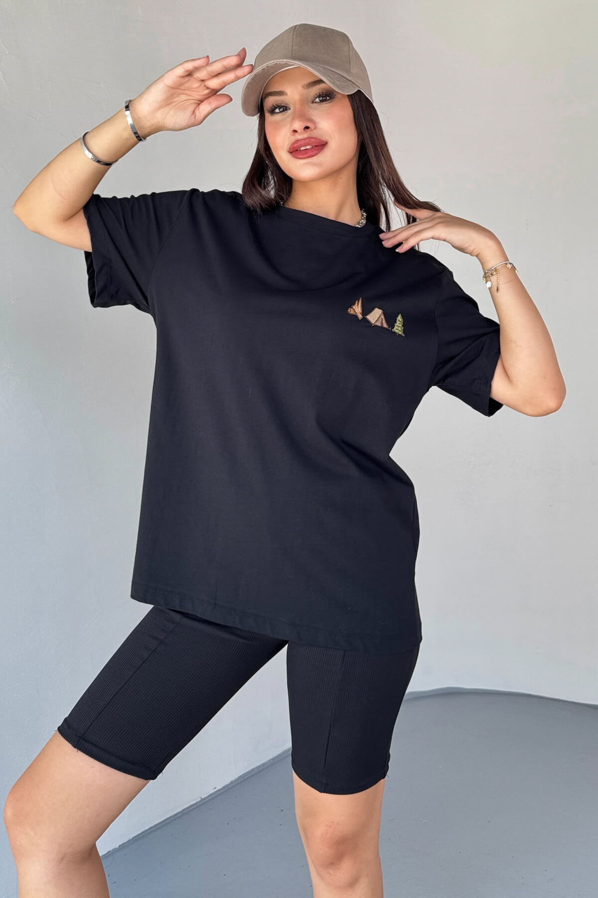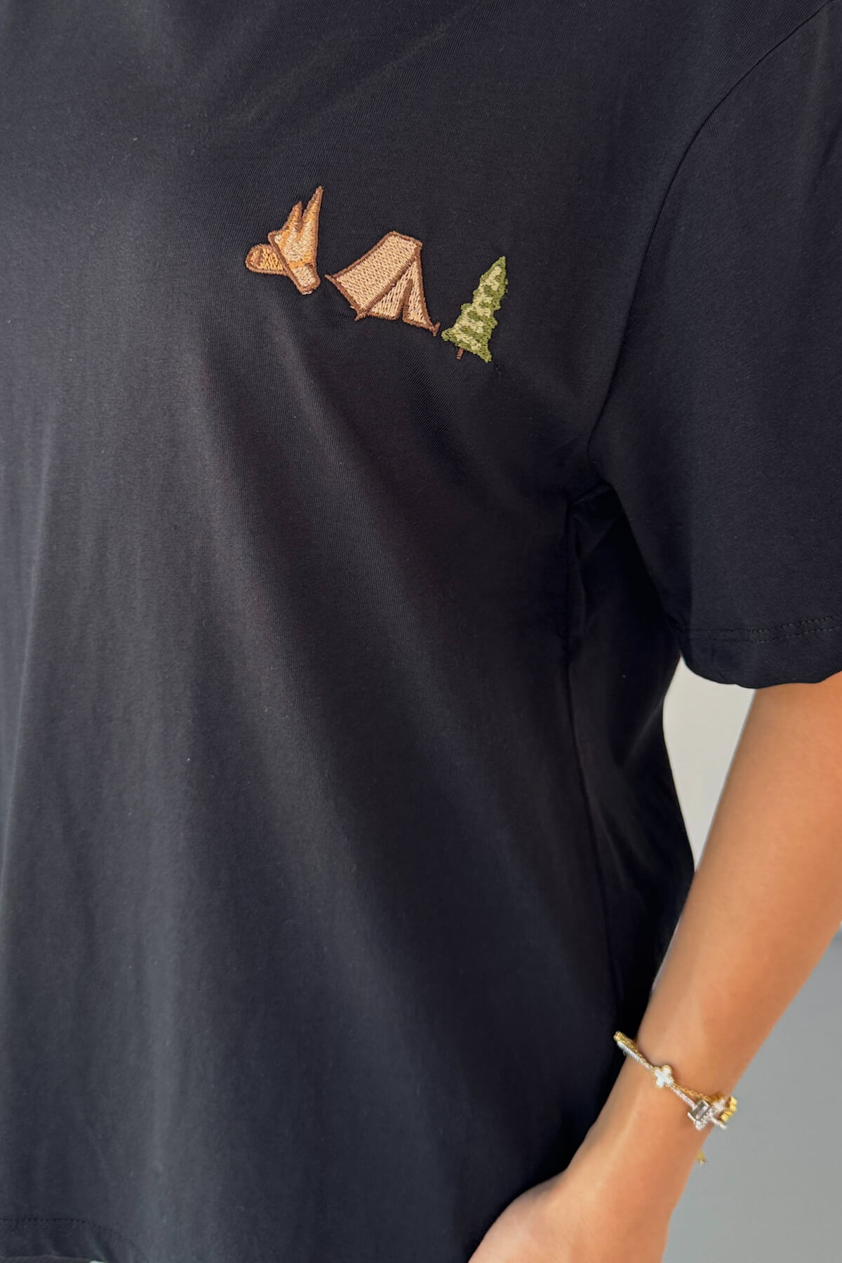 T-914 Siyah Kamp Nakış İşlemeli Bisiklet Yaka Tişört