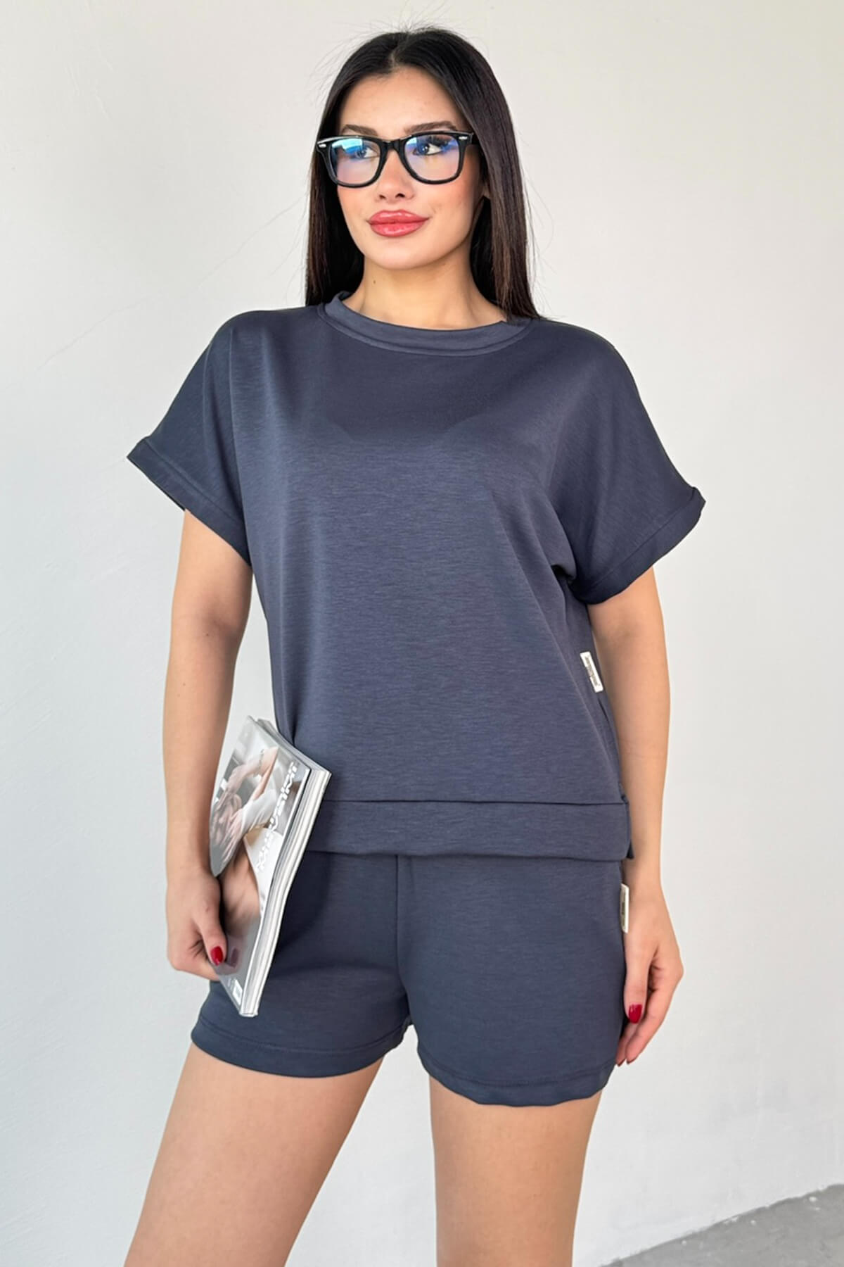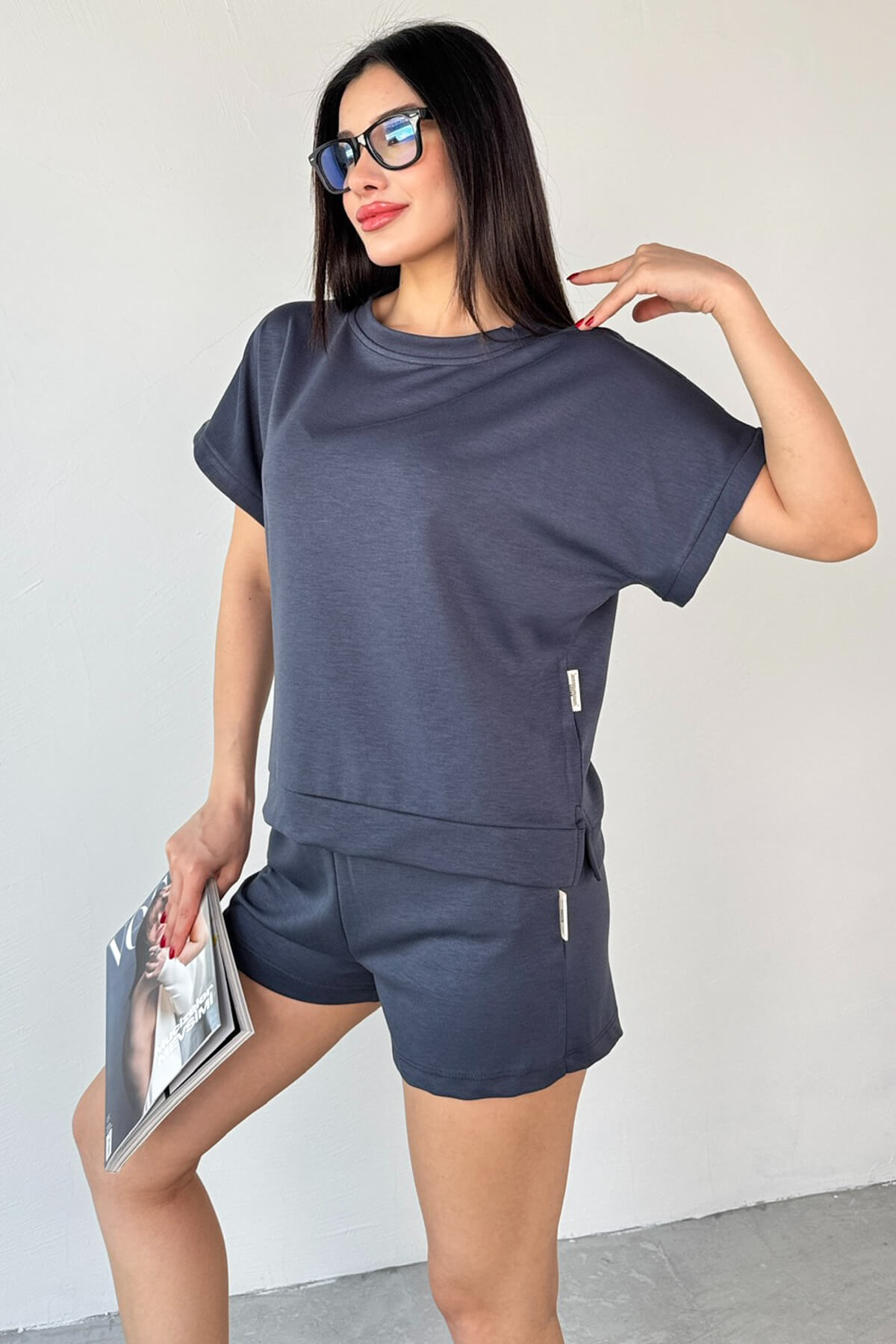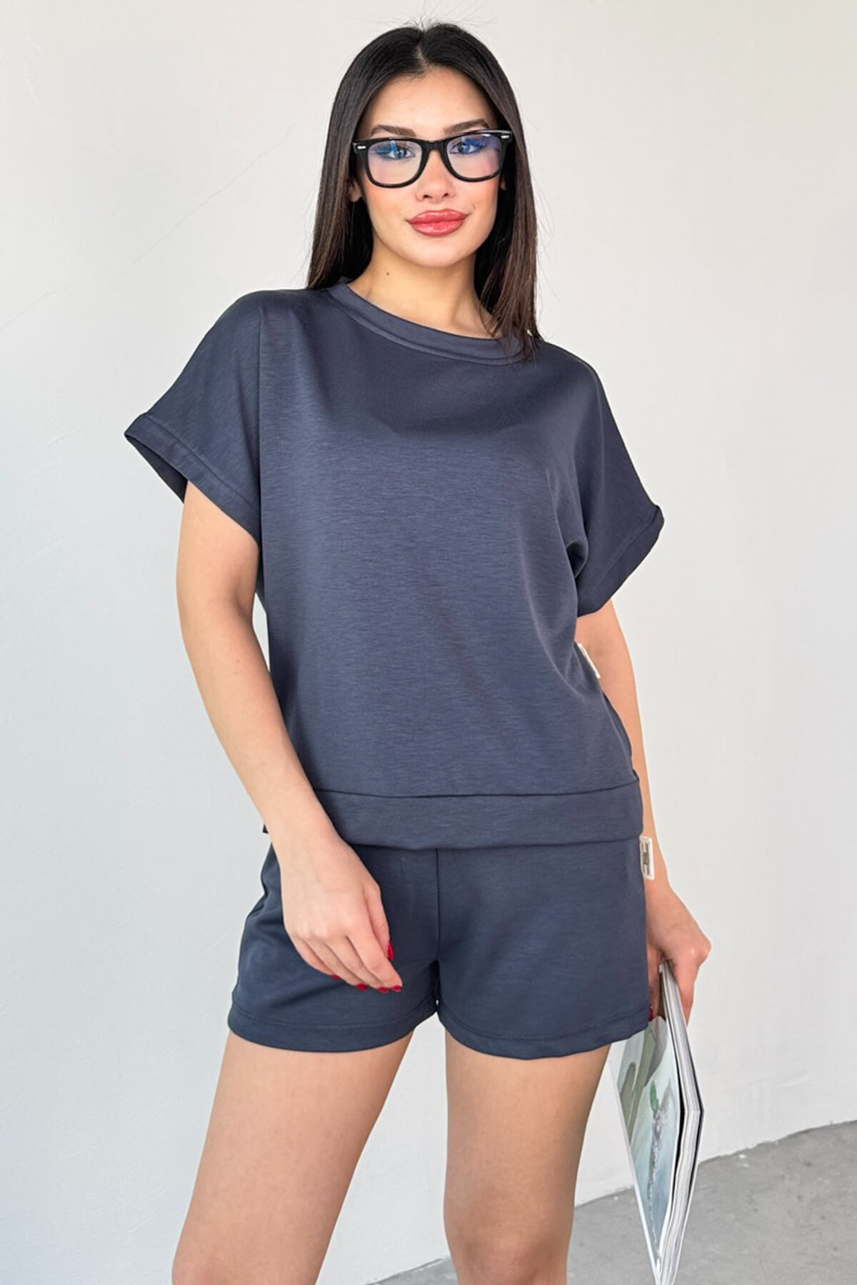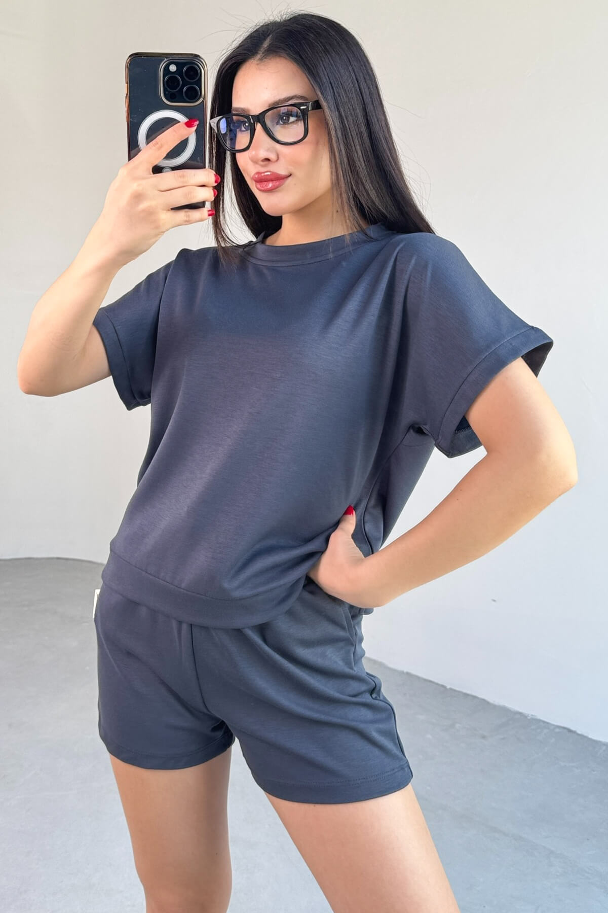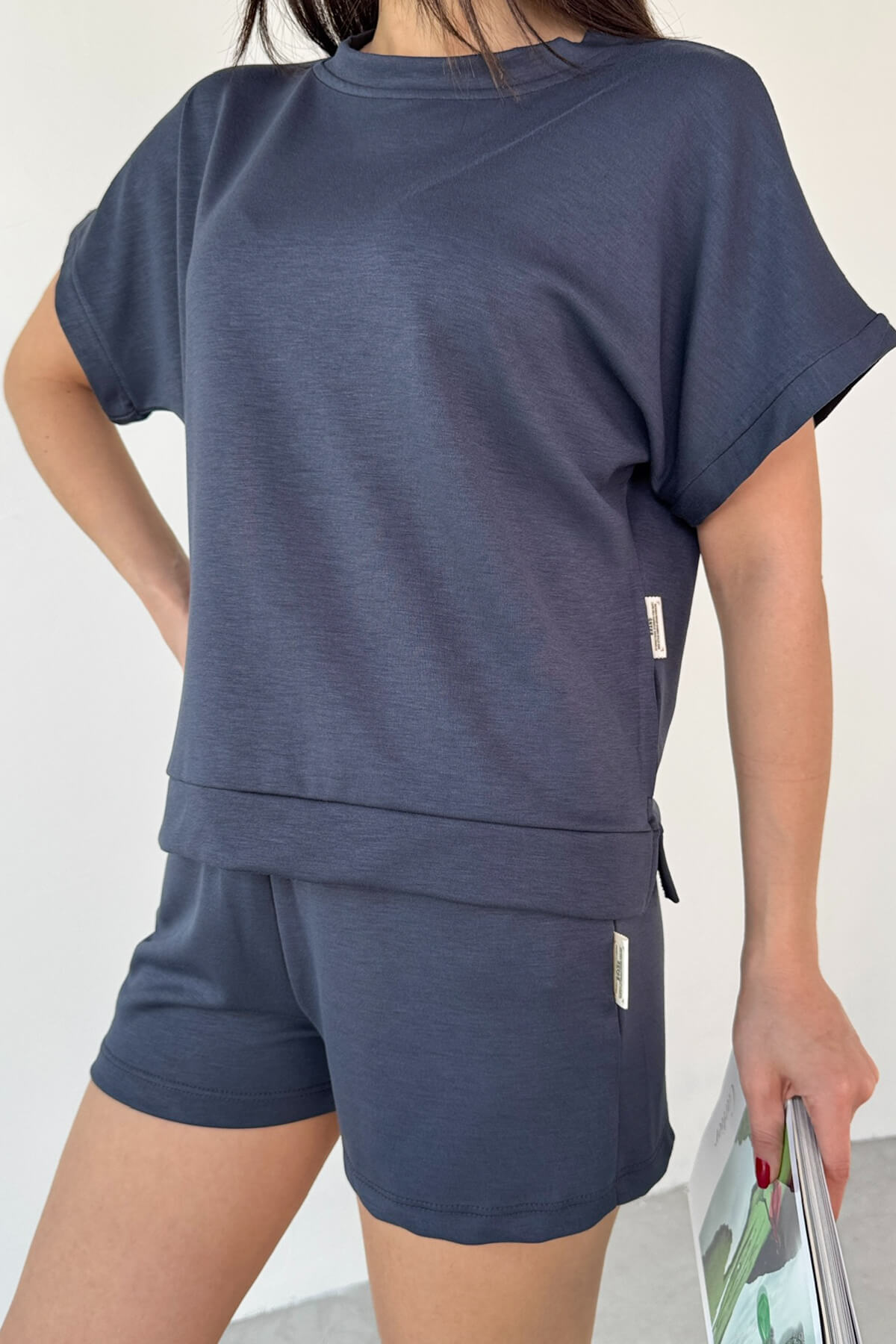 Tişört bisiklet yaka T kol modeldir. Şort ip bağlamalı, rahat giyime sahiptir.