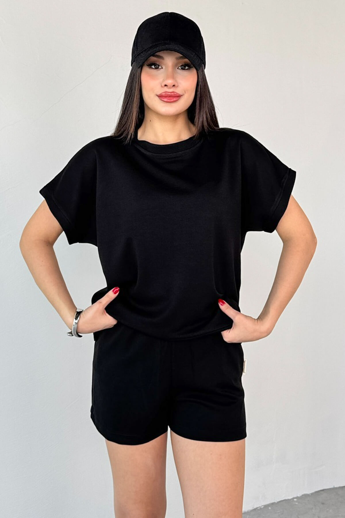 Cappmoda  TKM-0021 Siyah T Kol Model Bisiklet Yaka Tişört Bel Lastikli İp Bağlamalı Cepli Şort İkili Takım