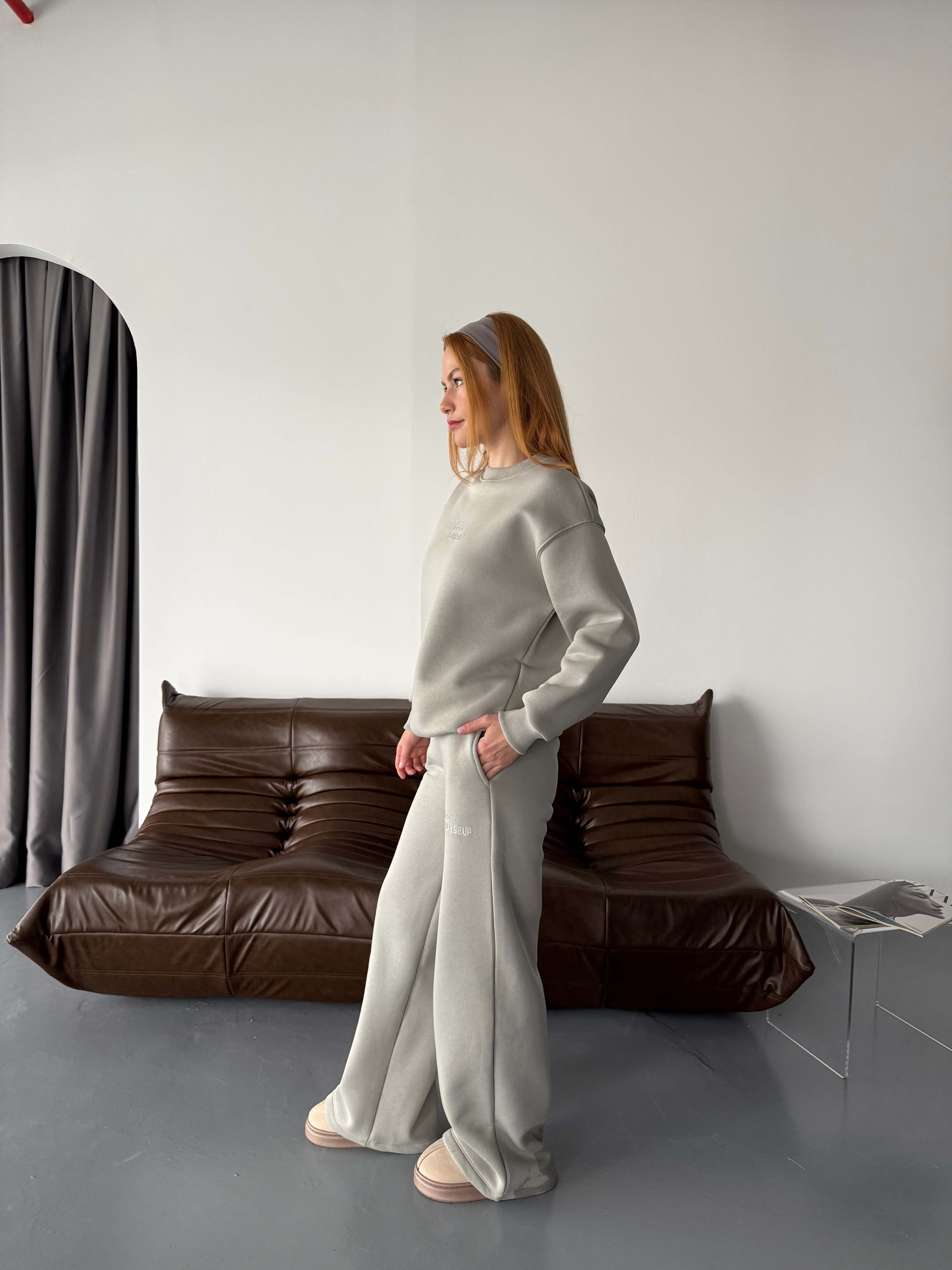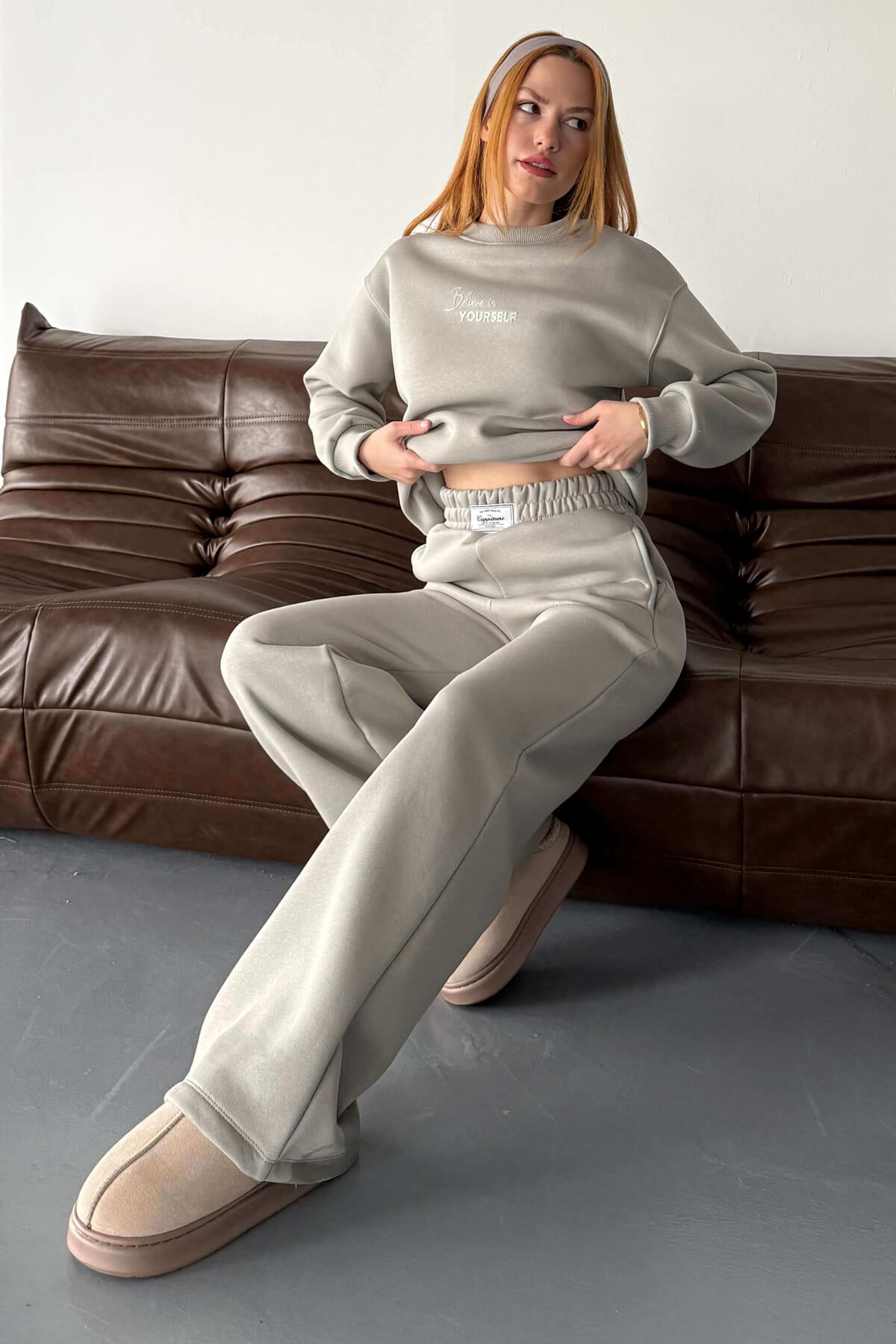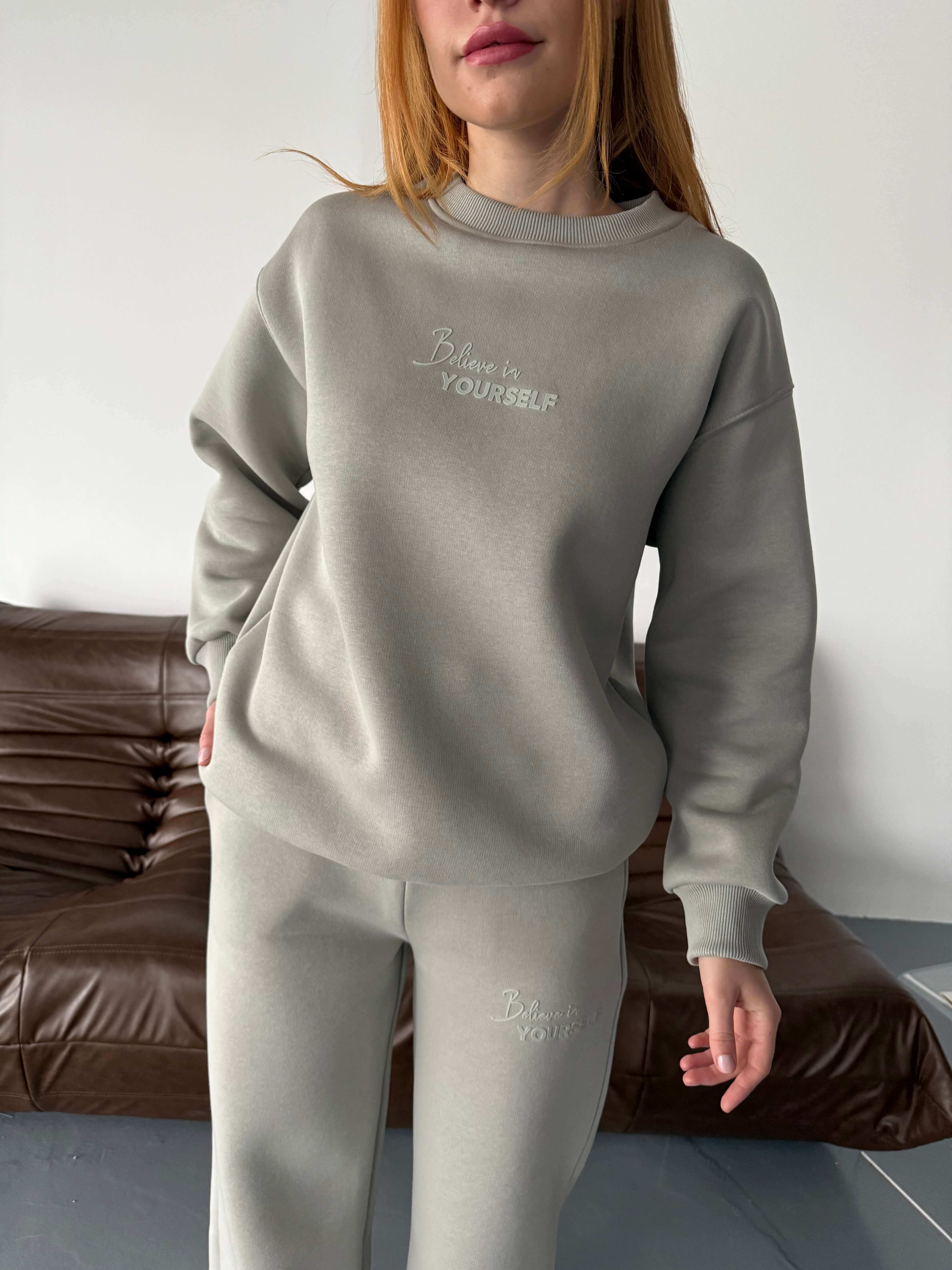 TKM-0040 Boyama Gri Believe İn Yourself Kabartma Yazı Üç İplik Şardonlu İkili Takım