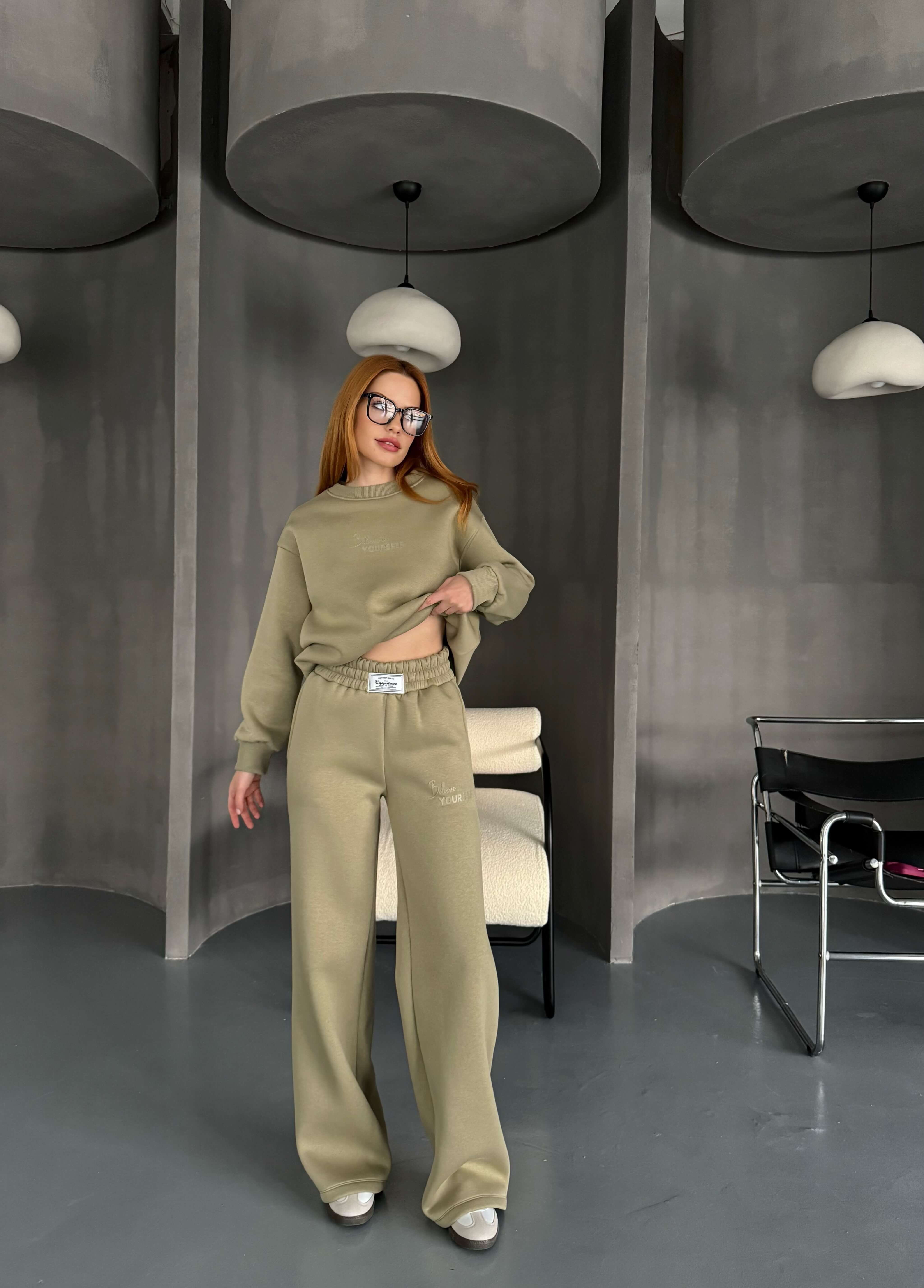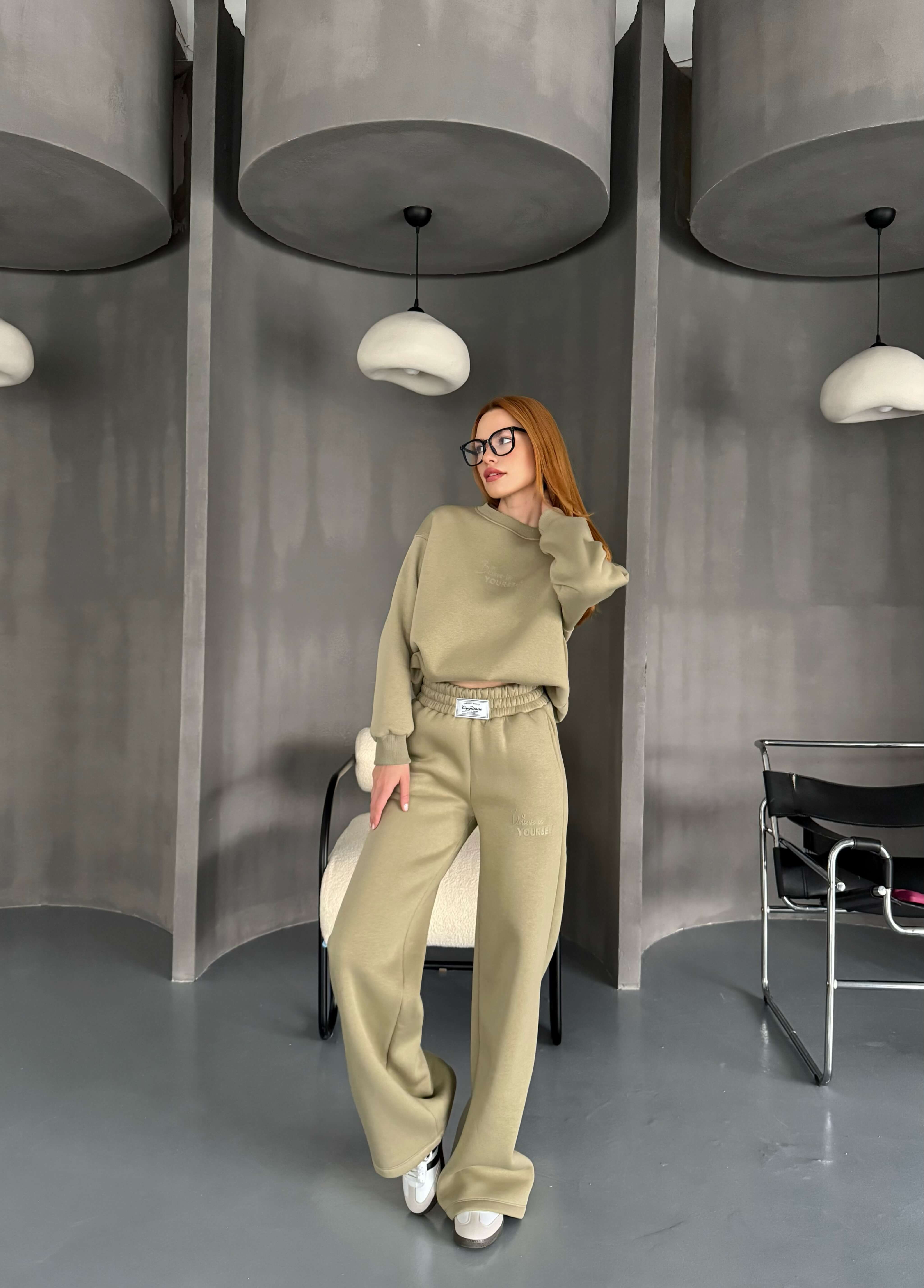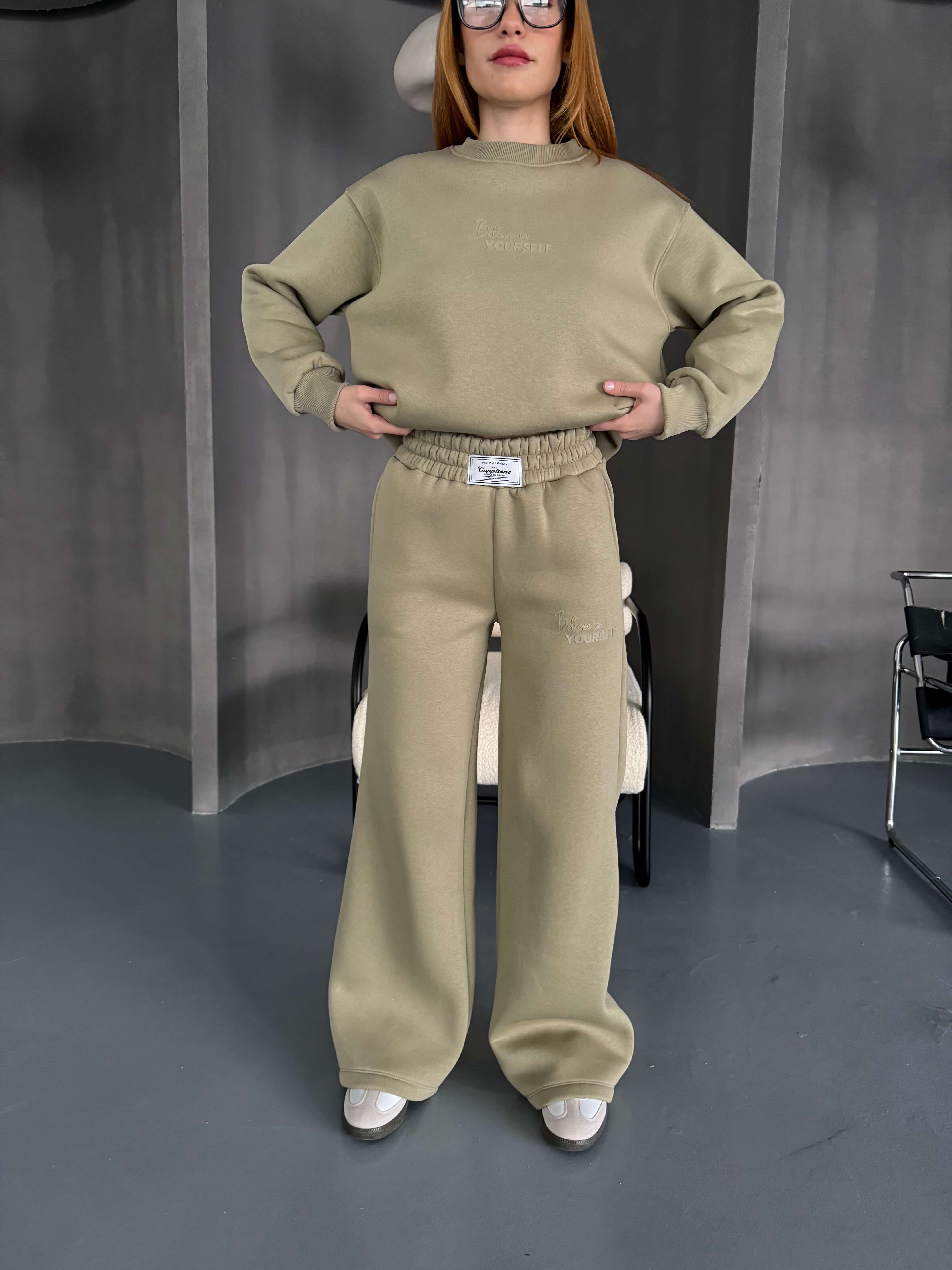 TKM-0040 Haki Believe İn Yourself Kabartma Yazı Baskılı Üç İplik Şardonlu İkili Takım