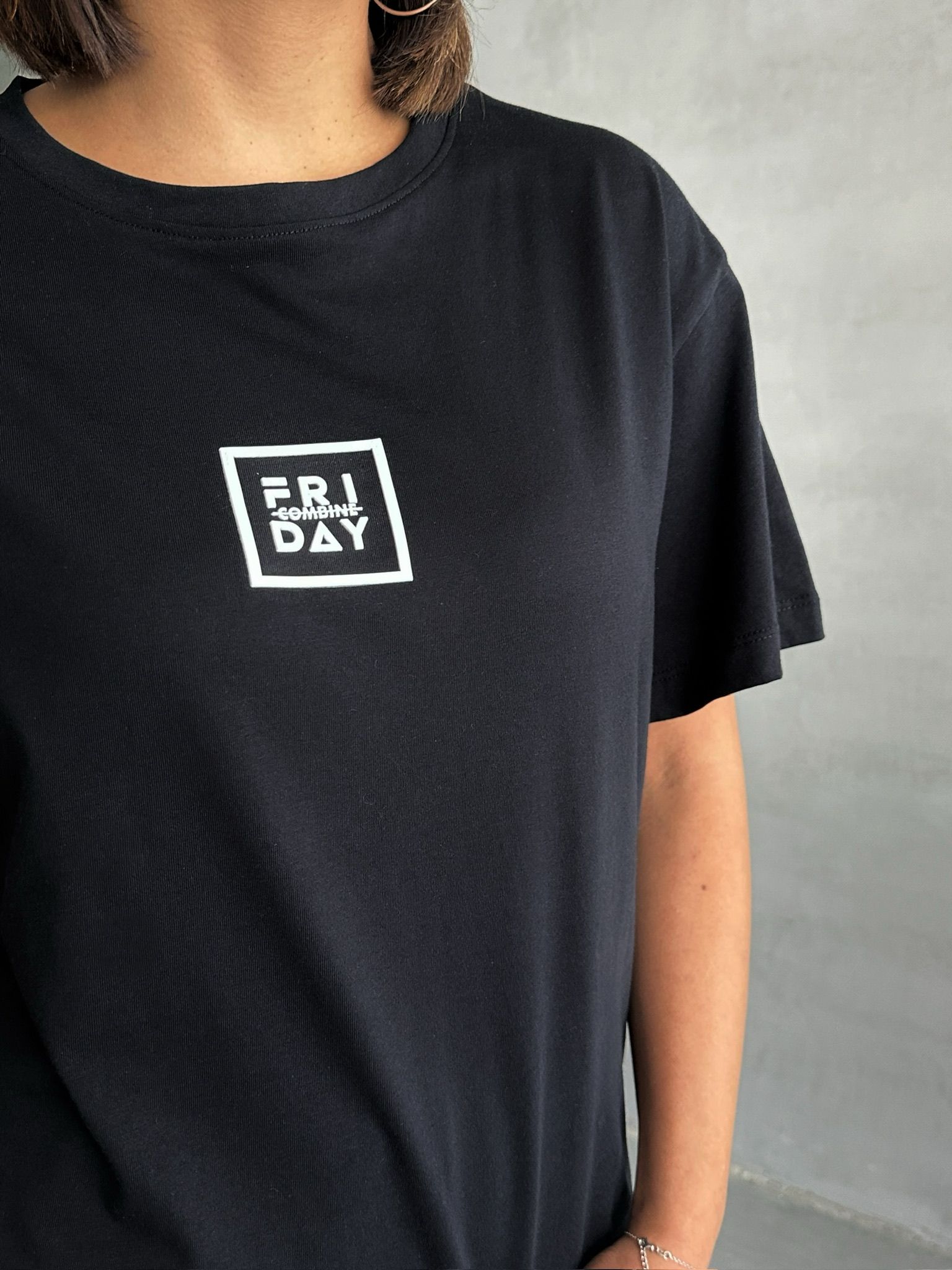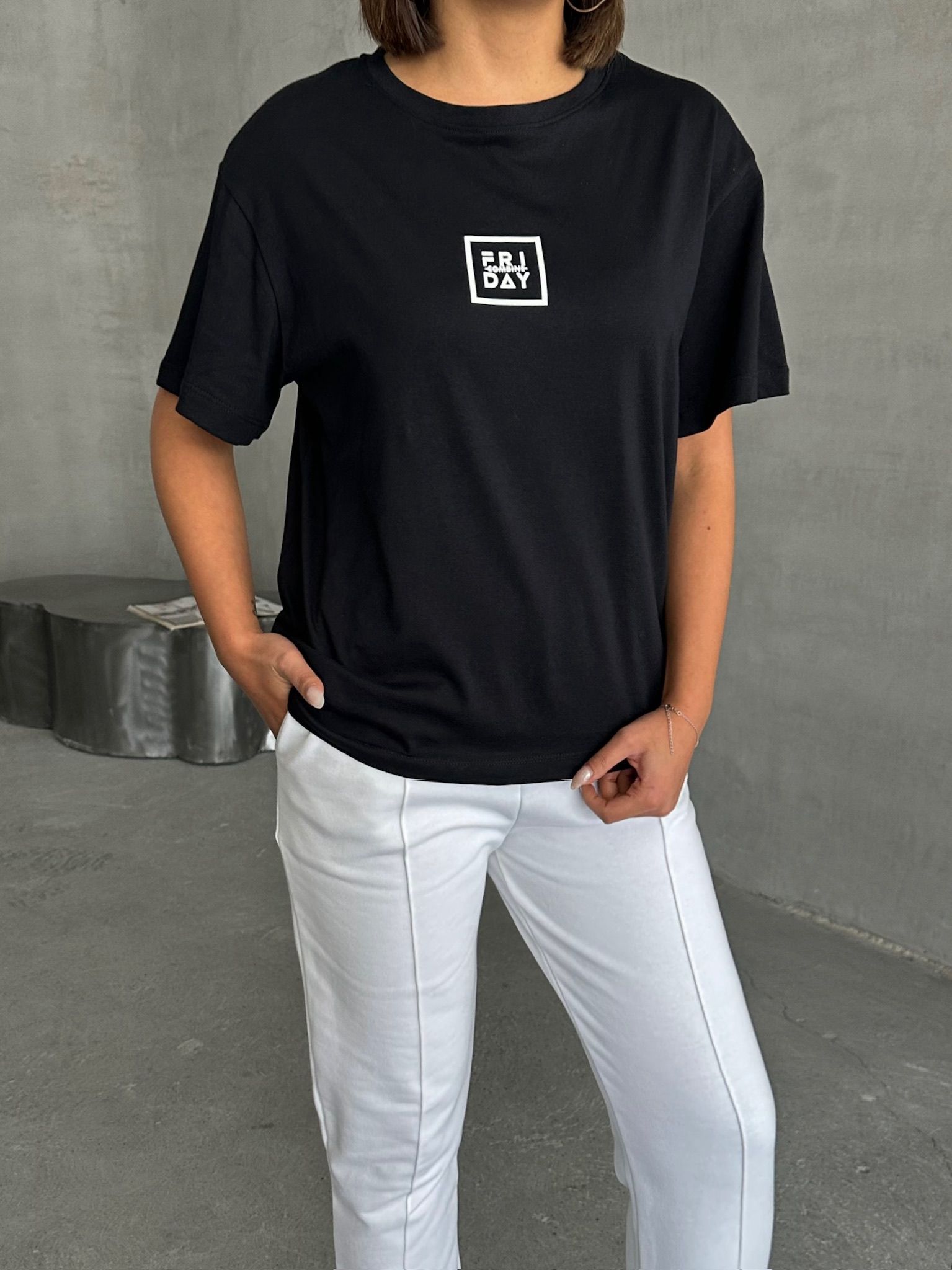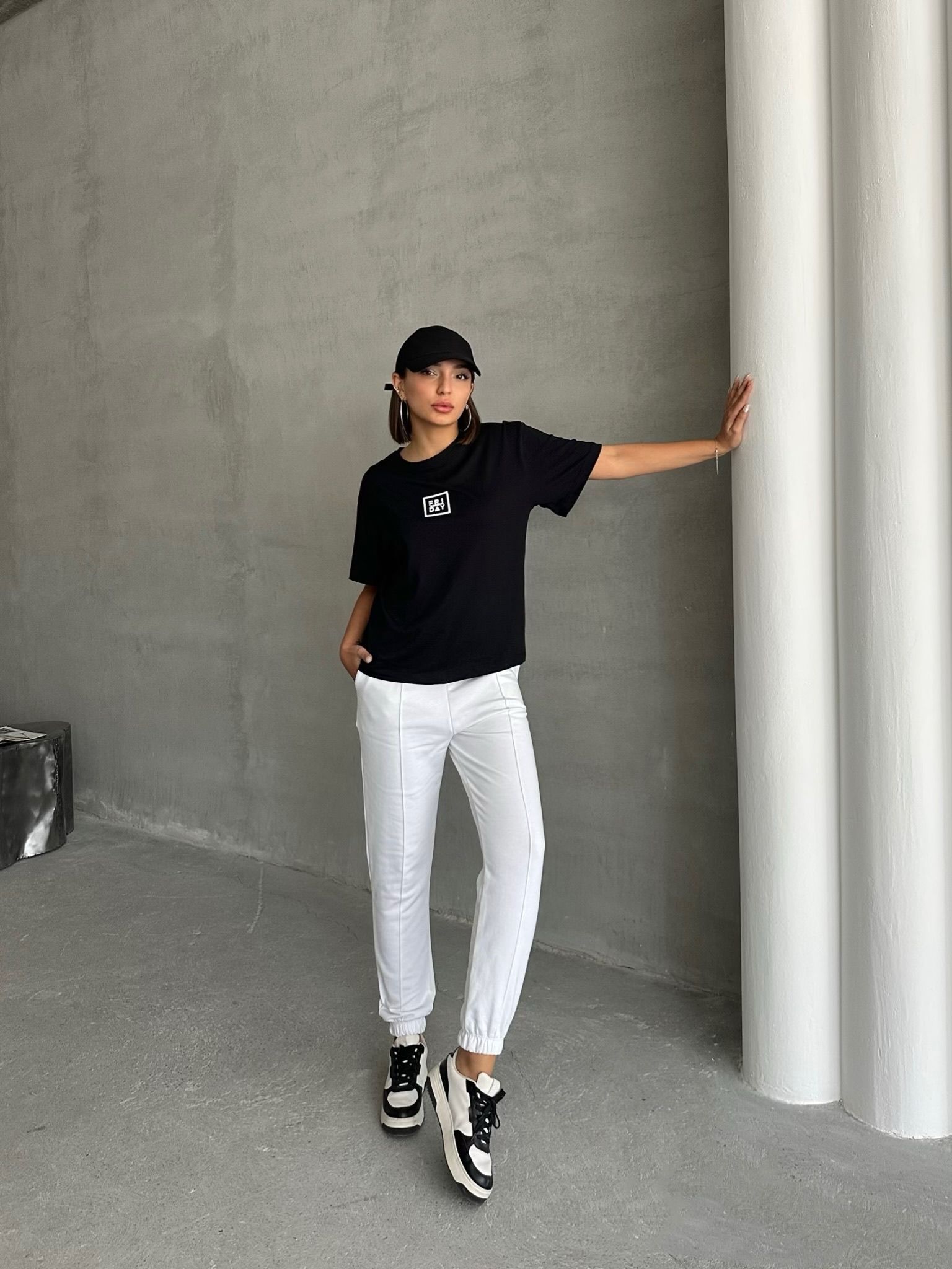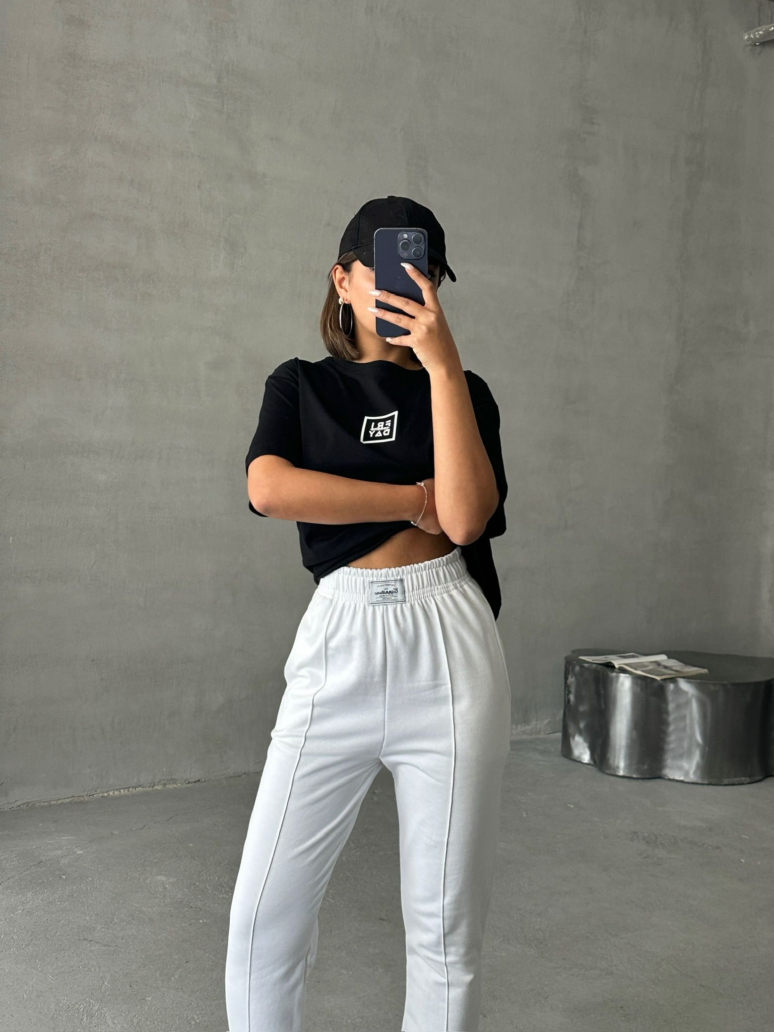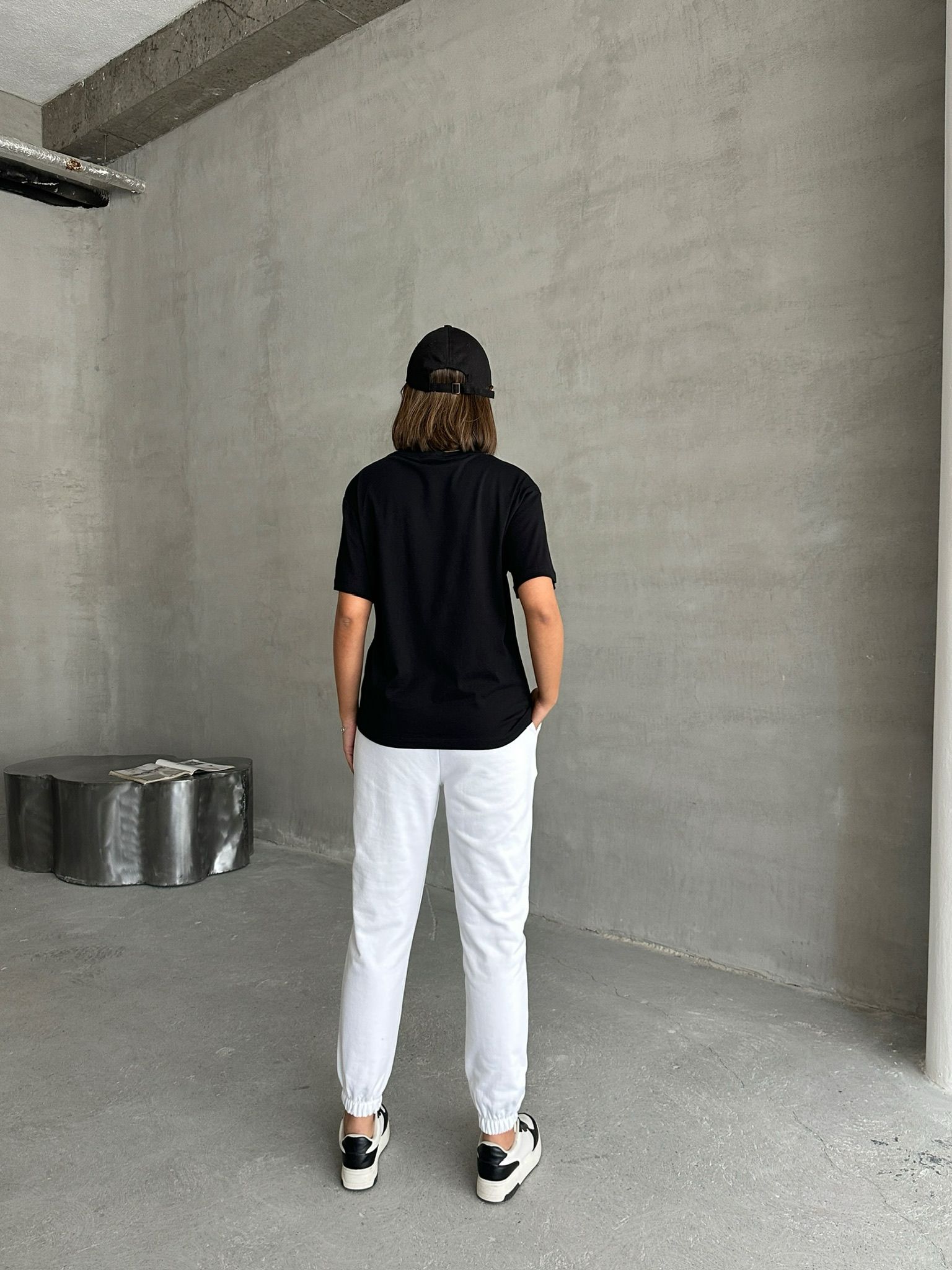 TKM-0047 Beyaz Frıday Yazılı Enjeksiyon Baskı Bisiklet Yaka Tişört Etiket Detay Bel Lastikli Jogger Eşofman İkili Takım