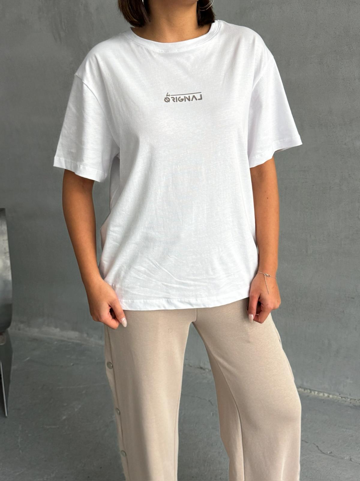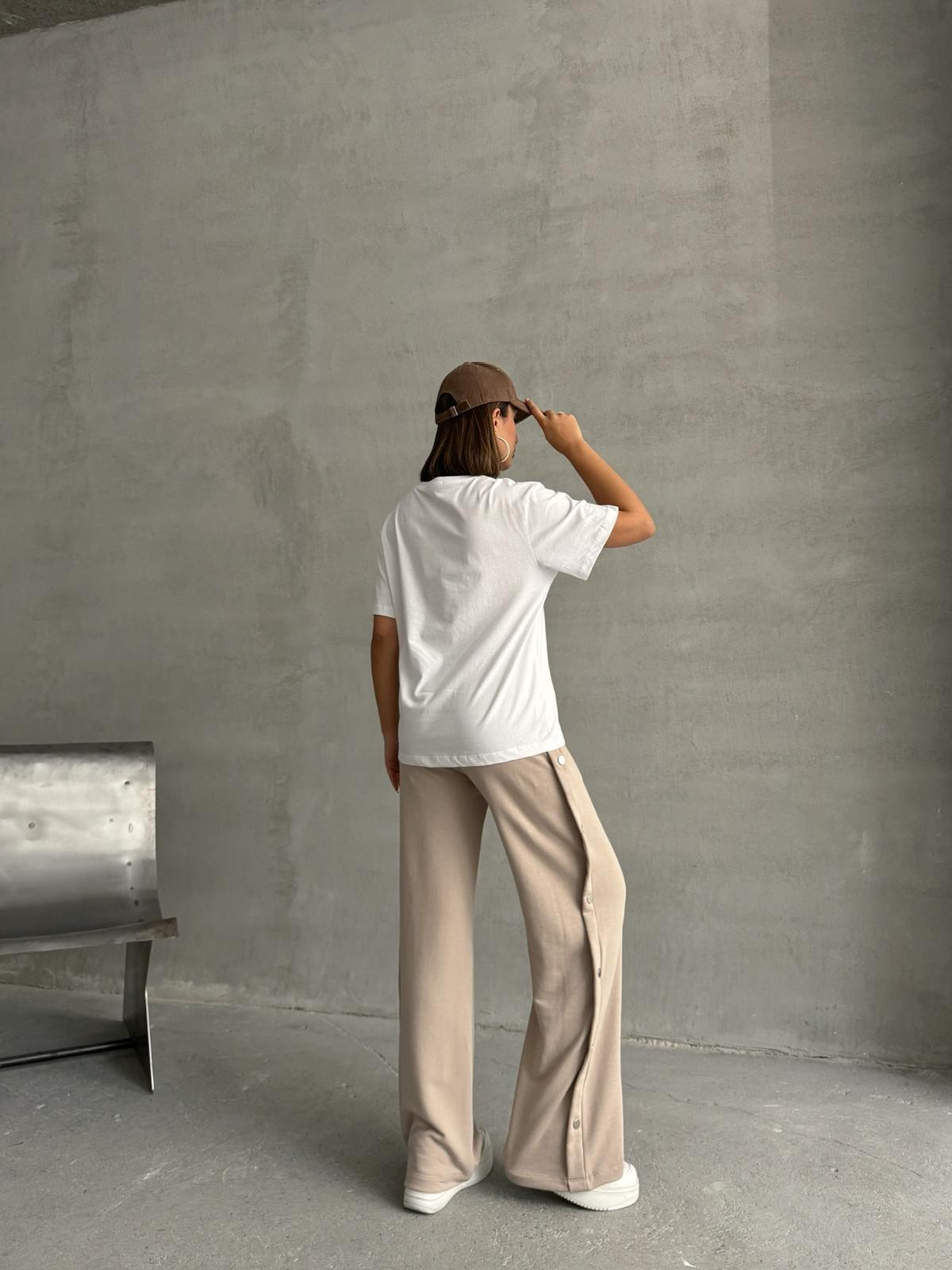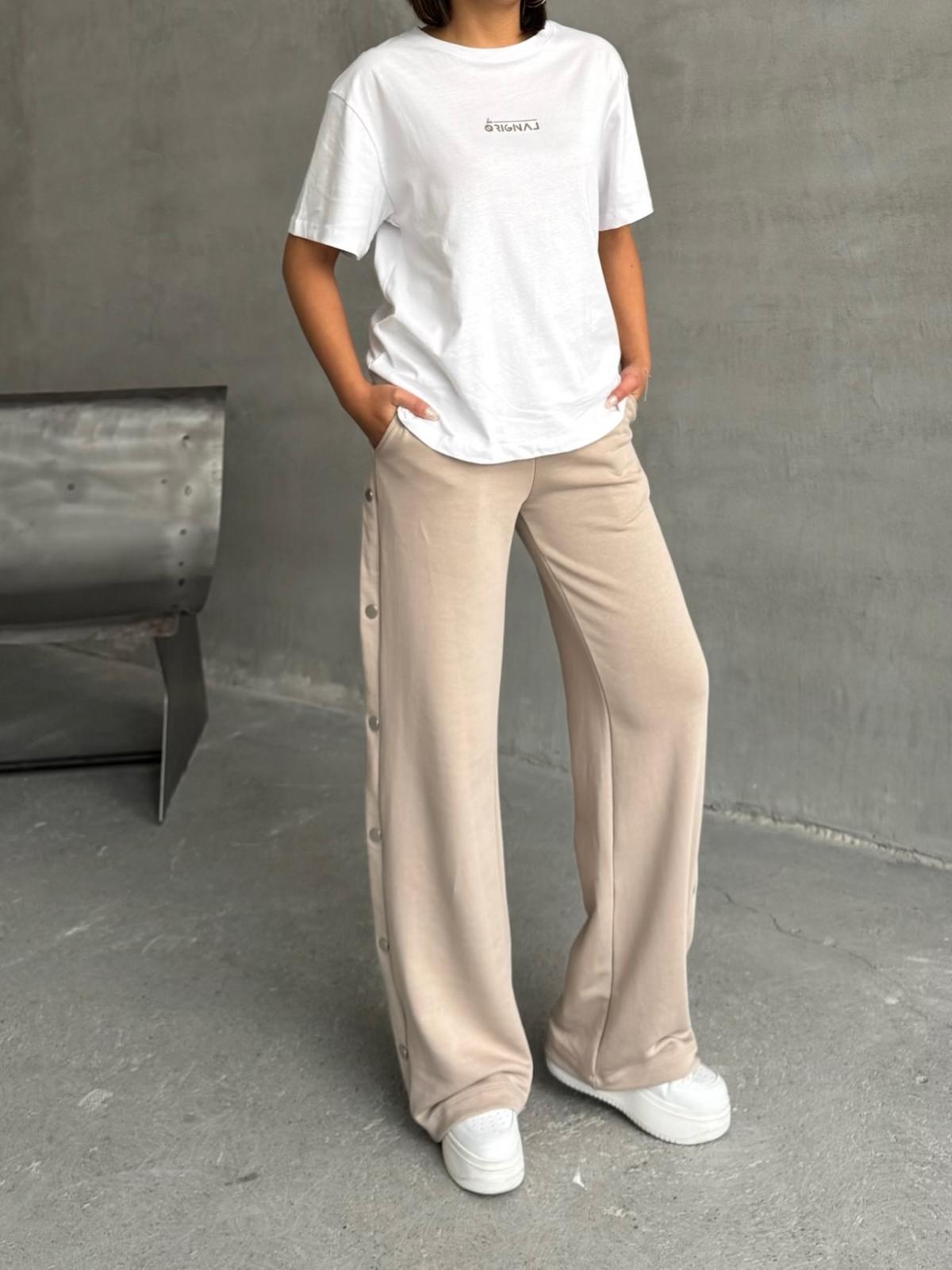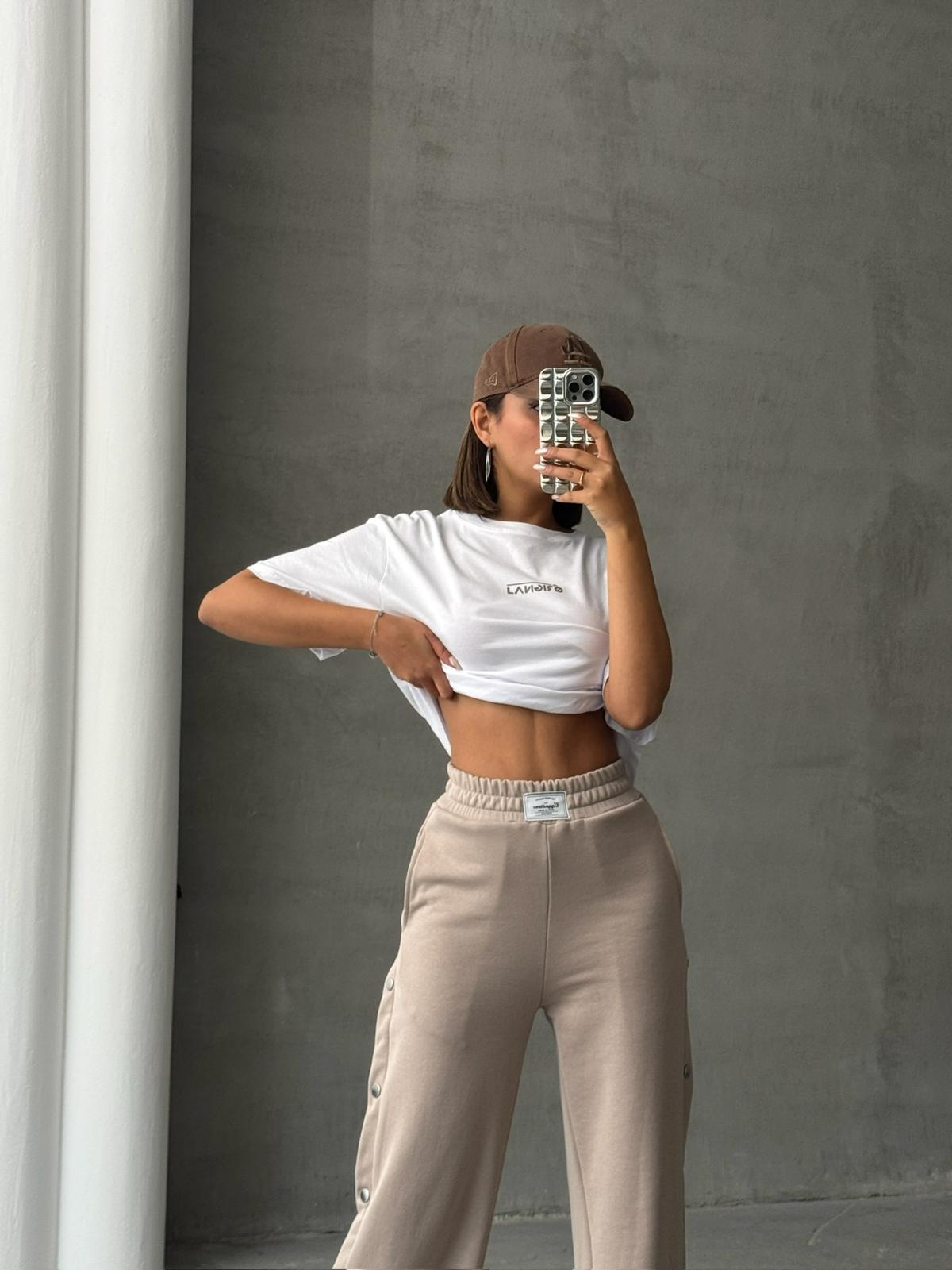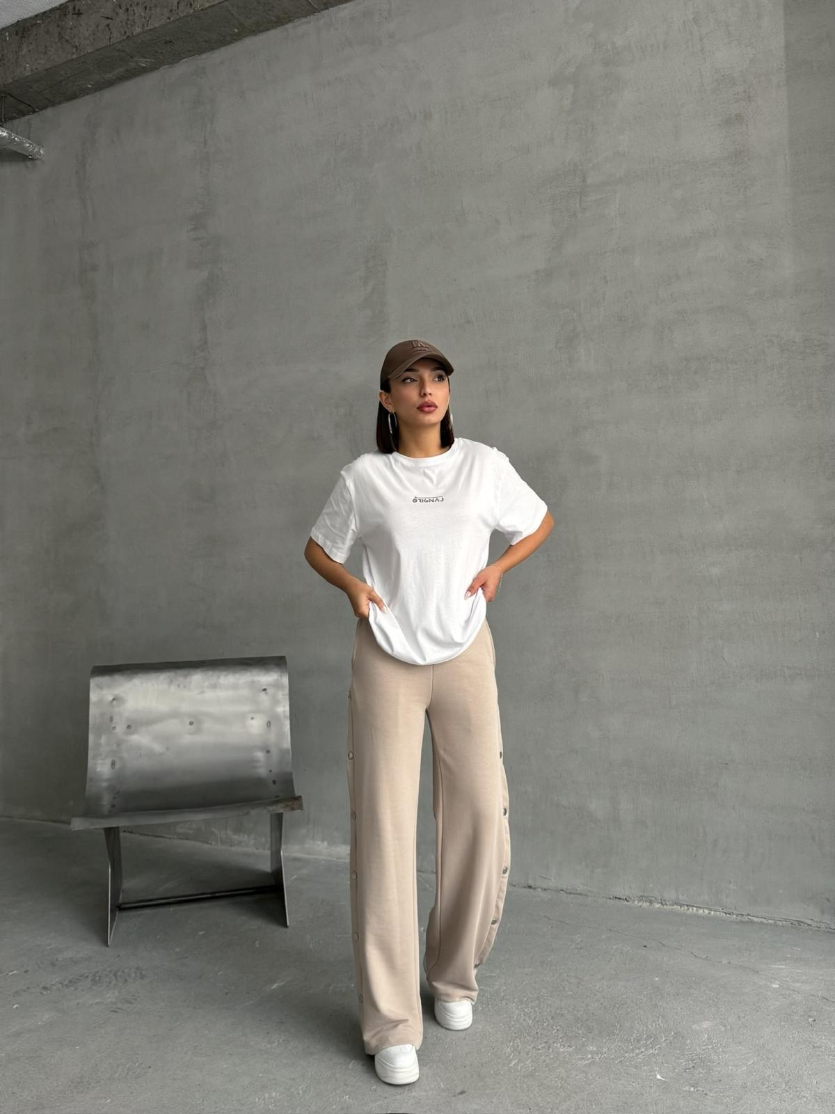TKM-0049 Bej Rengi Orıgnal Yazı Enjeksiyon Baskılı Bisiklet Yaka Tişört Bel Lastikli Etkiket Detay Çıtçıtlı Eşofman İkili Takım