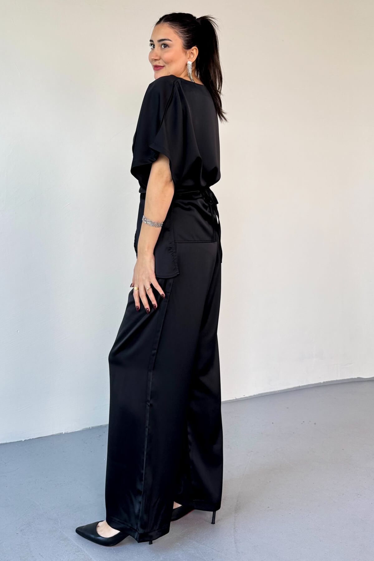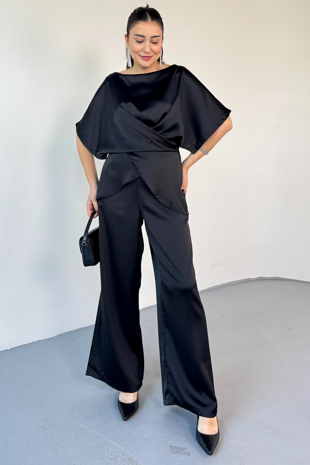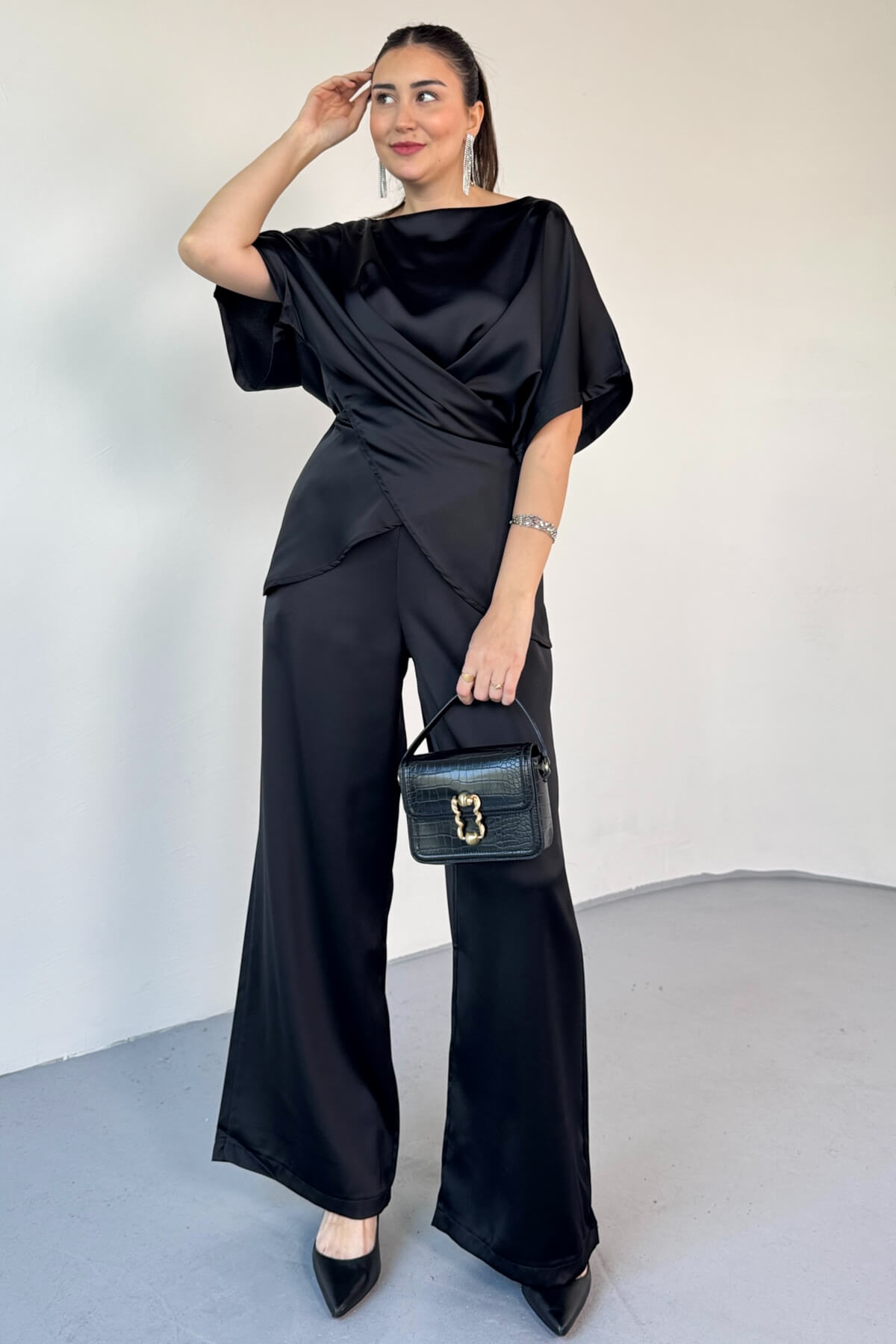 TKM-0298 Siyah Kalın Saten Geniş Yaka Bağlama Detaylı İkili Takım