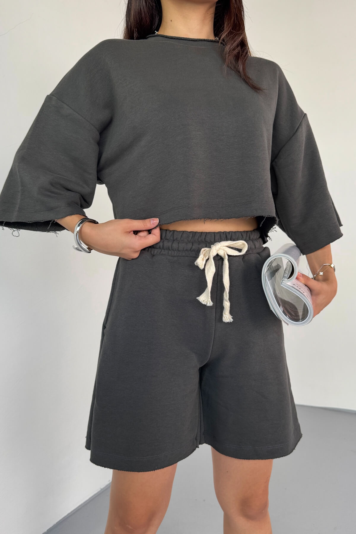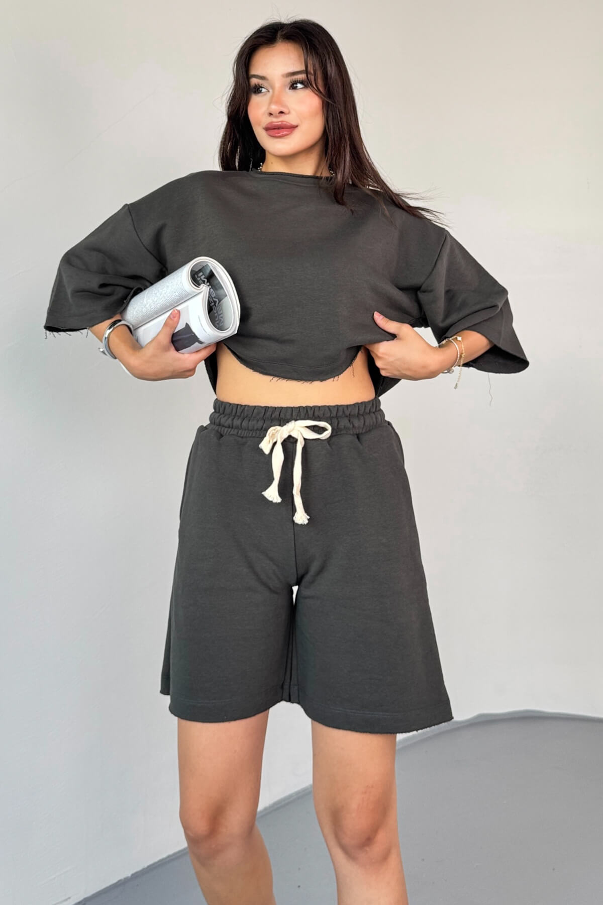 TKM-03598 Füme Rengi Pis Dikişli Kordonlu Crop Şort Takım
