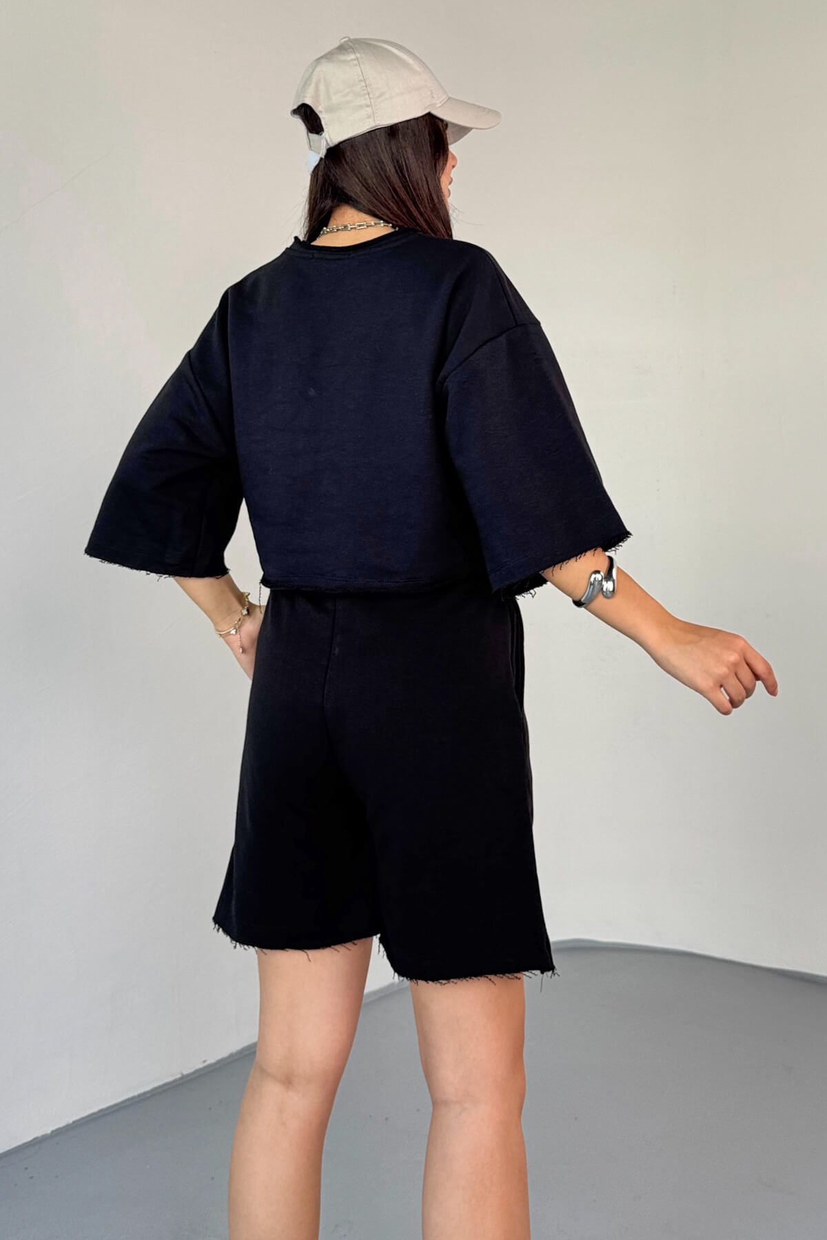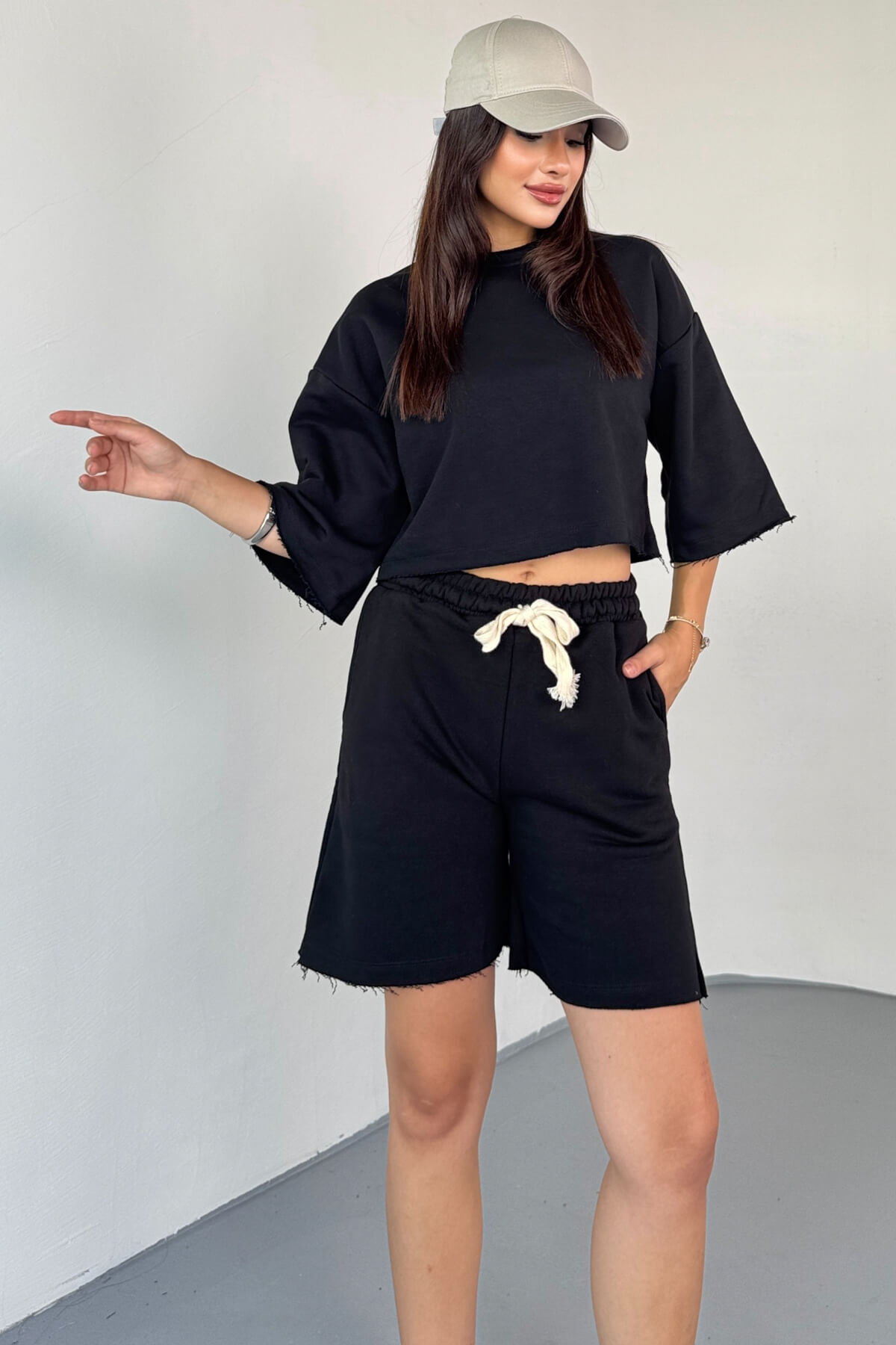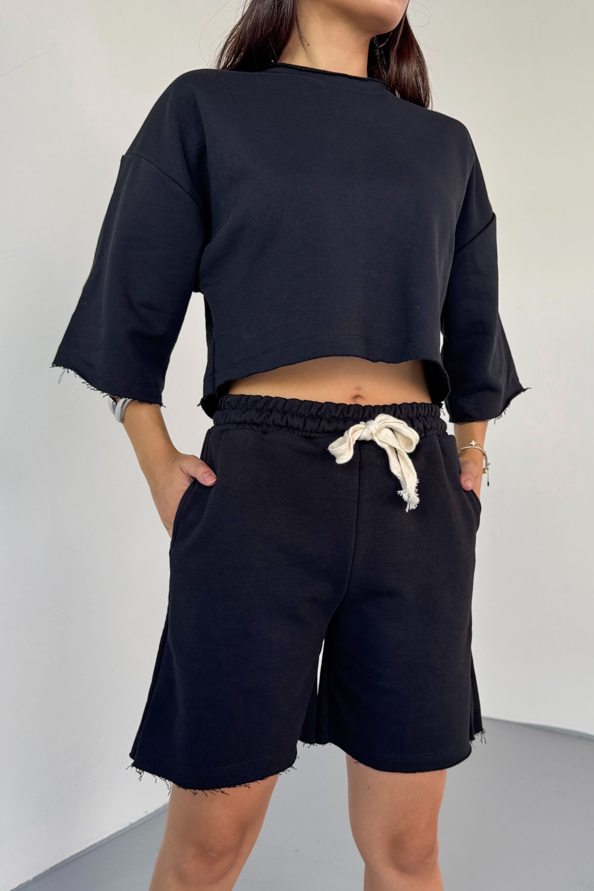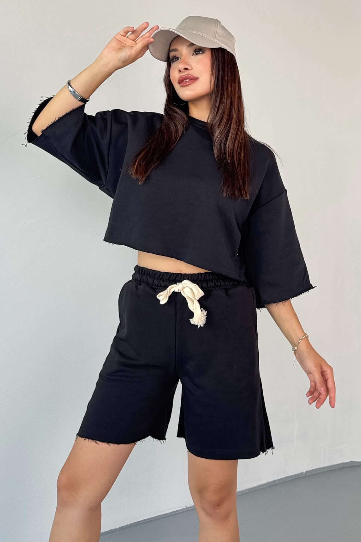 TKM-03598 Siyah Rengi Pis Dikişli Kordonlu Crop Şort Takım