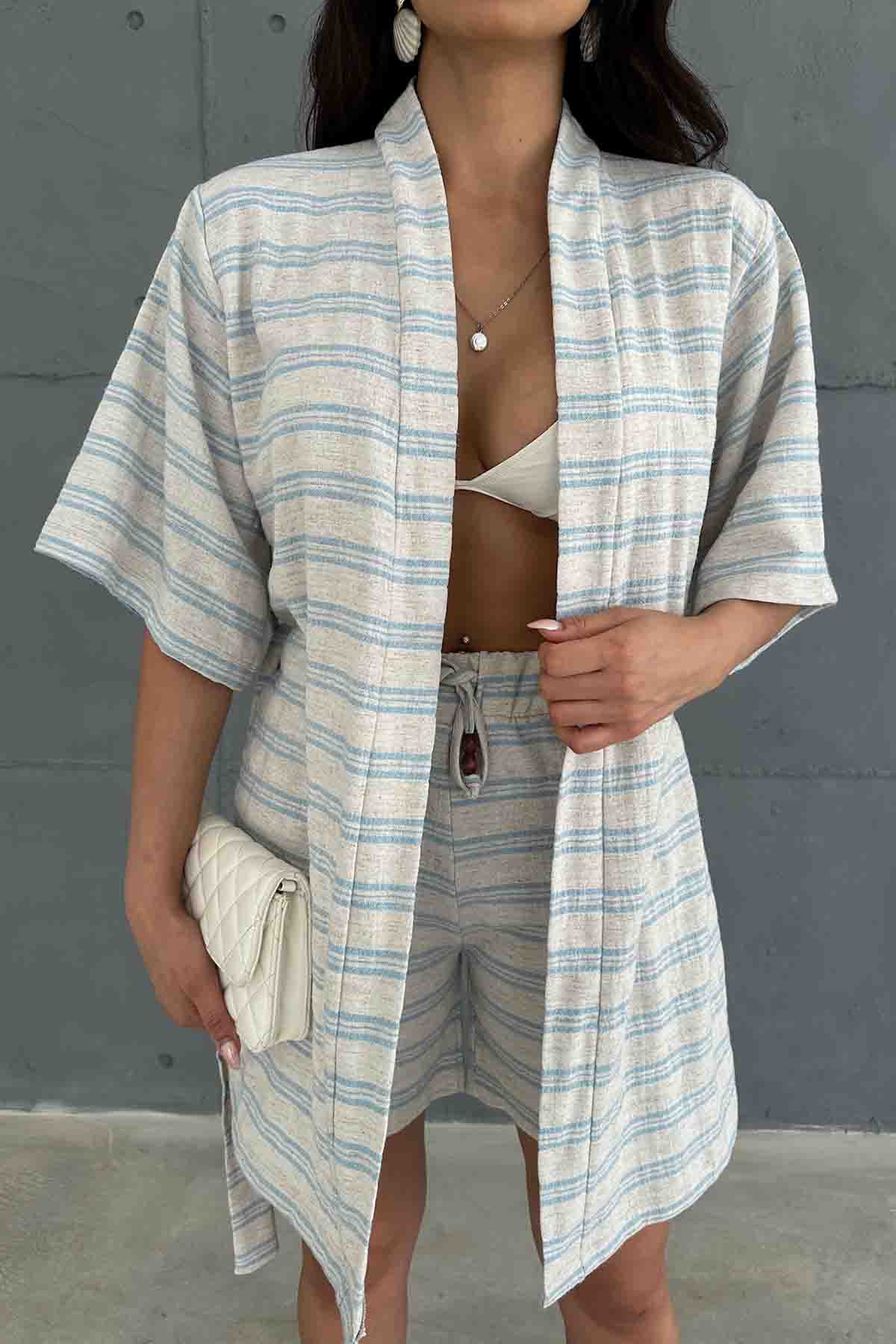 TKM-03618 Mavi Çizgili Keten Kumaş Kuşaklı Kimono Bel Lastikli Şort İkili Takım