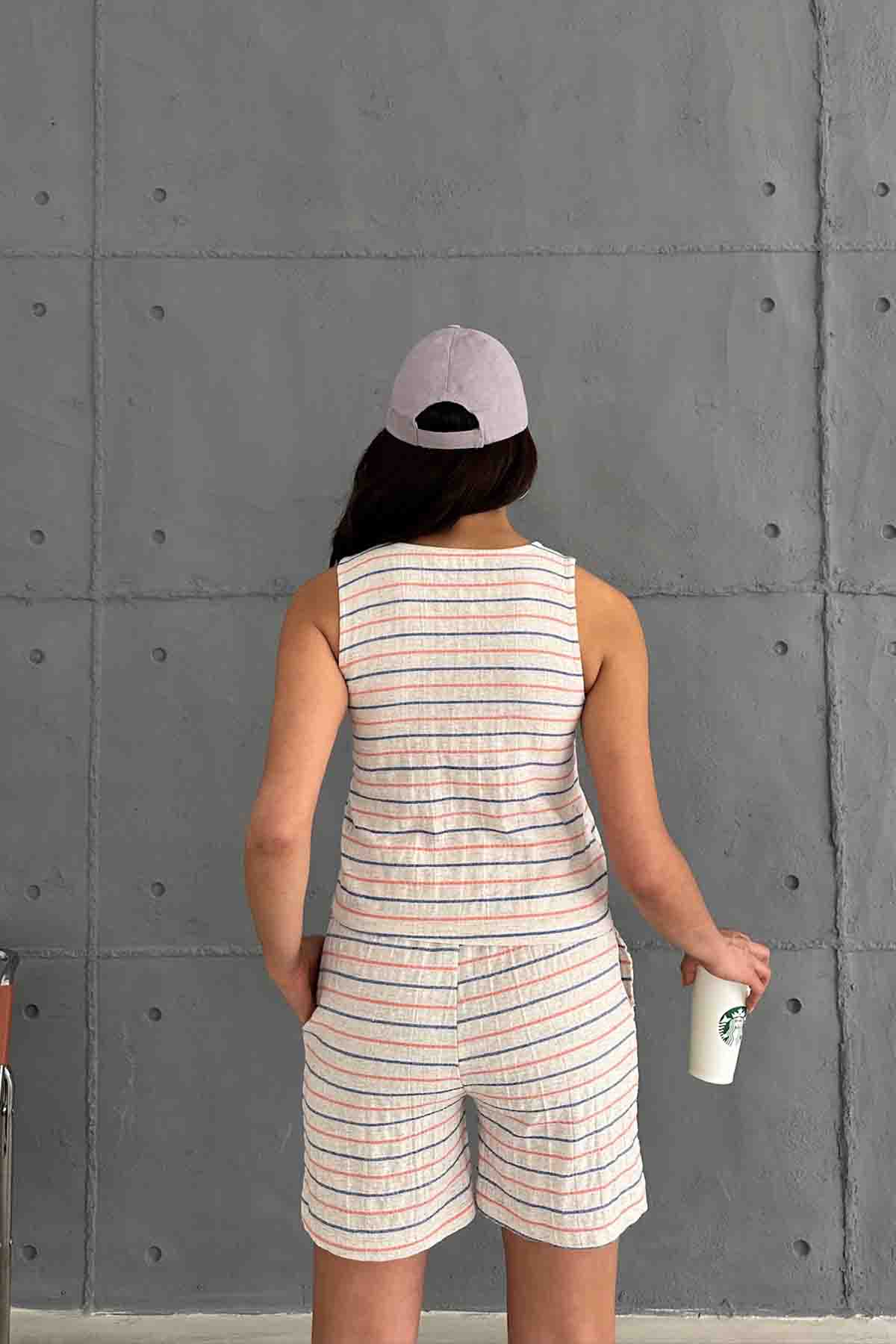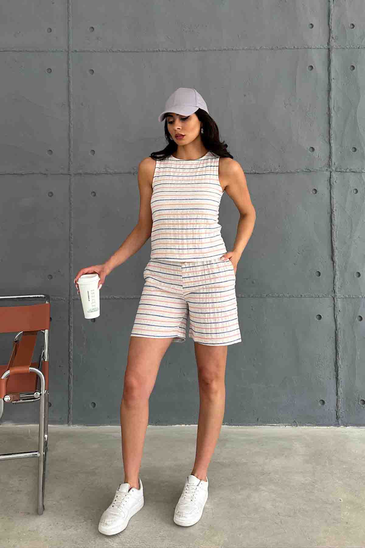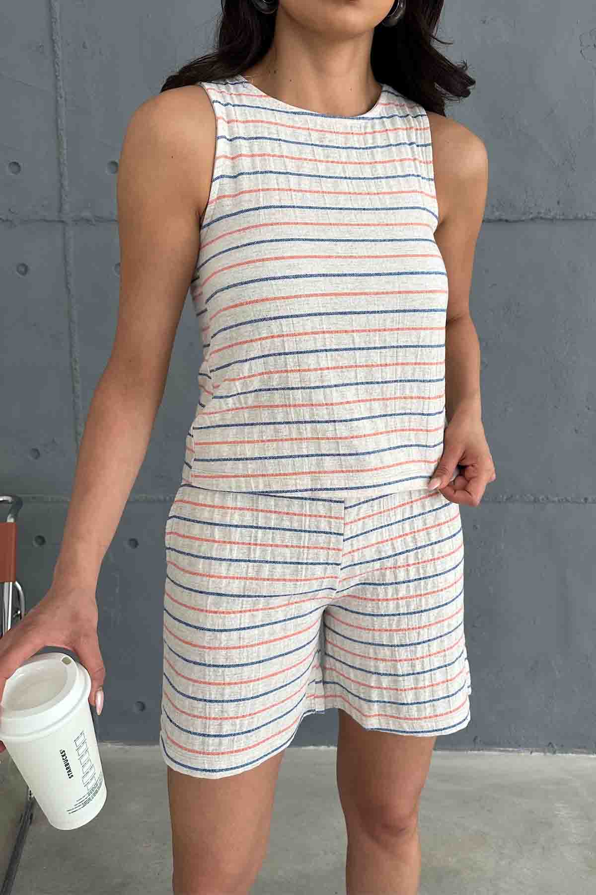 TKM-03619 Turuncu Çizgili Keten Kumaş Yuvarlak Yaka Bluz Bağlamalı Şort İkili Takım