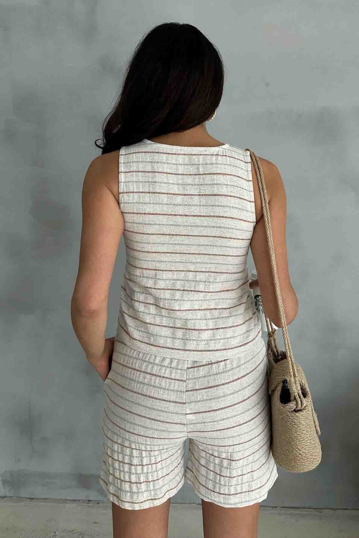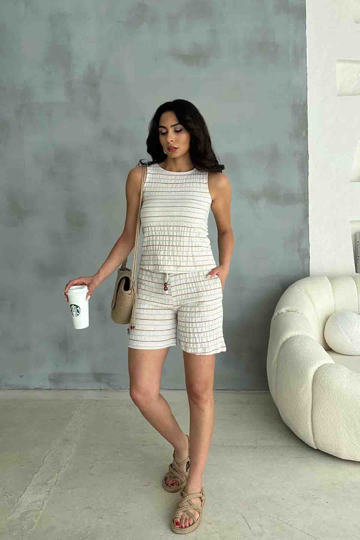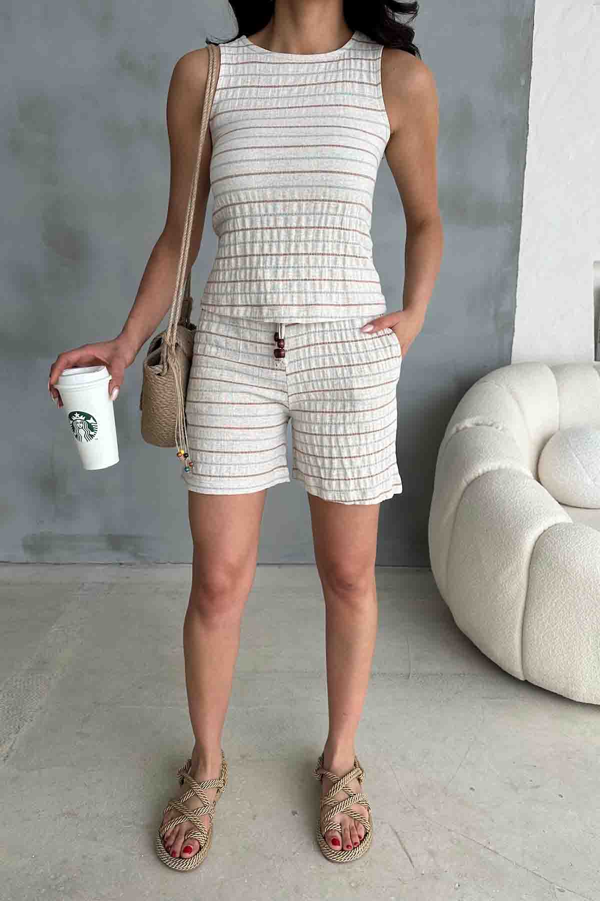 TKM-03619 Vizon Çizgili Keten Kumaş Yuvarlak Yaka Bluz Bağlamalı Şort İkili Takım