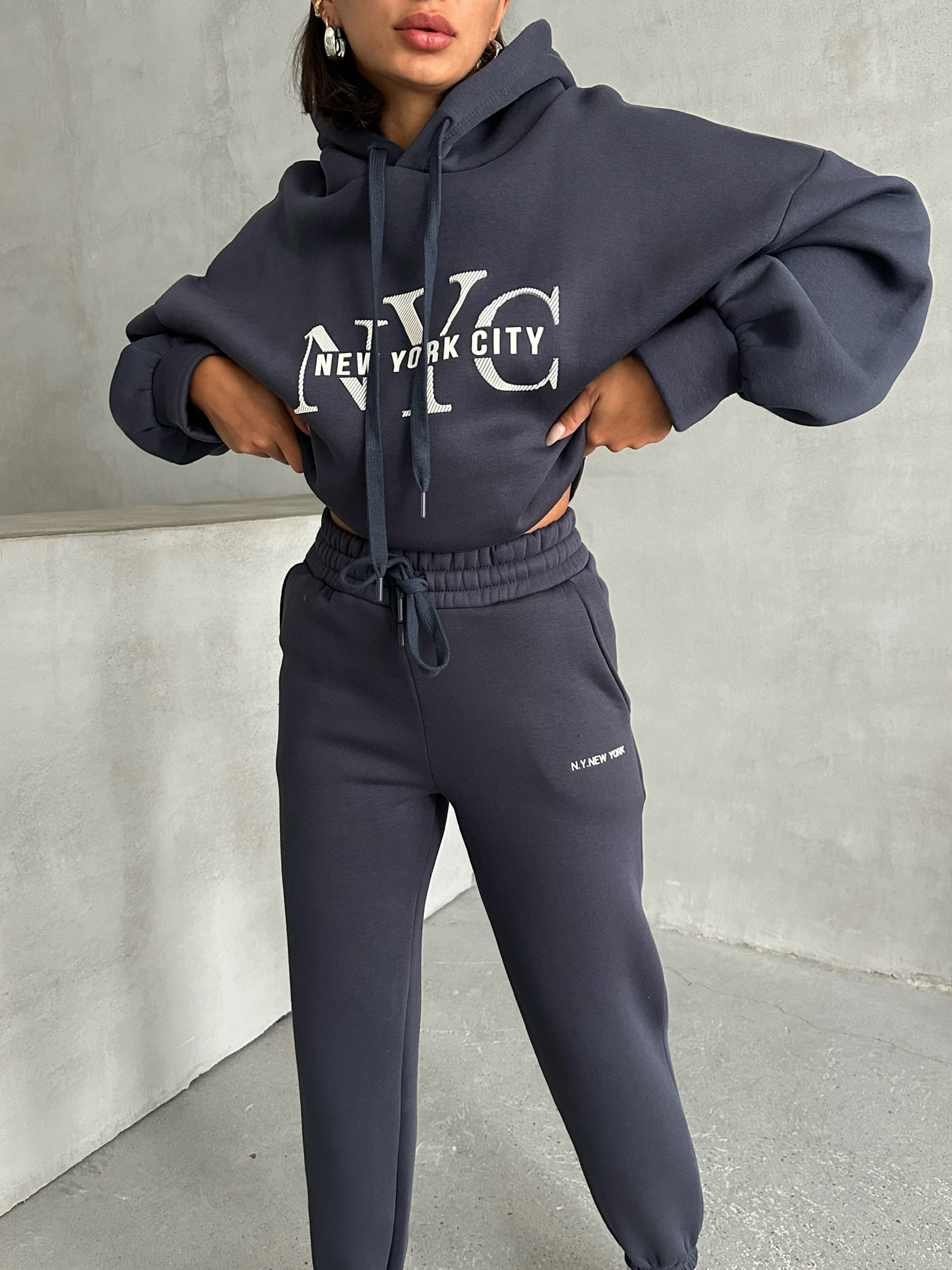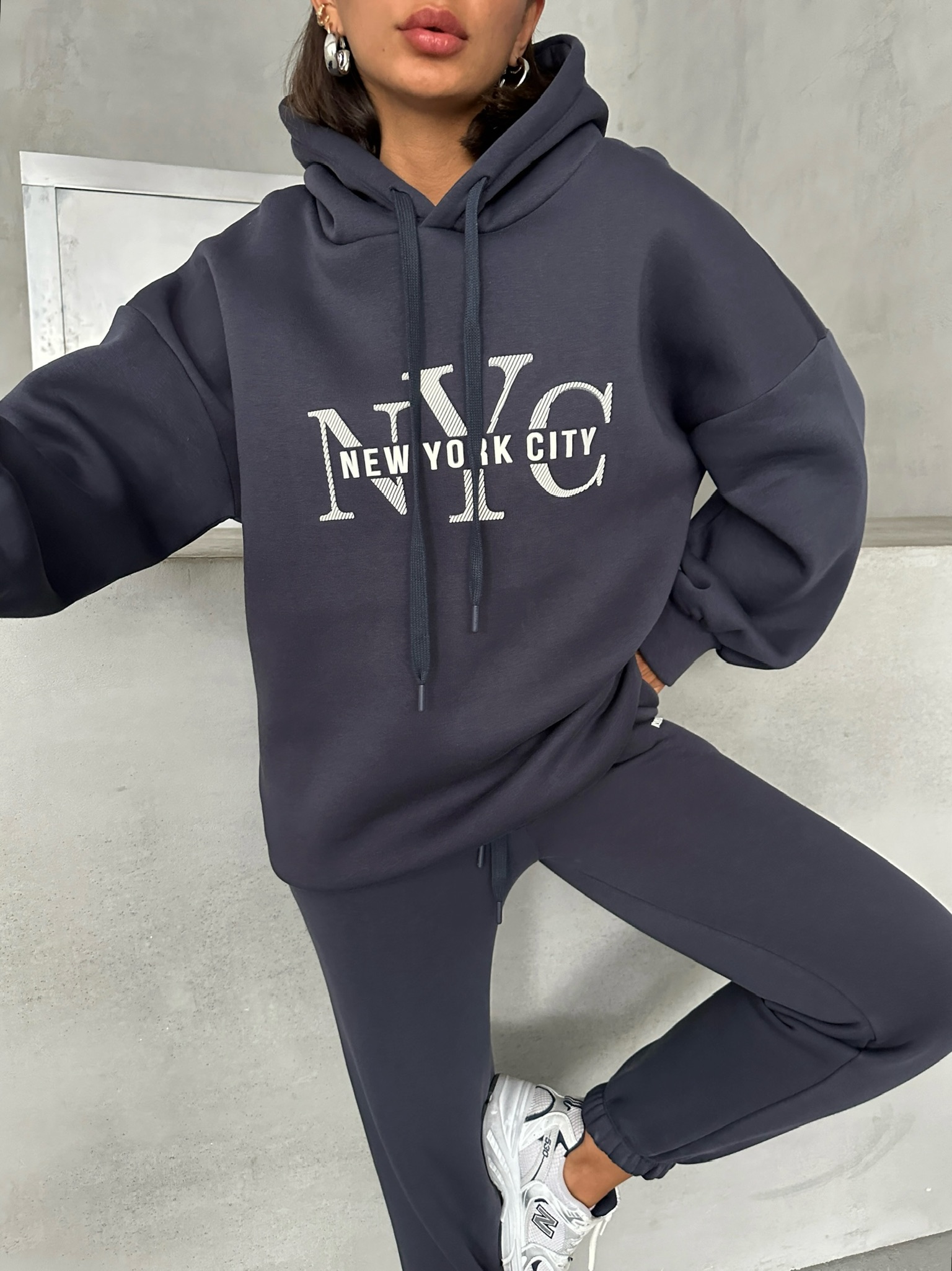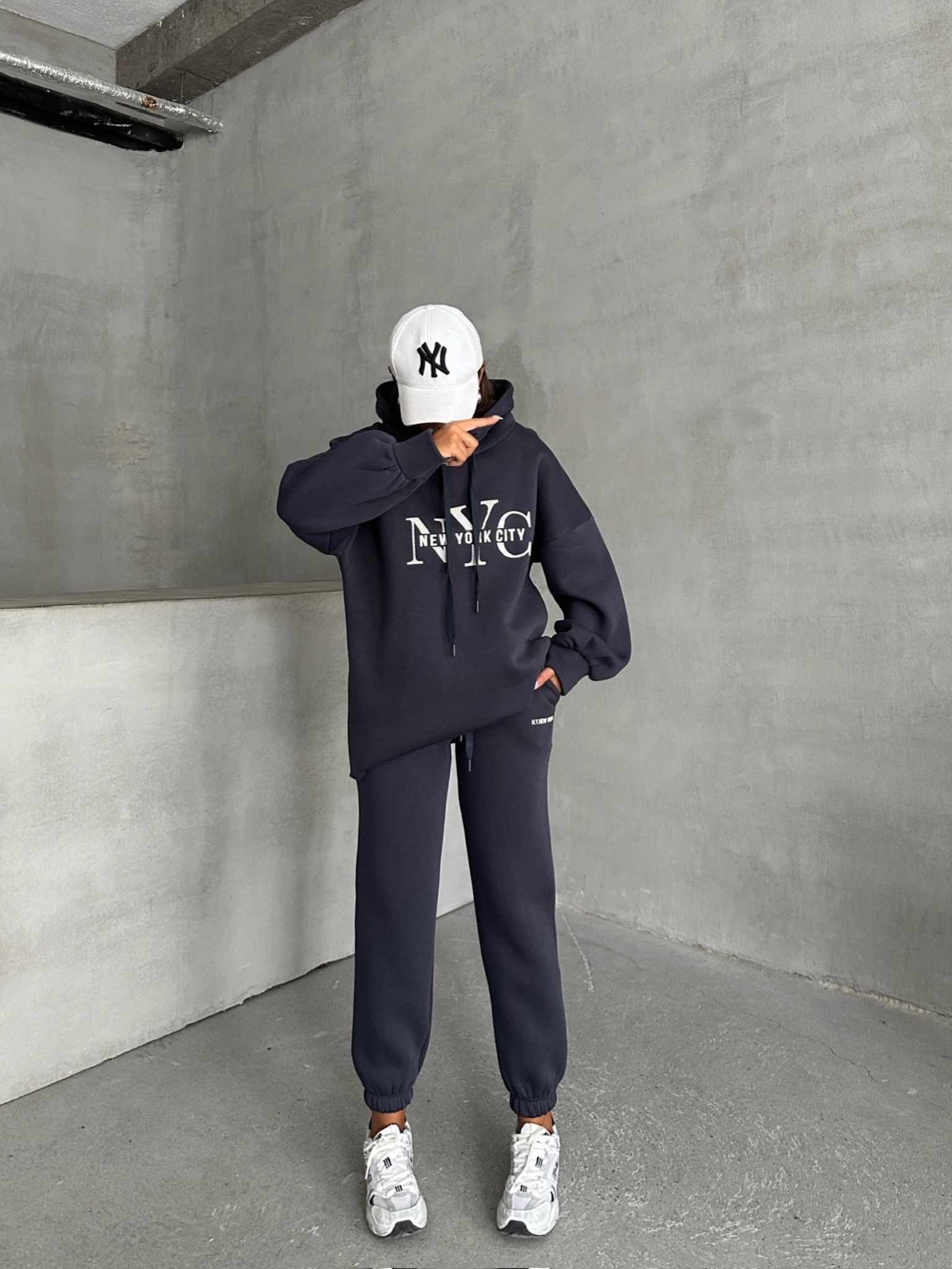 TKM-03631 Füme New York City Kabartma Baskılı Salaş Kapüşonlu Sweatshirt Jogger Eşofman İkili Takım