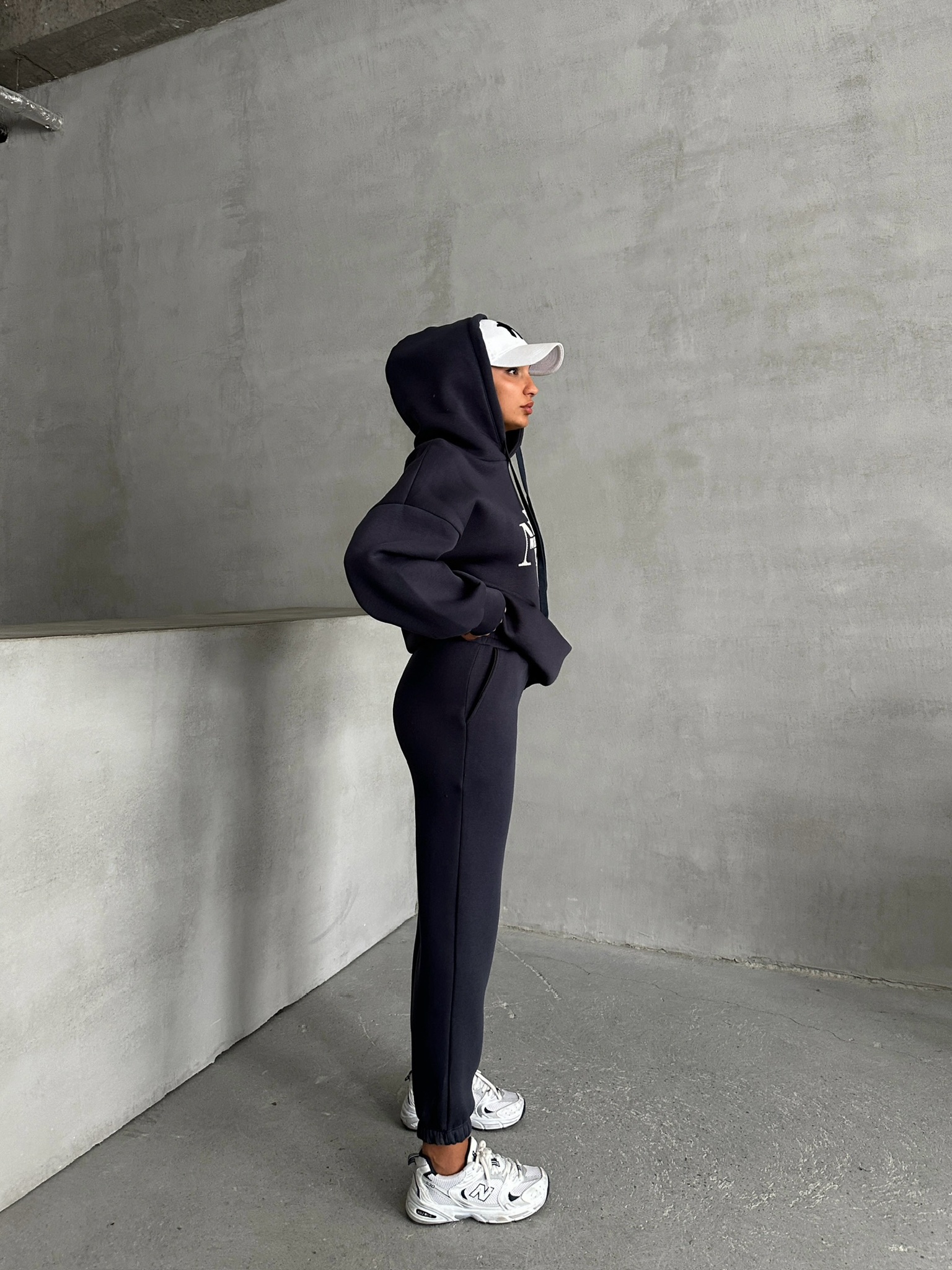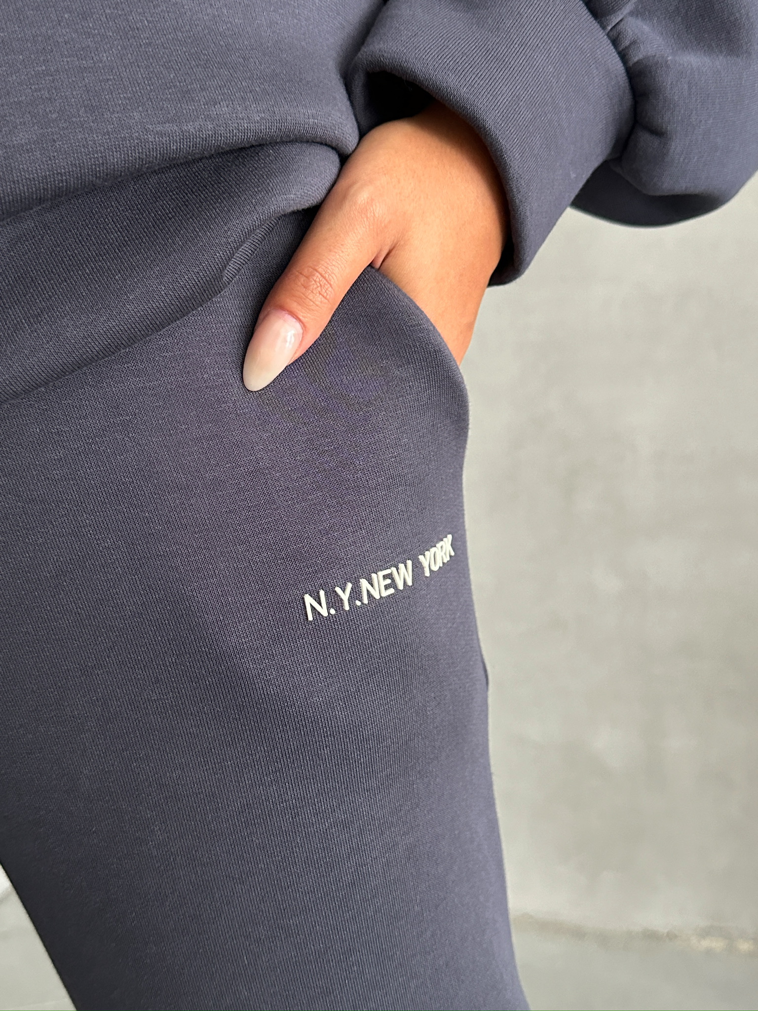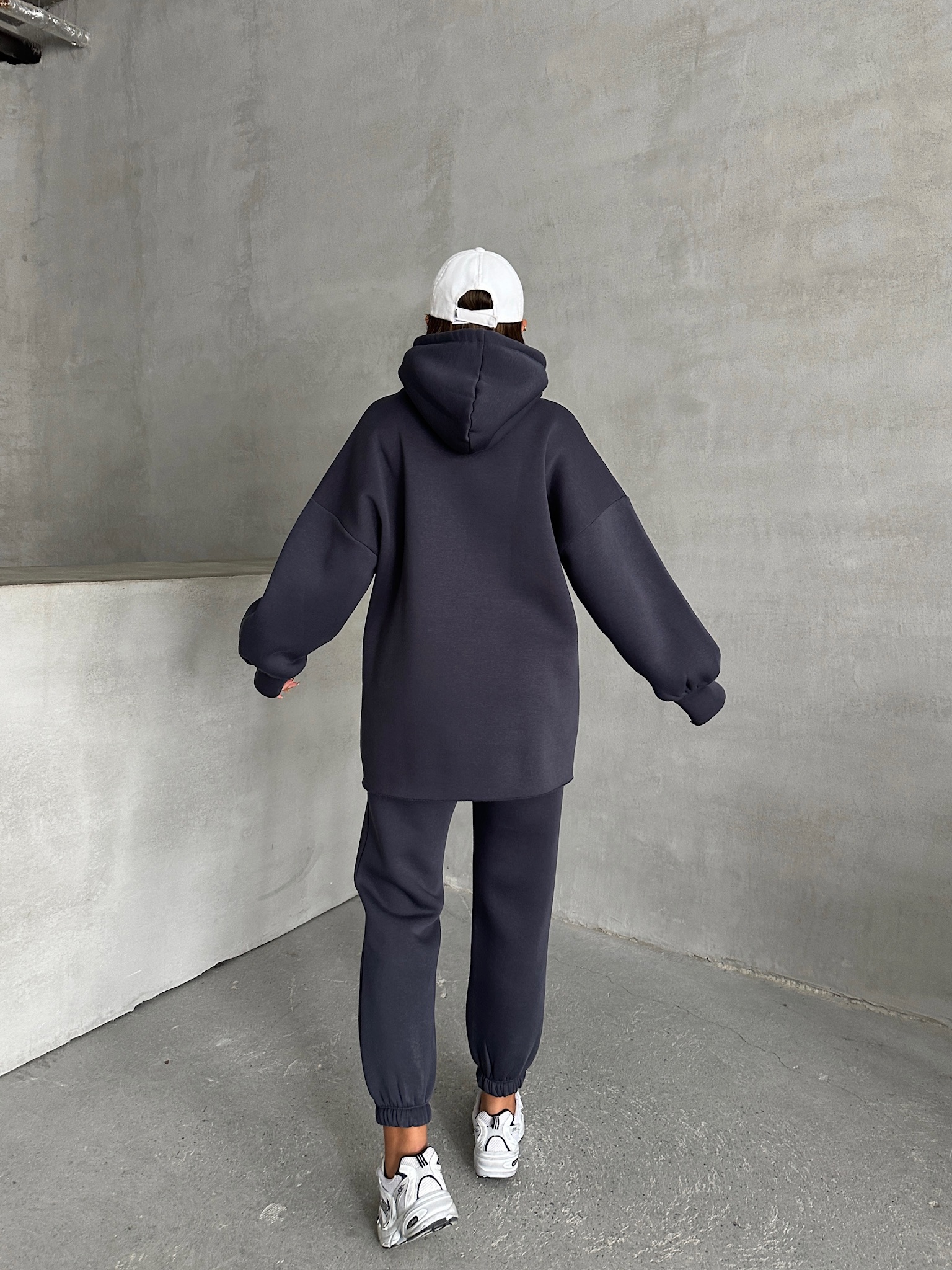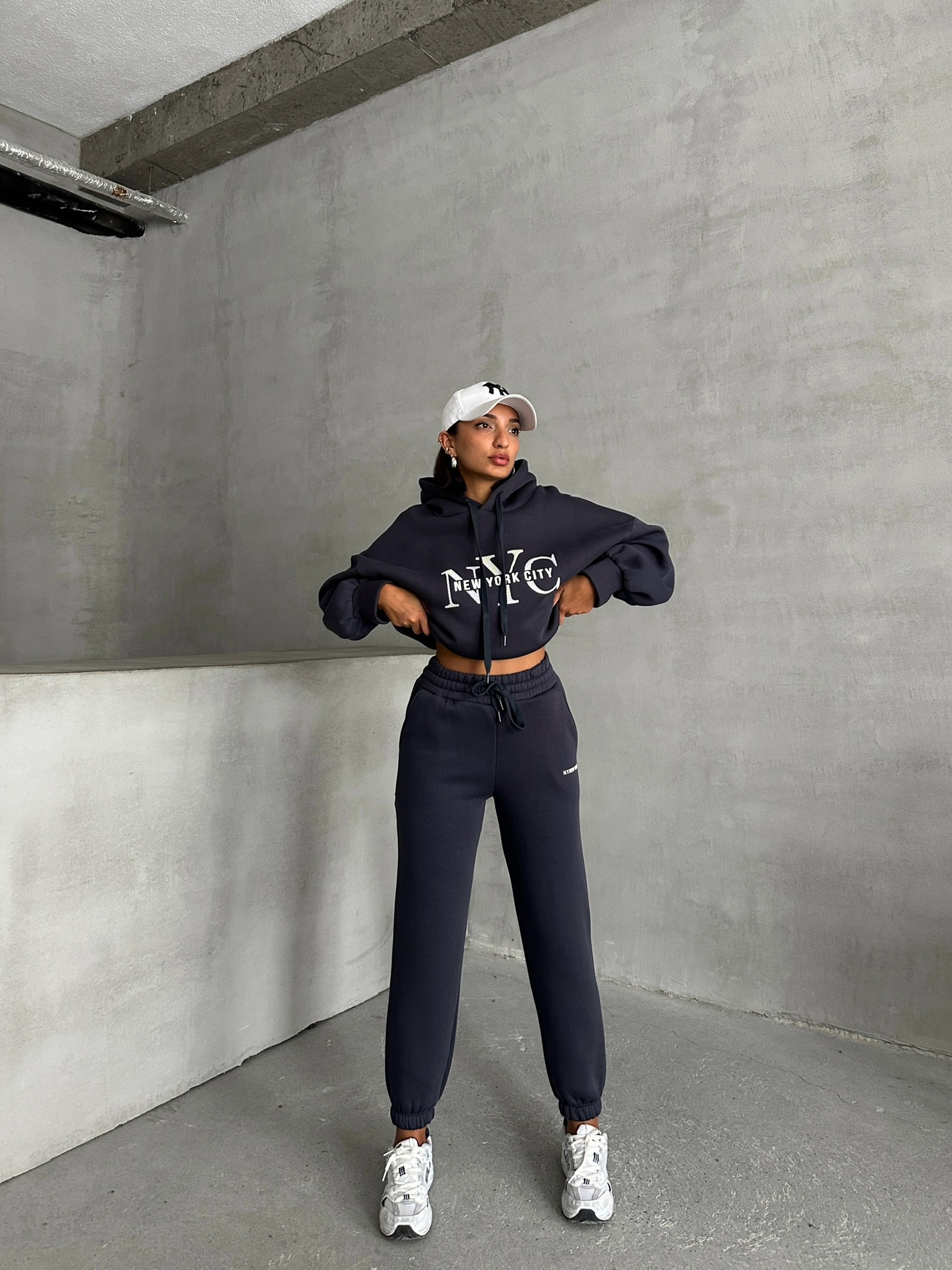 TKM-03631 Füme New York City Kabartma Baskılı Salaş Kapüşonlu Sweatshirt Jogger Eşofman İkili Takım