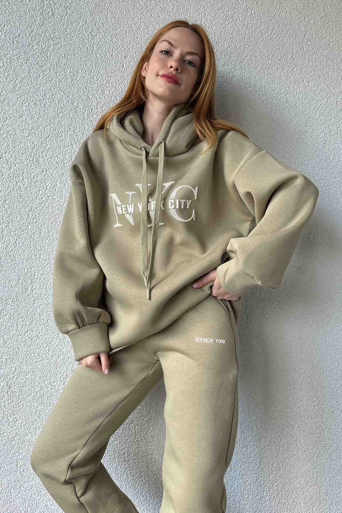 TKM-03631 Haki New York City Kabartma Baskılı Salaş Kapüşonlu Sweatshirt Jogger Eşofman İkili Takım