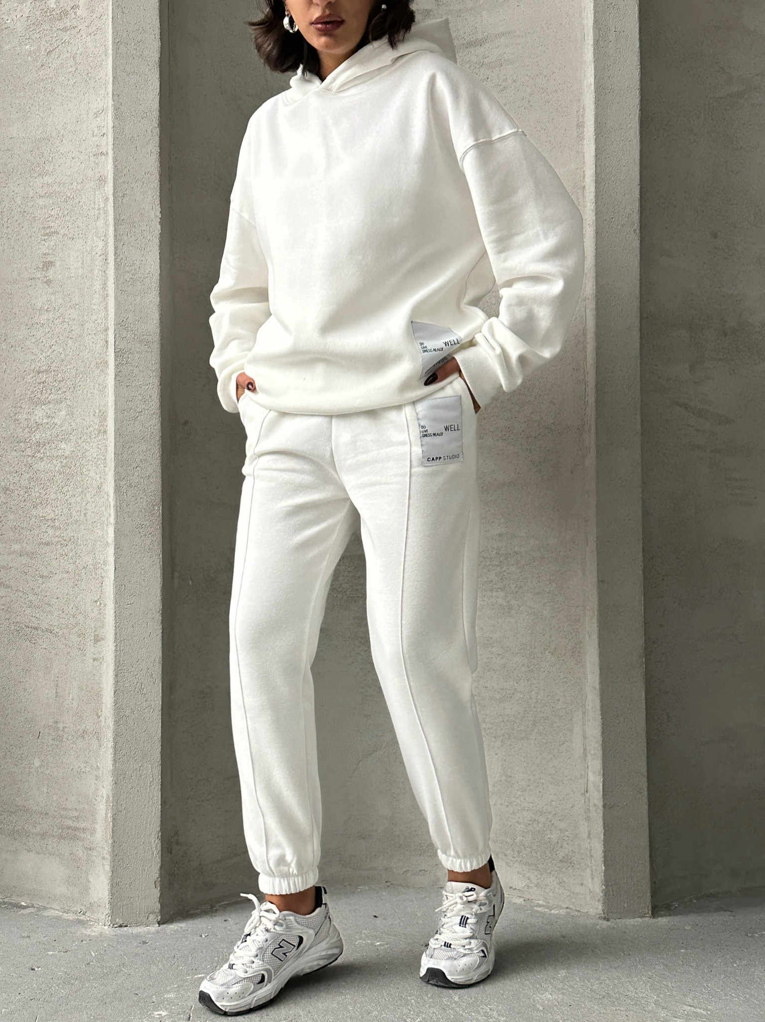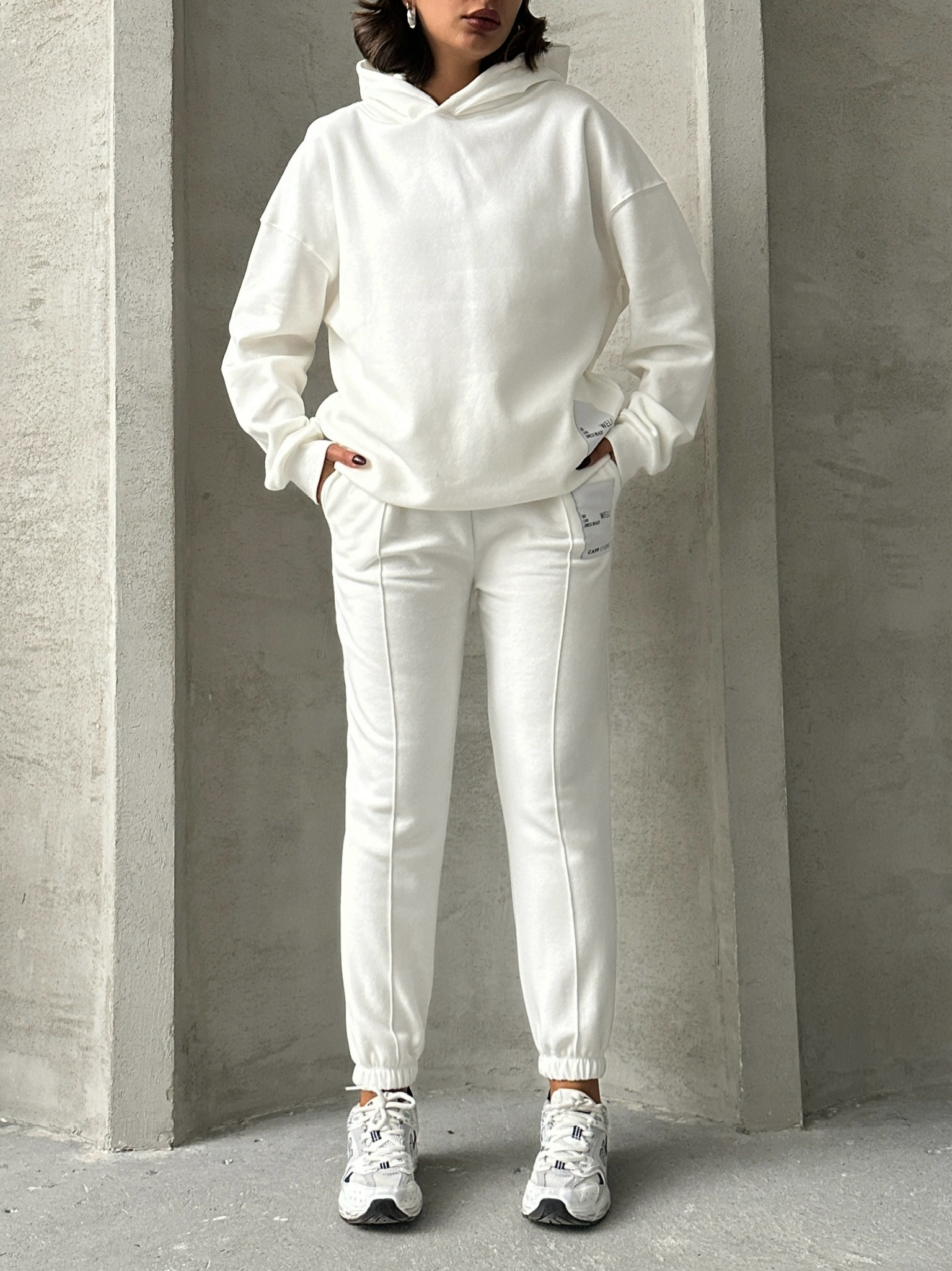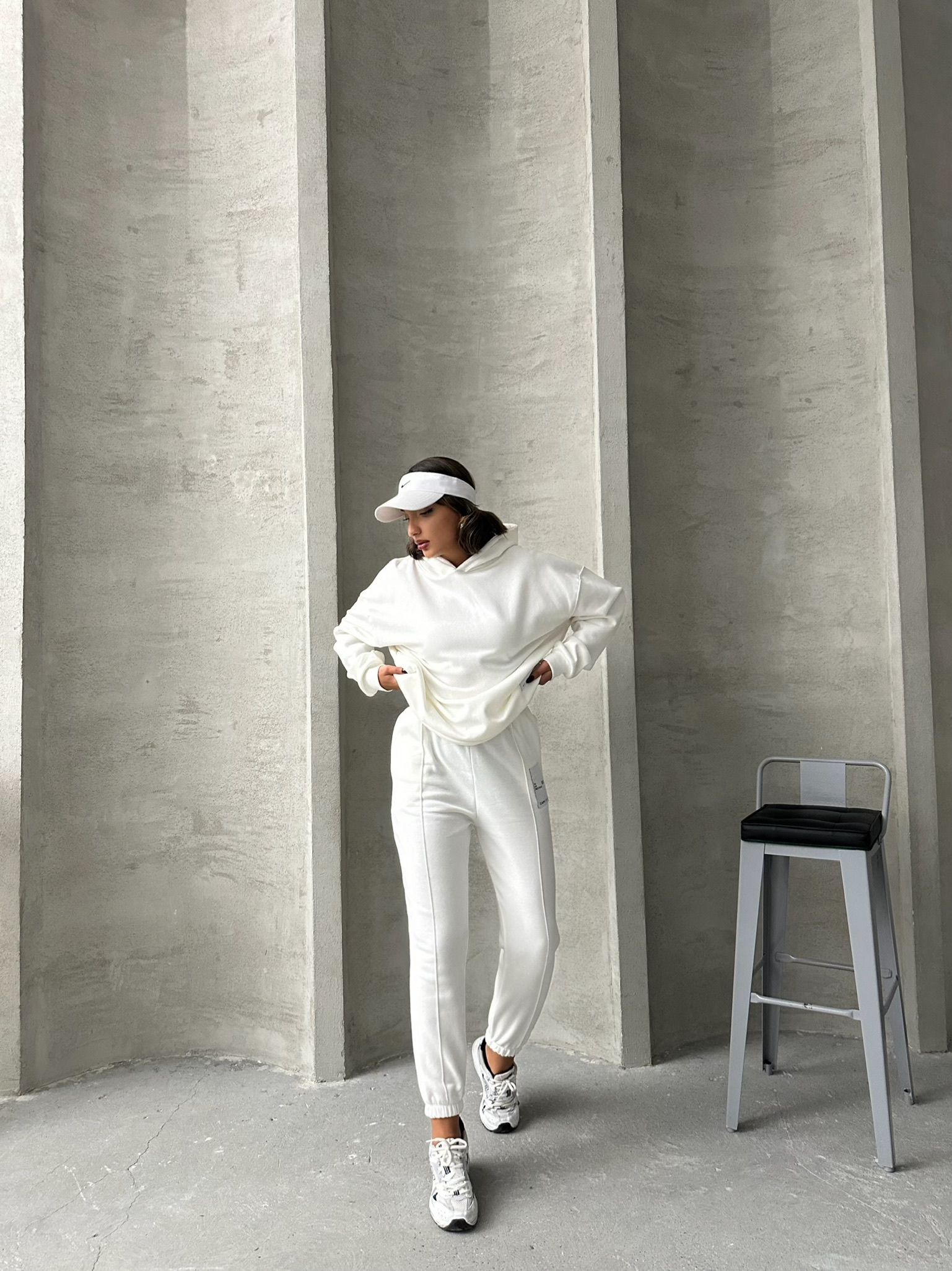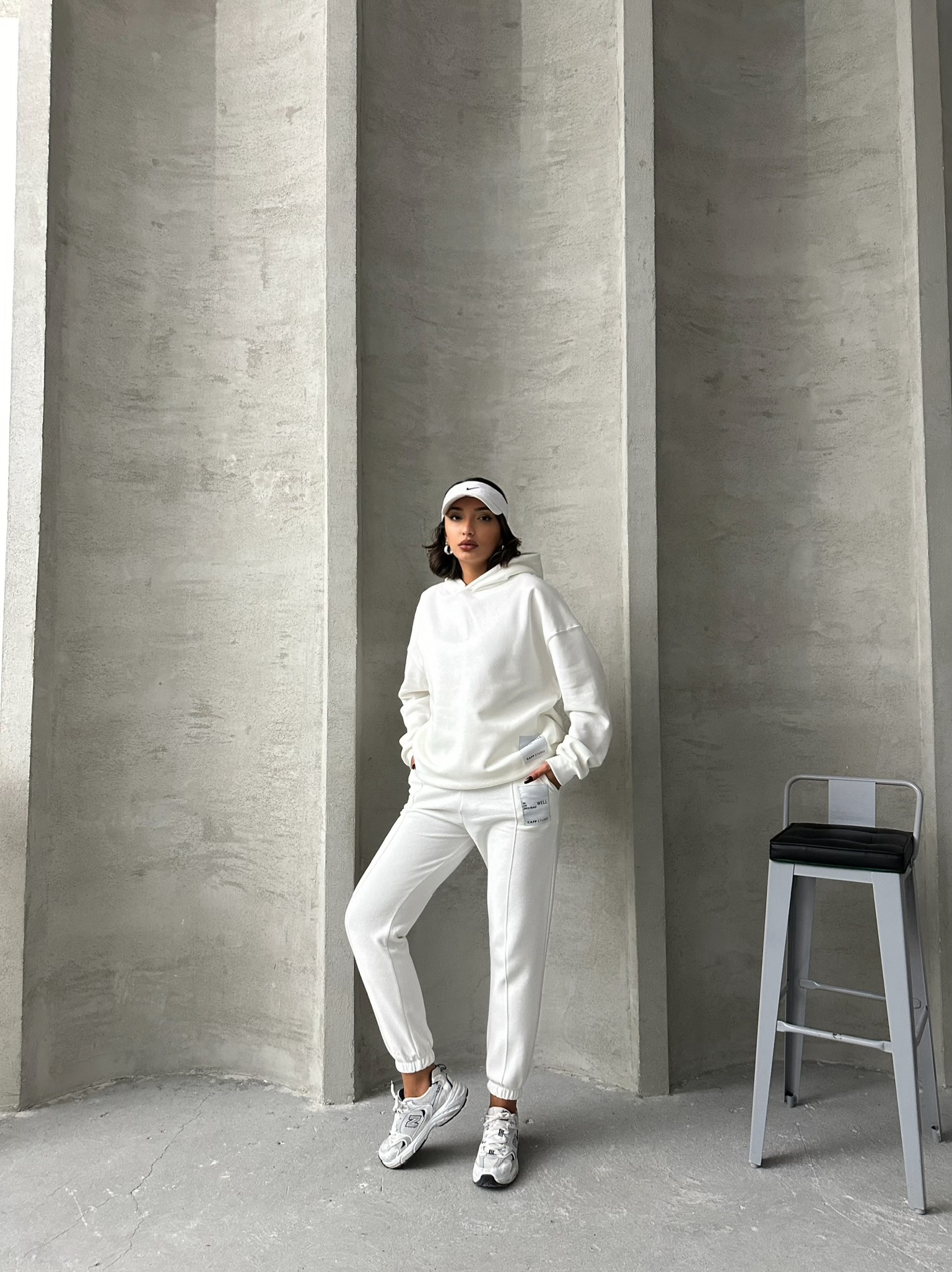 TKM-03634 Beyaz Etiket Detaylı Kapüşonlu Sweatshirt Çimalı Jogger İki İplik Şardonlu İkili Takım