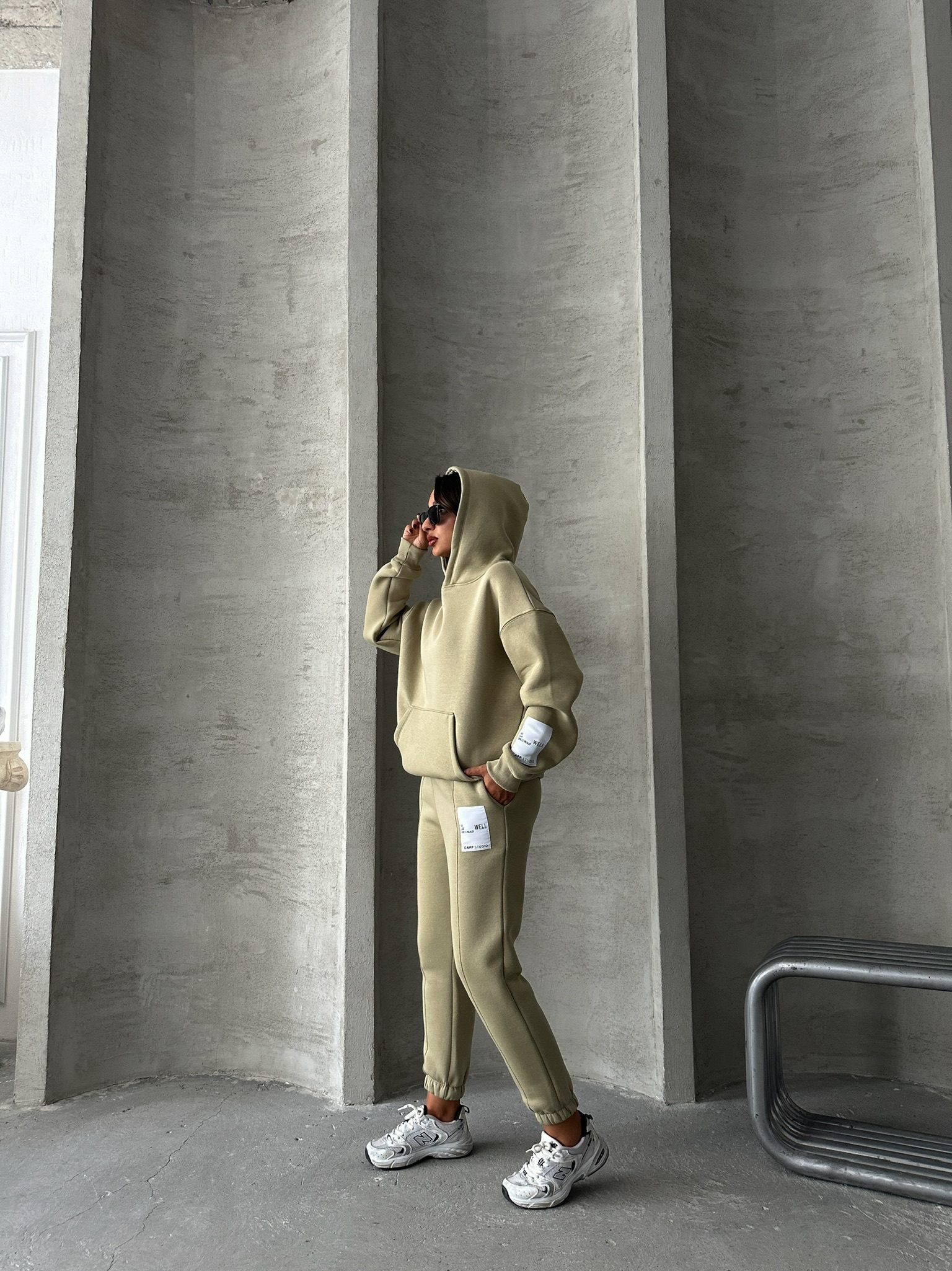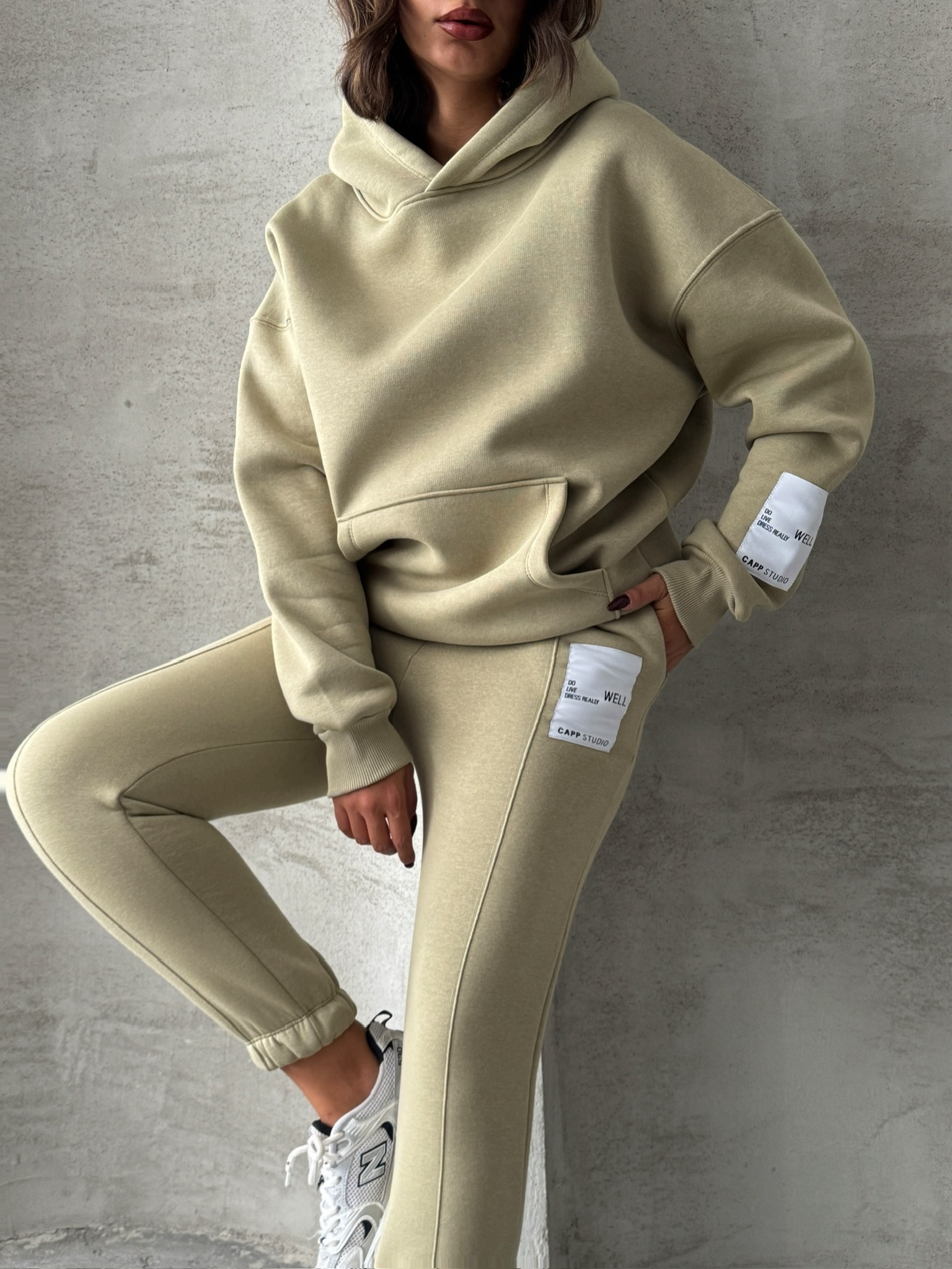 TKM-03637 Haki Etiket Detaylı Kapüşonlu Sweatshirt Çimalı Eşofman Üç İplik Şardonlu İkili Takım