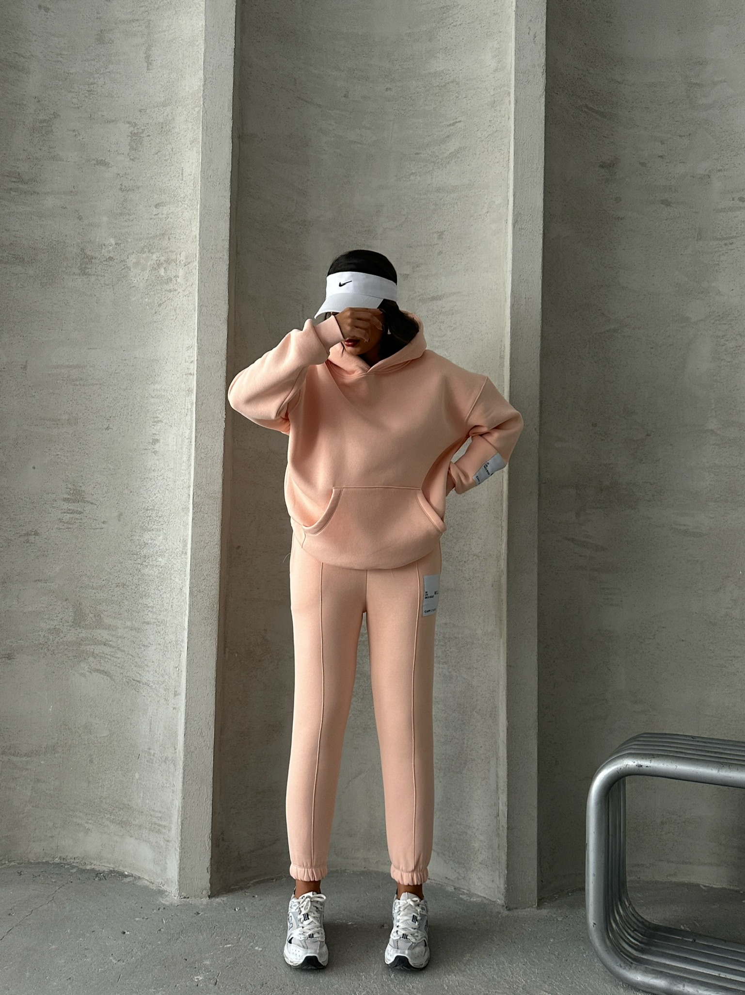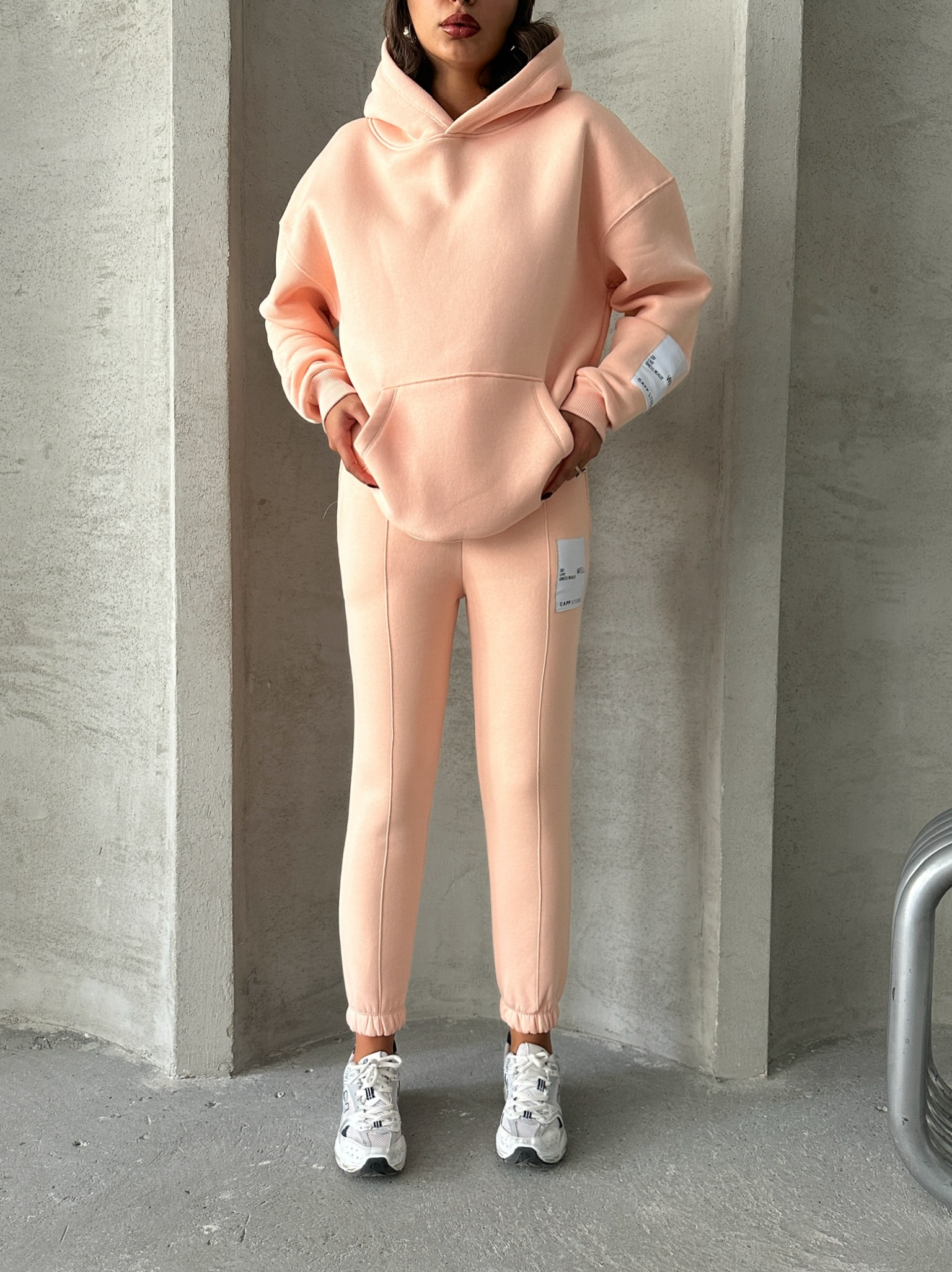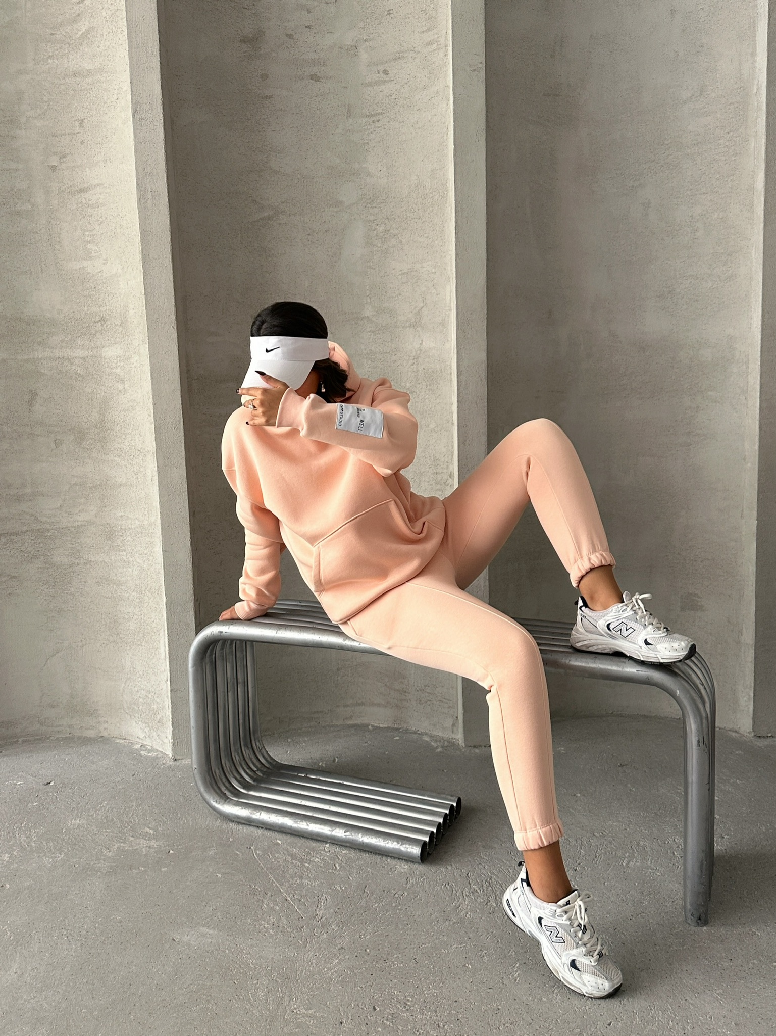 TKM-03637 Pudra Etiket Detaylı Kapüşonlu Sweatshirt Çimalı Eşofman Üç İplik Şardonlu İkili Takım