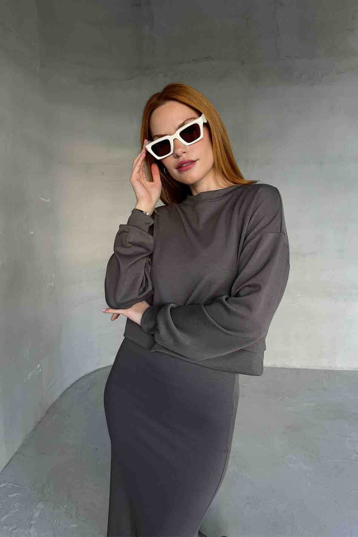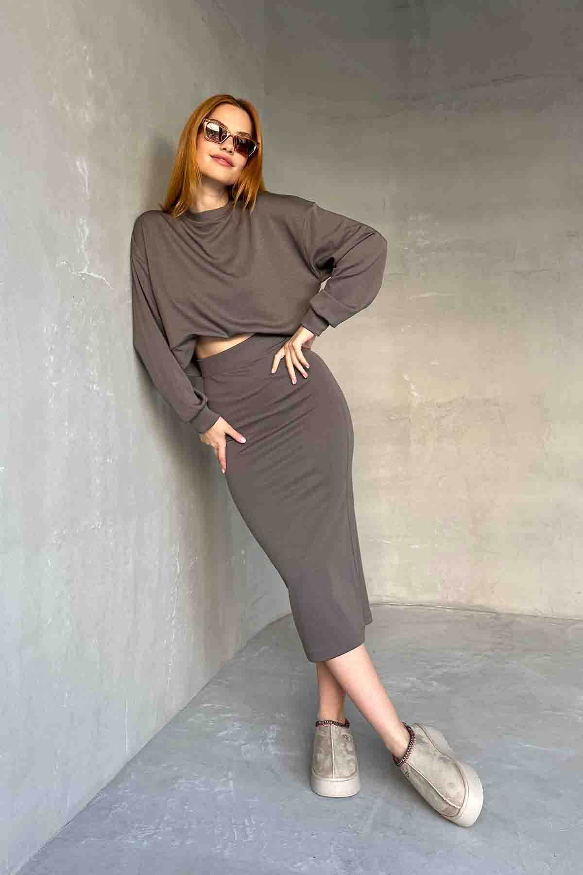 Üst salaş crop modeldir. Alt yüksek beldir. Etek boyu 80 cm'dir.