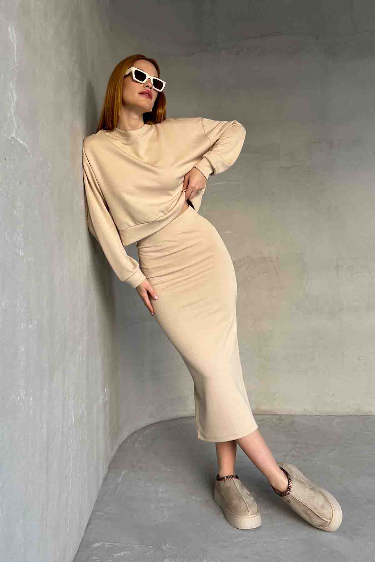Üst salaş crop modeldir. Alt yüksek beldir. Etek boyu 80 cm'dir.