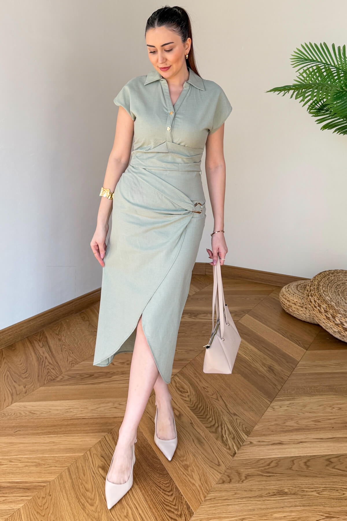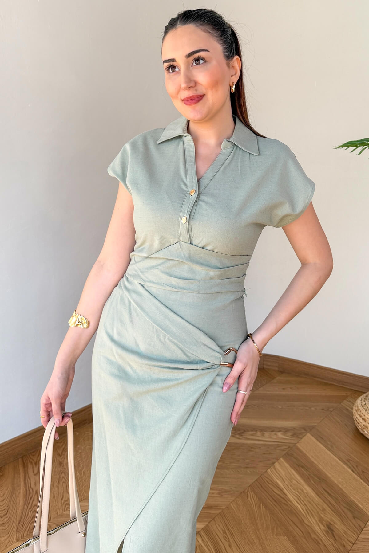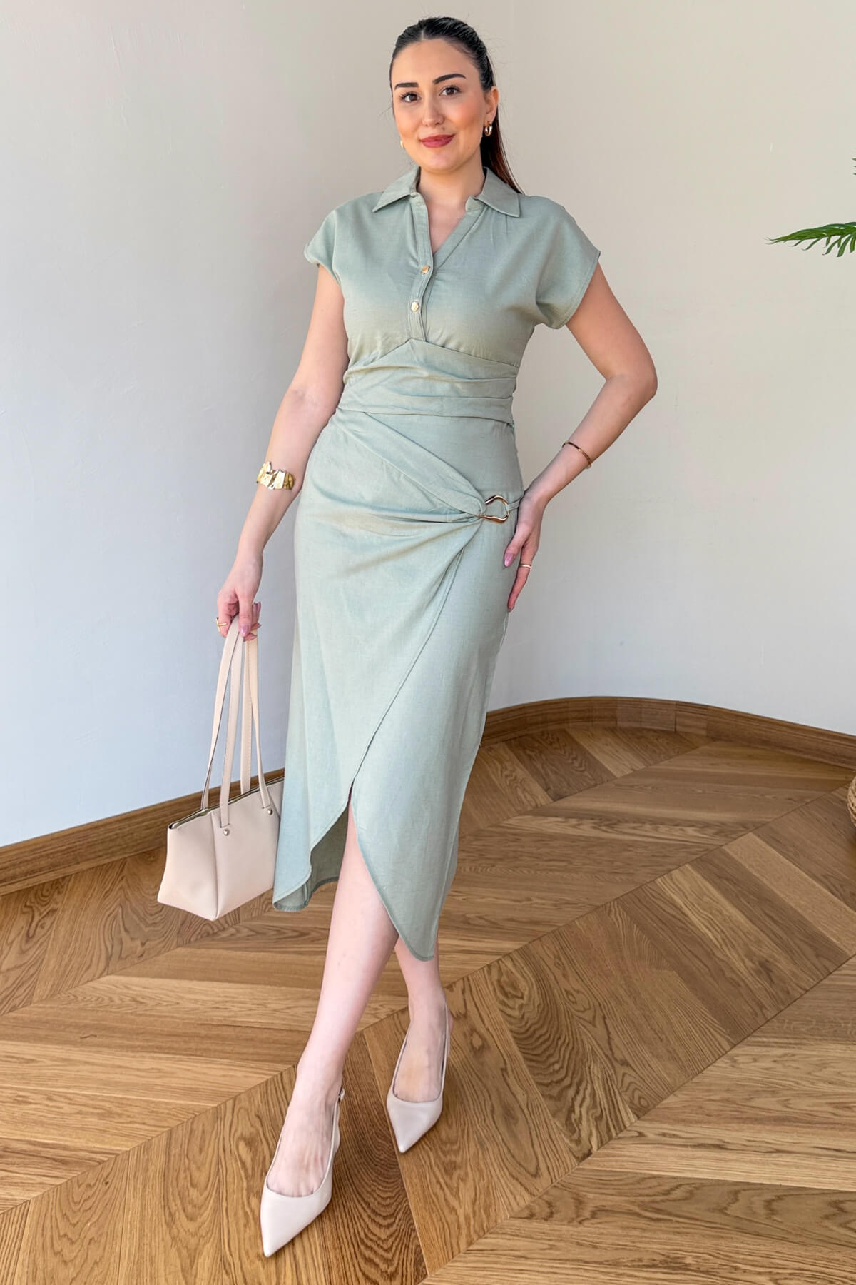 Tasarım Detayı: Bluzda modern polo yaka ve düğme detayı; etekte ise beli vurgulayan ön bağlama ve şık gold toka aksesuarı.