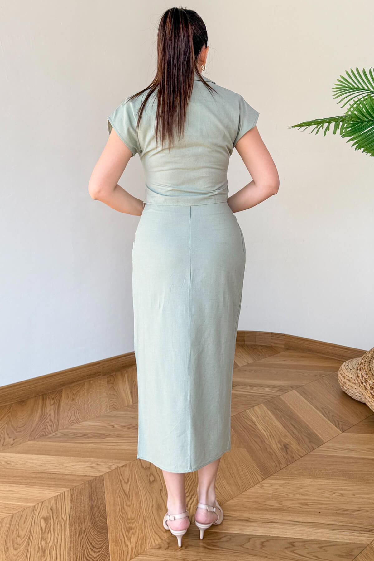 Keten kumaşın doğal dokusunu özgün tasarım detaylarıyla buluşturan bu ikili takım, yaz stilinize sofistike bir imza atıyor. Polo yaka tasarımıyla modern bir duruş sergileyen bluz, etek ucundaki özel bağlama ve gold toka detayıyla zenginleşen etekle kusursuz bir uyum yakalıyor. Hem şehir hayatının dinamizmine hem de sahil şıklığına kolayca adapte olan bu takım, nefes alan yapısıyla en sıcak günlerde bile sizi konforlu ve zarif bir silüetle buluşturuyor.