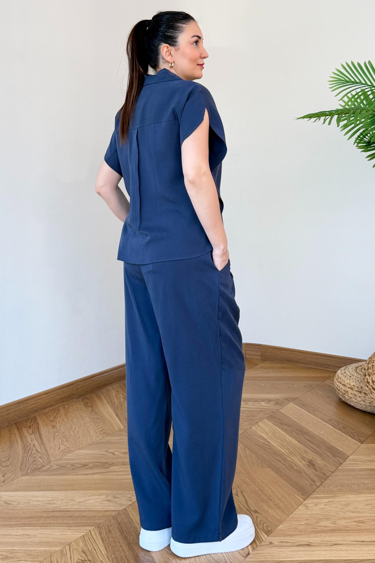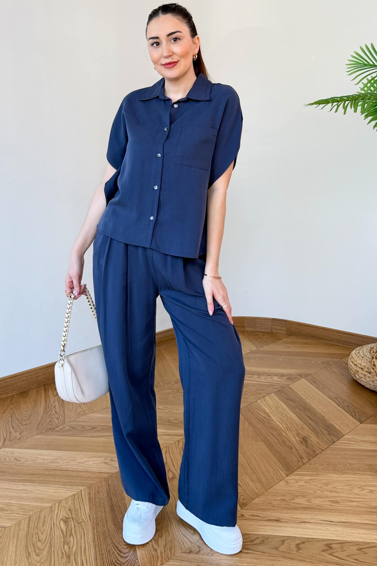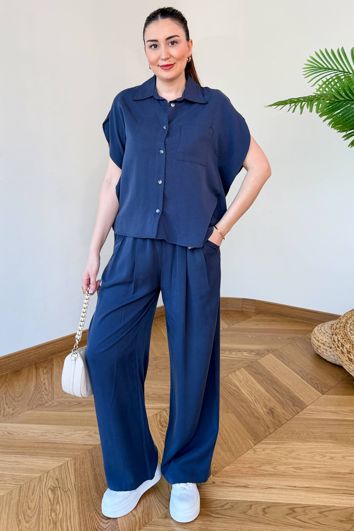 Rahatlığın ve çabasız şıklığın mükemmel bir yansıması olan bu ikili takım, indigo renginin derinliği ile stilinizi güçlendiriyor. Yarasa kol kesimiyle modern ve özgür bir hareket alanı sunan gömlek, beli lastikli pantolonuyla gün boyu süren bir konfor vadediyor. Akışkan dokusu ve dökümlü silüetiyle hem şehir hayatında hem de hafta sonu gezilerinde kendinizi hem şık hem de özgür hissetmeniz için tasarlandı.