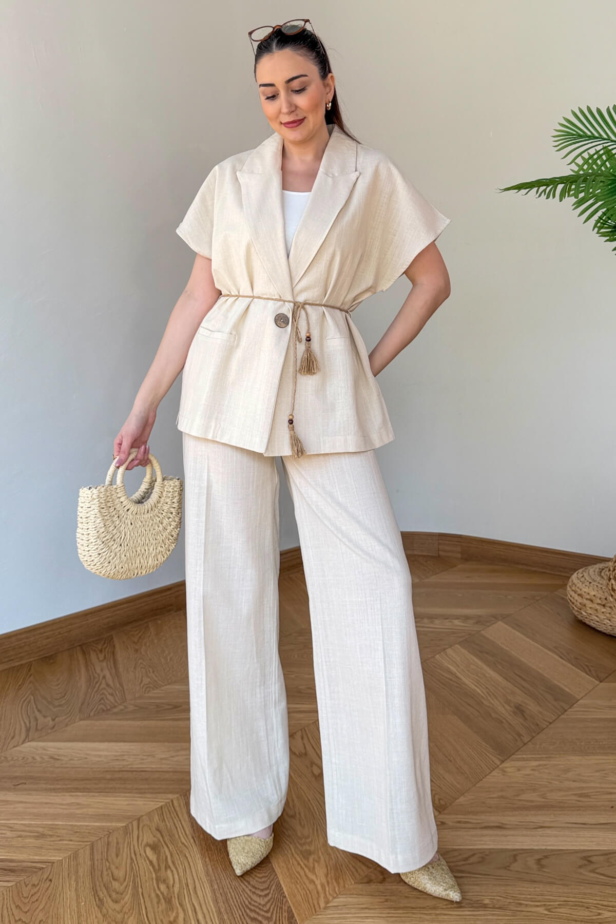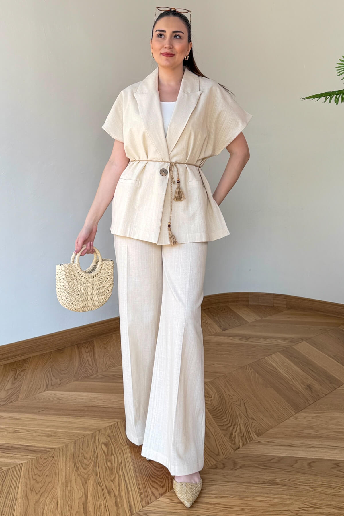 Tasarım Detayı: Cekette modern yarasa kol ve kruvaze yaka; pantolonda ise bohem bir hava katan etnik hasır bağlama detayı.