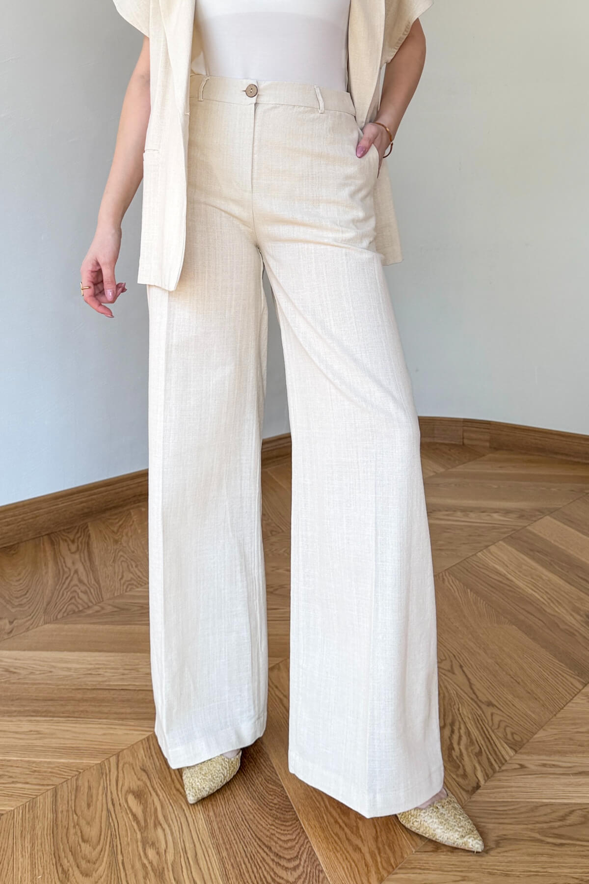 Kesim: Rahat hareket imkanı sunan dökümlü ceket ve geniş paça (palazzo) pantolon formu.