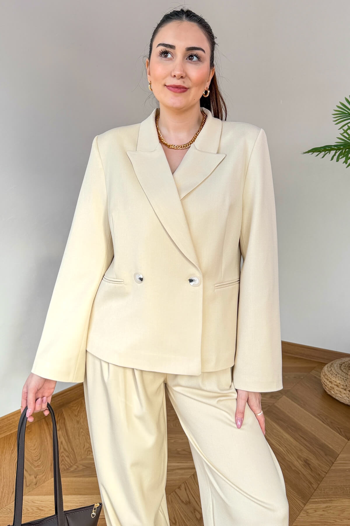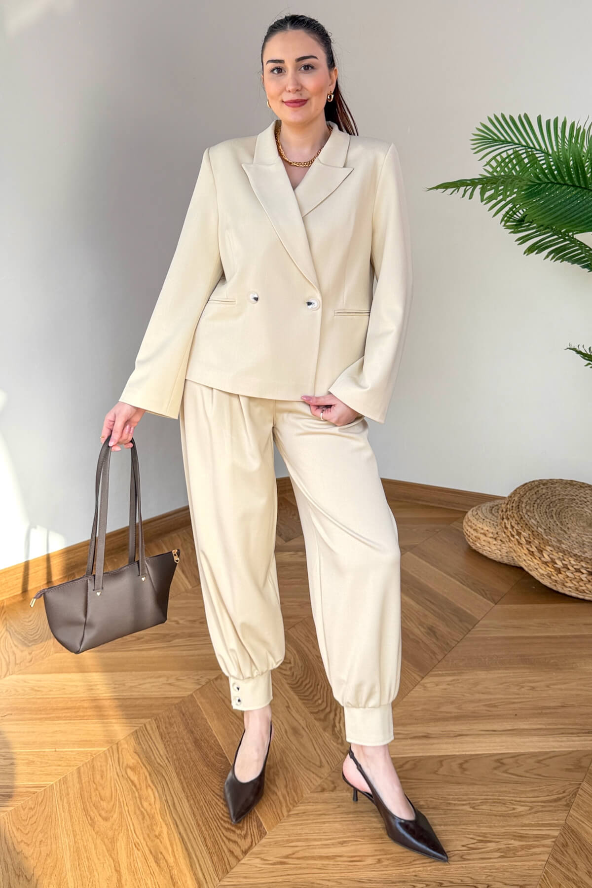 Modern maskülen tarzın feminen detaylarla buluştuğu bu ikili takım, gardırobunuzun en güçlü parçası olmaya aday. 64 cm boyundaki kruvaze kesim ceketi, klasik şıklığı çağdaş bir dokunuşla sunarken; 95 cm uzunluğundaki şalvar pantolonu, paçalarındaki özel düğme detaylarıyla dinamik bir silüet oluşturuyor. Kaliteli dokusu ve kusursuz kalıbıyla hem ofis şıklığında hem de özel davetlerde zahmetsiz bir zarafet ve yüksek konfor vadediyor.