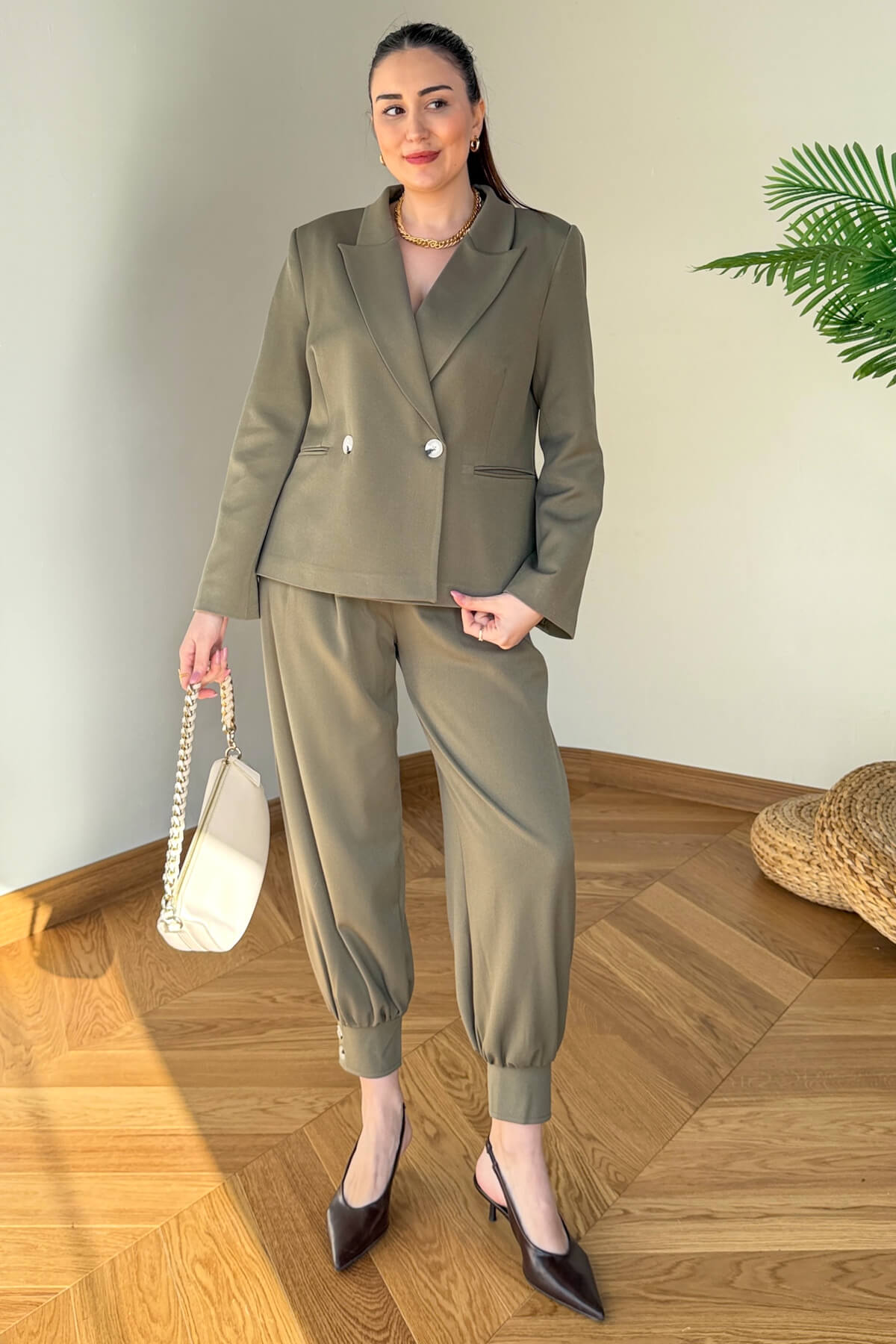 Modern maskülen tarzın feminen detaylarla buluştuğu bu ikili takım, gardırobunuzun en güçlü parçası olmaya aday. 64 cm boyundaki kruvaze kesim ceketi, klasik şıklığı çağdaş bir dokunuşla sunarken; 95 cm uzunluğundaki şalvar pantolonu, paçalarındaki özel düğme detaylarıyla dinamik bir silüet oluşturuyor. Kaliteli dokusu ve kusursuz kalıbıyla hem ofis şıklığında hem de özel davetlerde zahmetsiz bir zarafet ve yüksek konfor vadediyor.