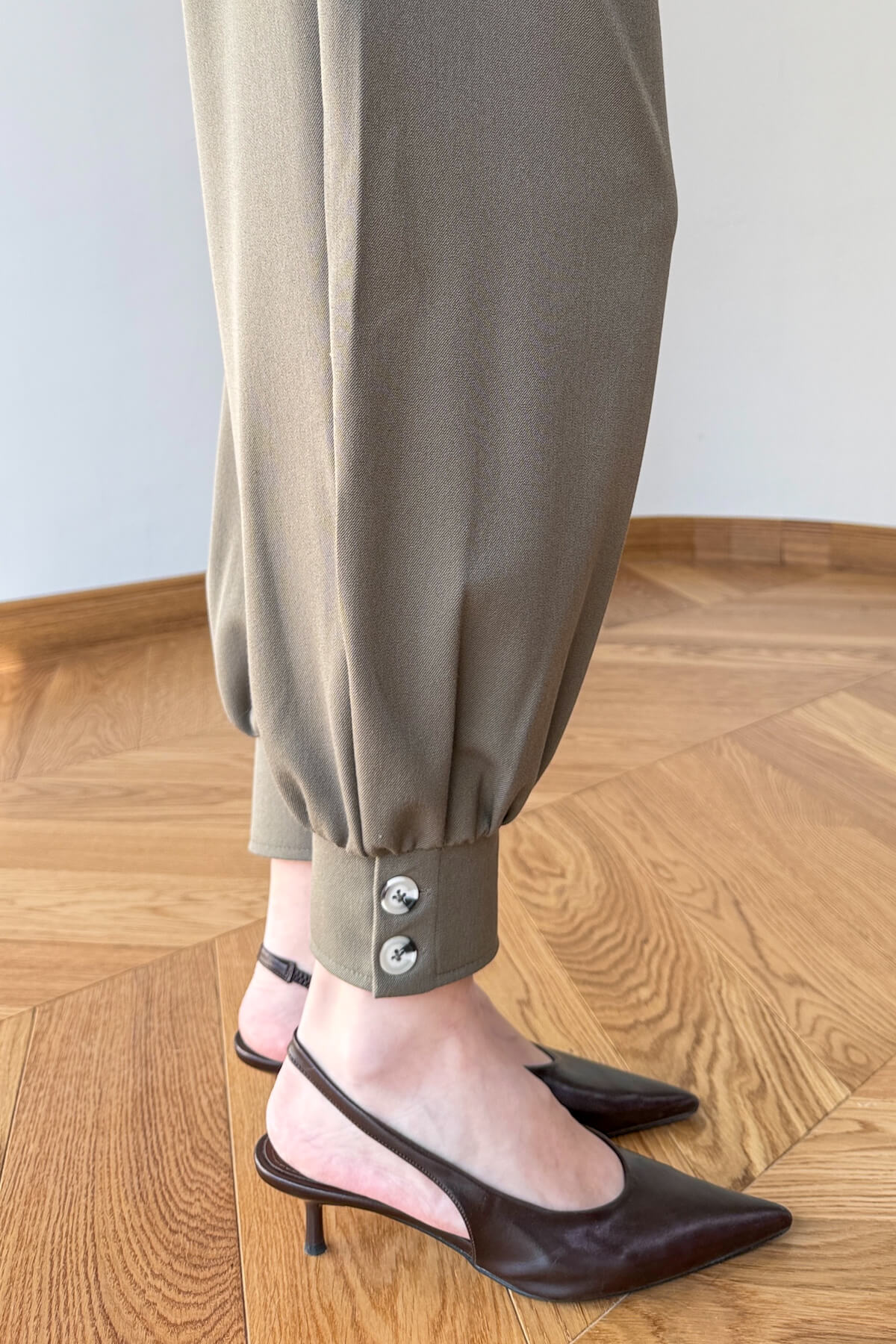 Tasarım Detayı: Cekette şık kruvaze kapama; pantolon paçalarında ise tasarımı tamamlayan ikonik düğme detayları.