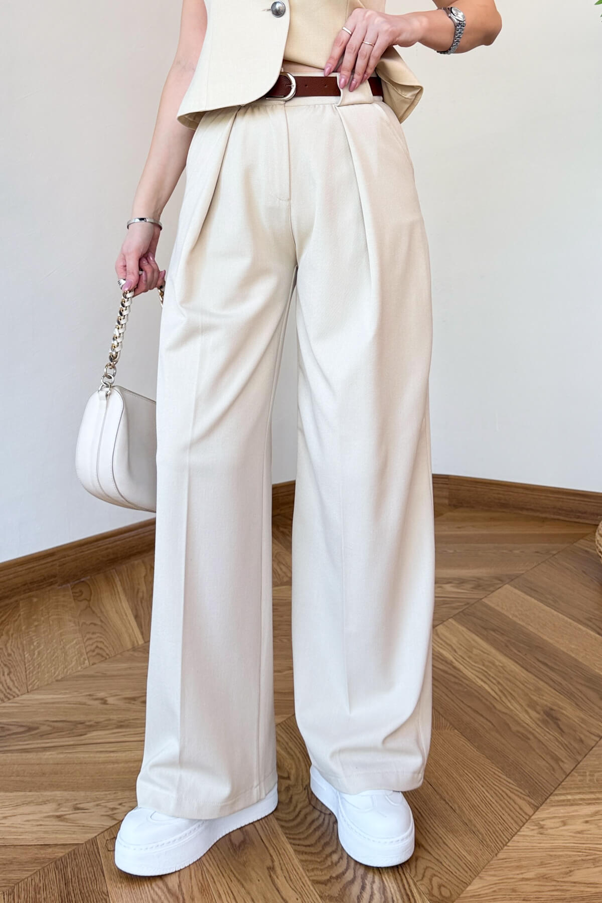 Doğal dokuların modern tasarım anlayışıyla buluştuğu bu ikili takım, çaba sarf etmeden stil sahibi görünmek isteyen kadınlar için tasarlandı. Ham keten kumaşın nefes alan yapısı ve tok duruşu, sıfır kol ceket tasarımındaki zarif düğme detayları ve tam astar kalitesiyle birleşerek kusursuz bir silüet sunuyor. Yüksek bel palazzo pantolonun piliseli yapısı ve şık kemer detayı bacak boyunuzu uzun gösterirken, her adımda akışkan ve sofistike bir duruş sergilemenizi sağlıyor.
