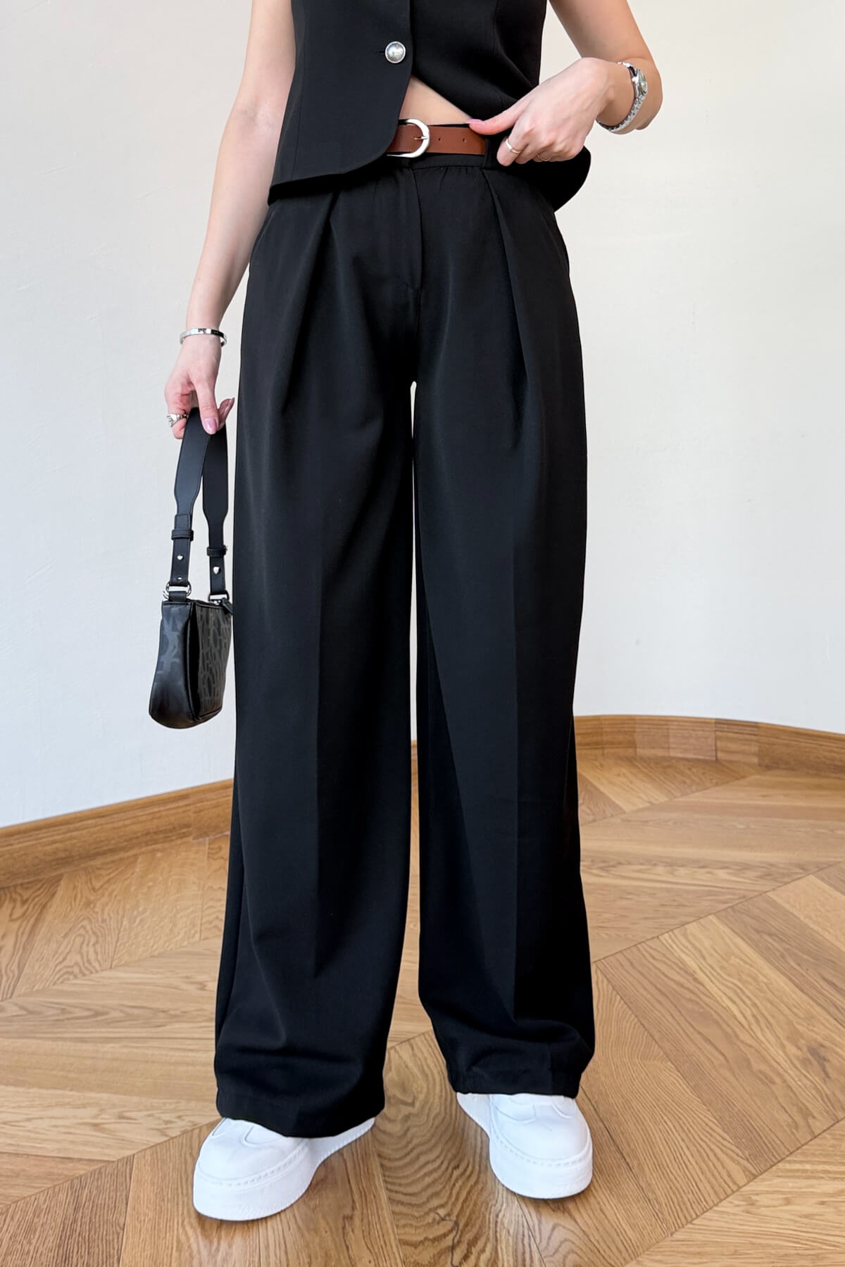 Kesim: Rahat ve geniş paça palazzo pantolon ile vücuda hafifçe oturan sıfır kol ceket formu.