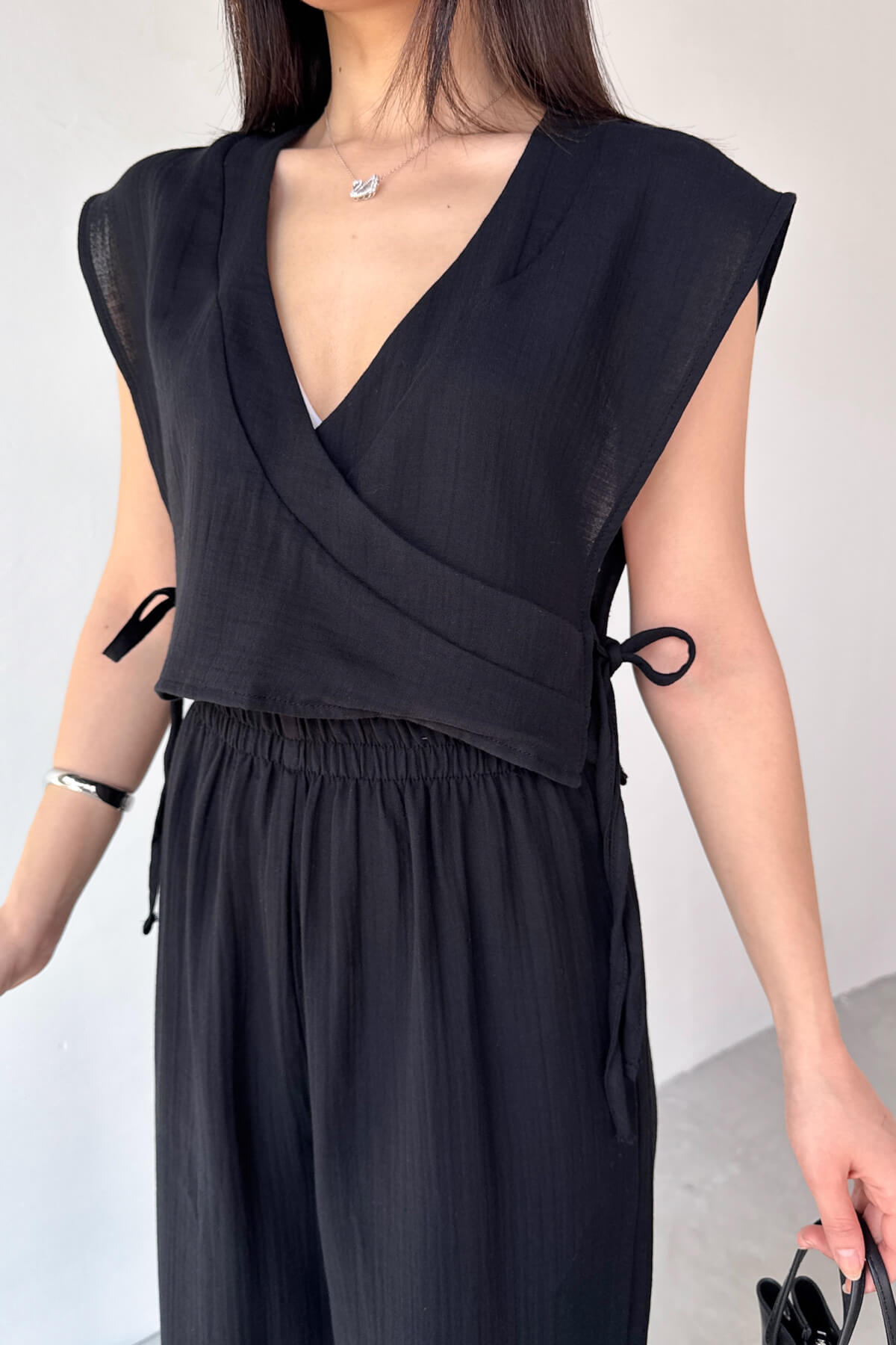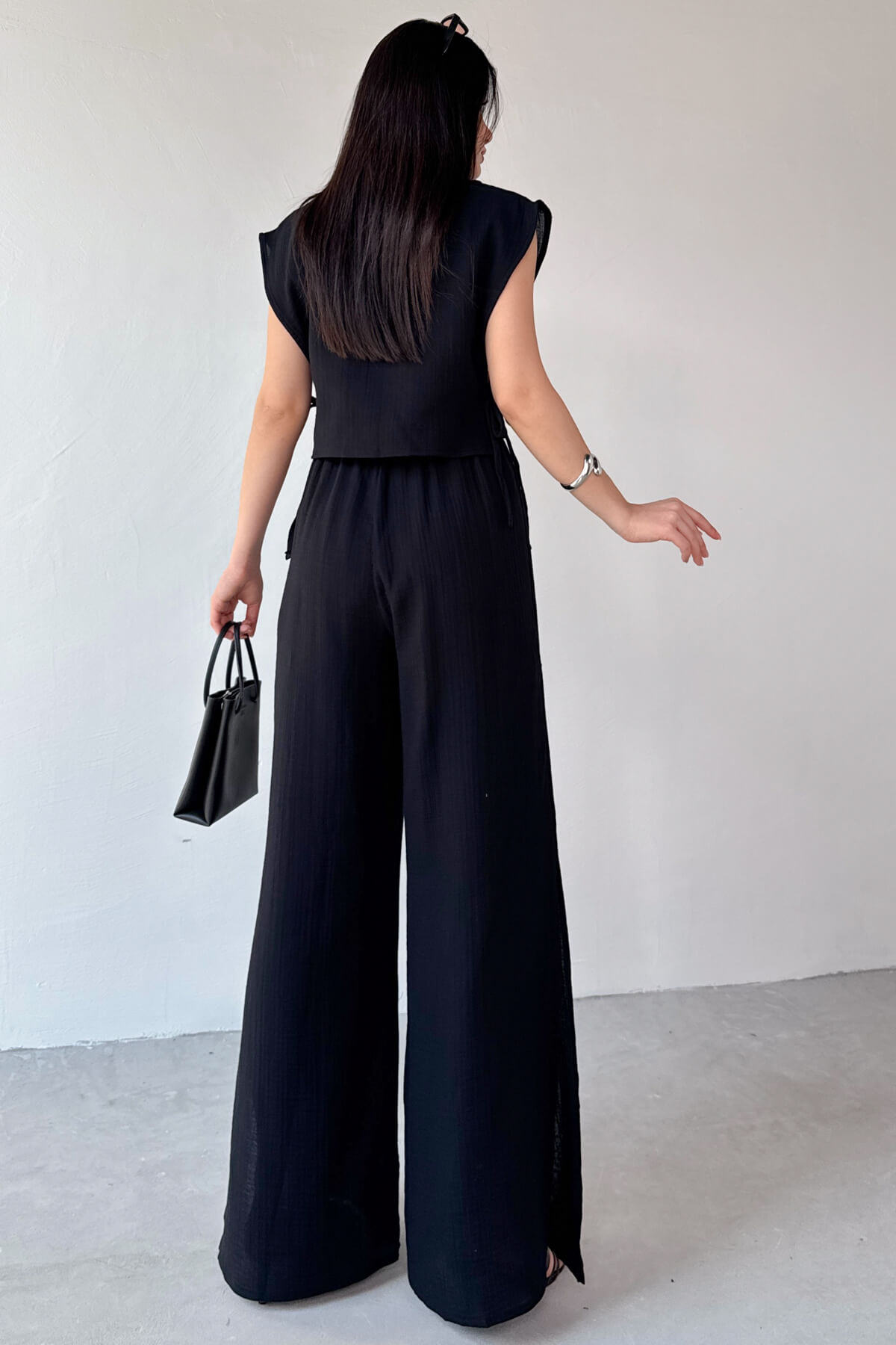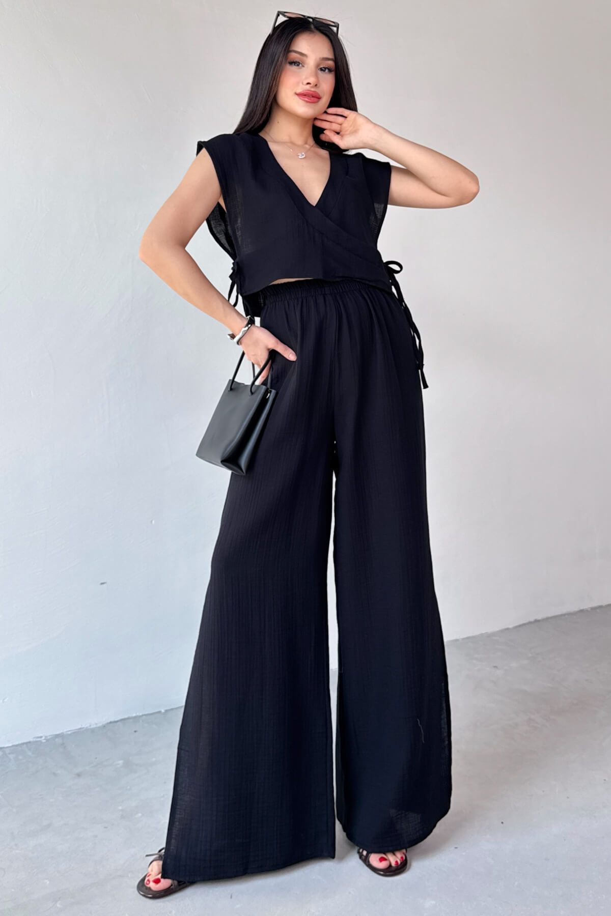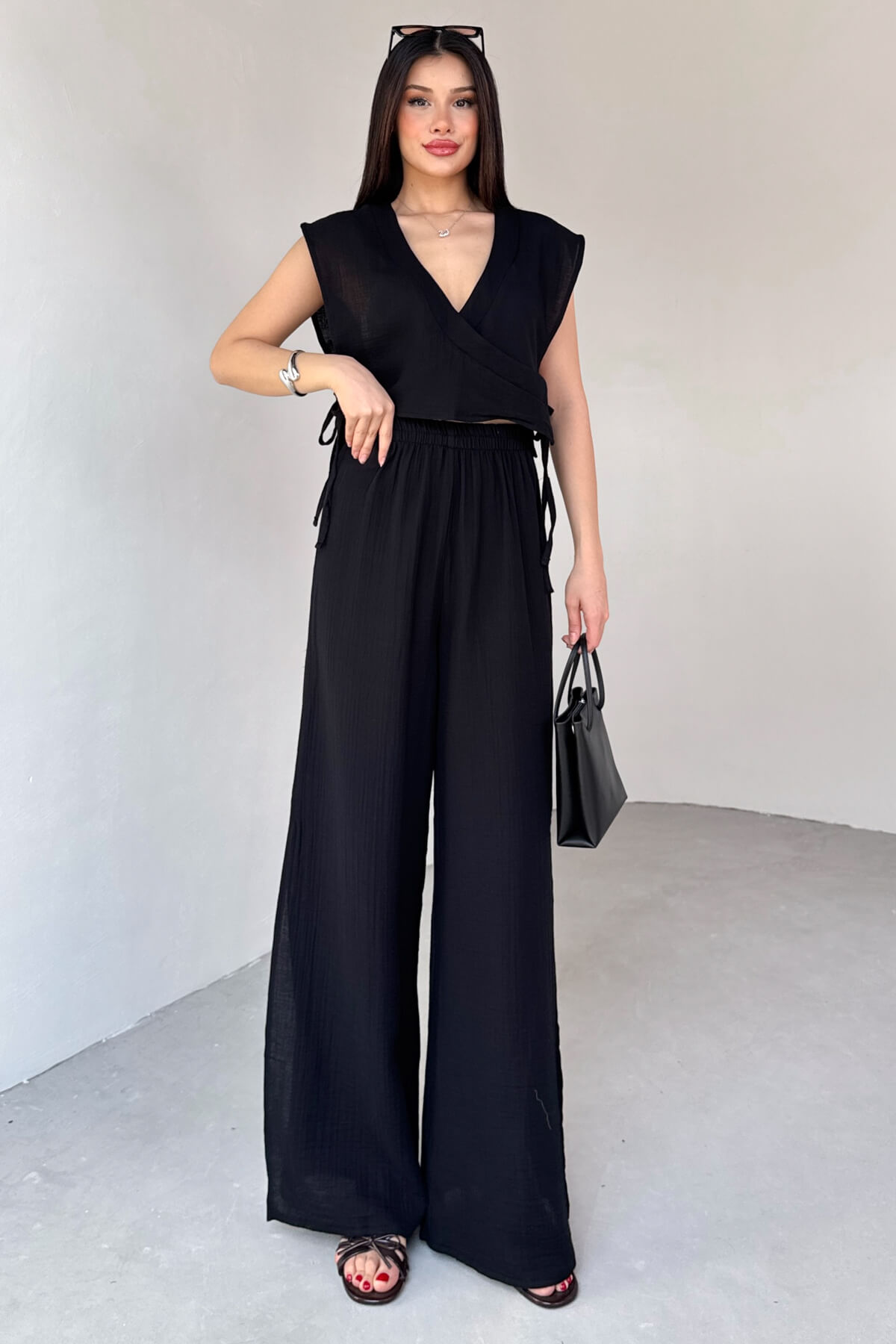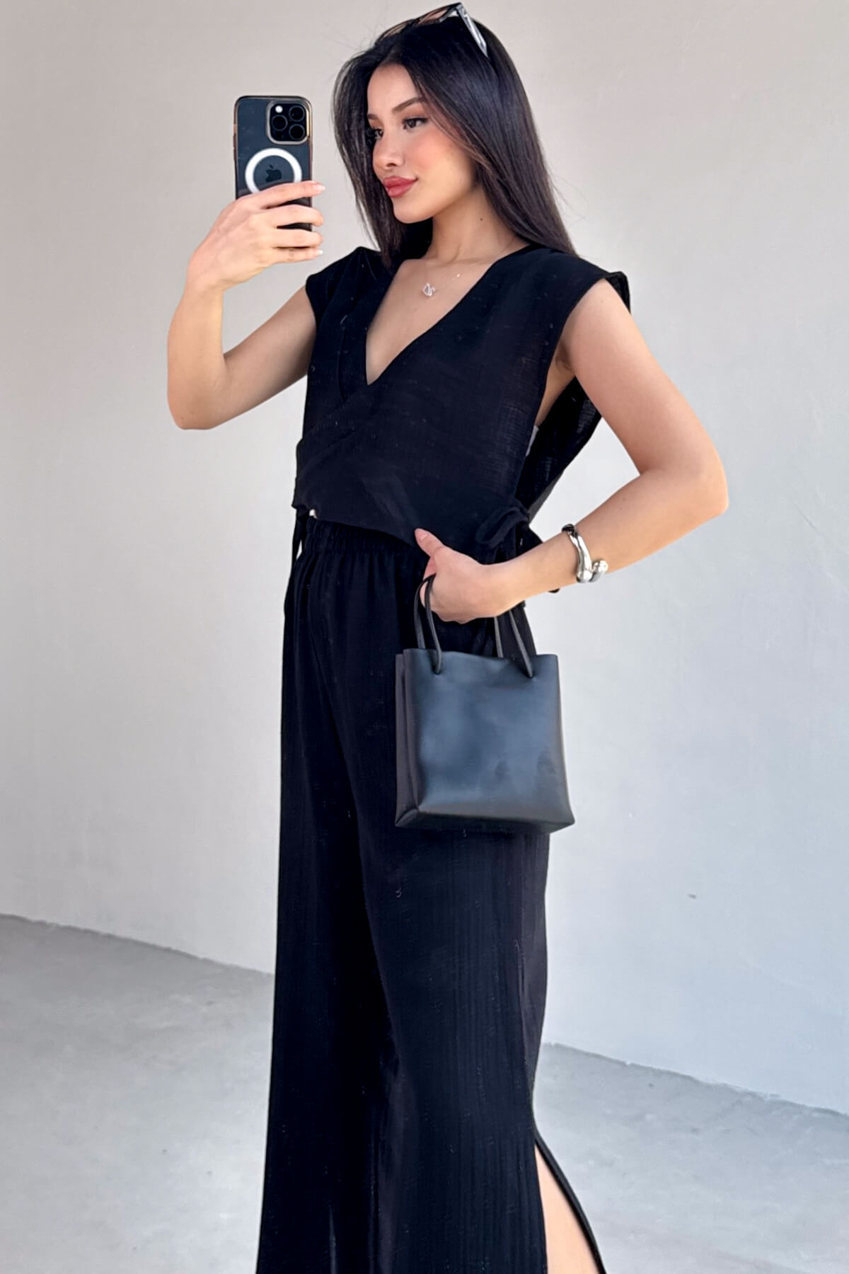 Bluz kruvaze yaka ve yandan bağlamalı modeldir. Pantolon salaş modeldir ve yırtmaç detayı bulunur.