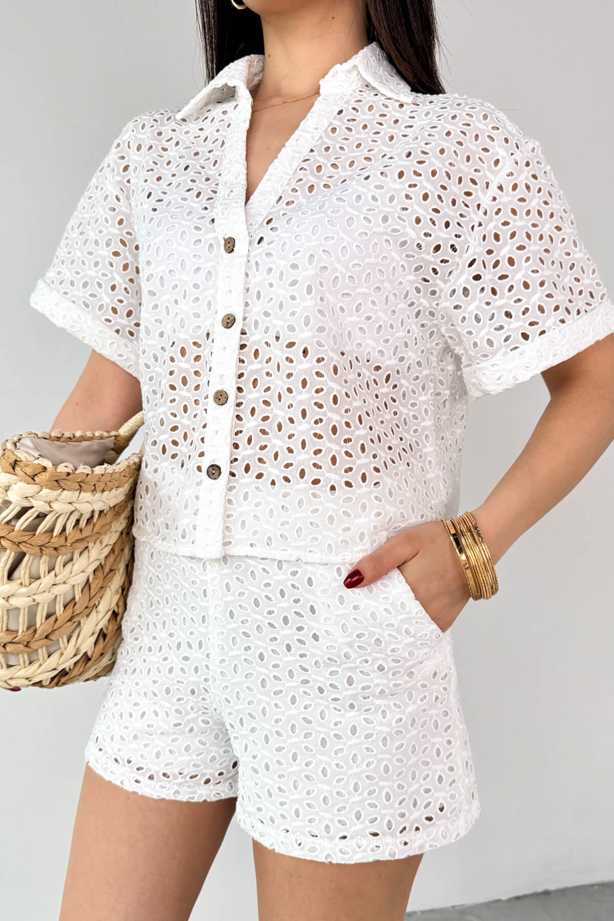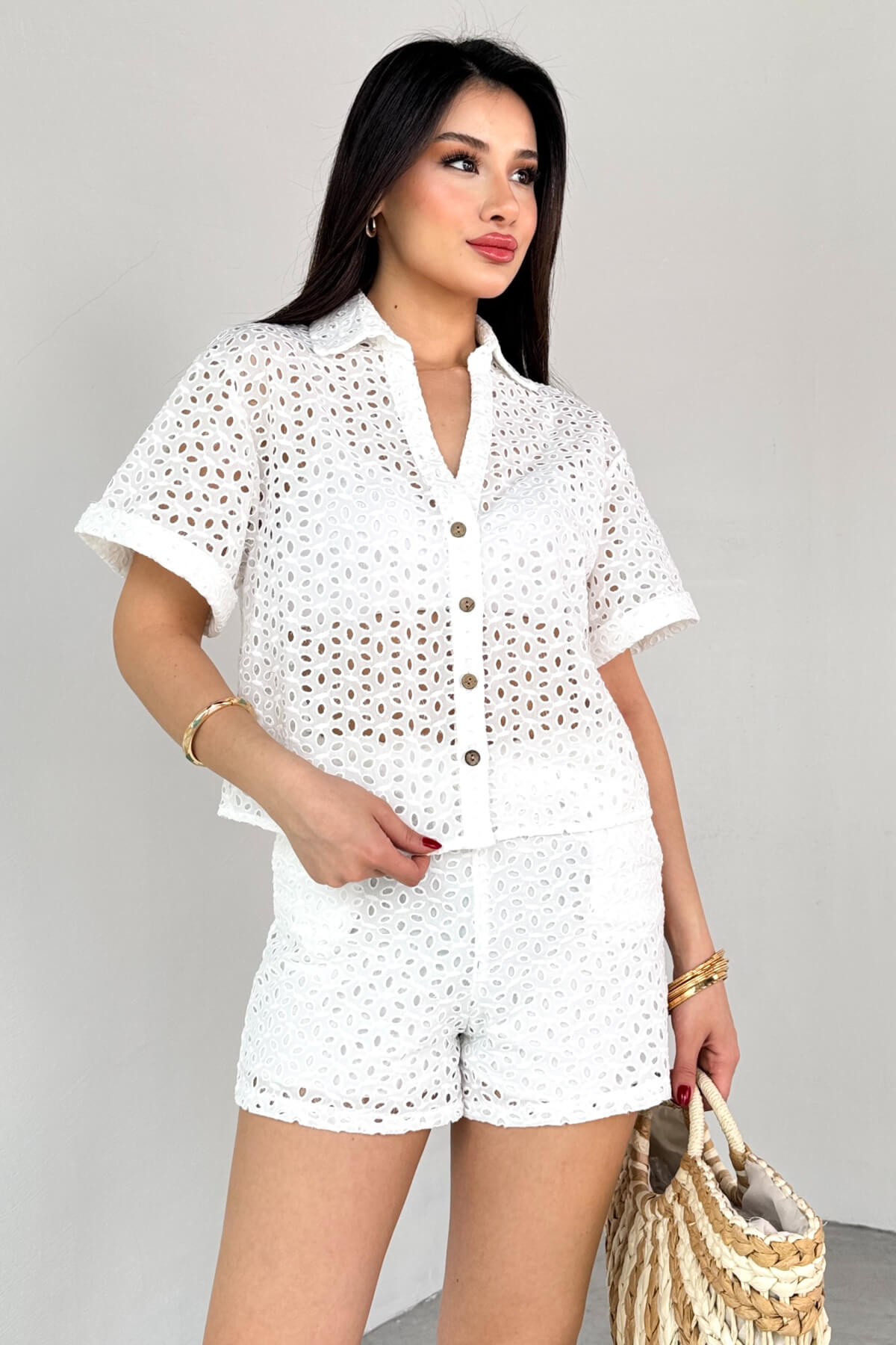 Gömlek güpürlü rahat kesimdir. Şortun cep detayı bulunur. Fisto kumaştır.
