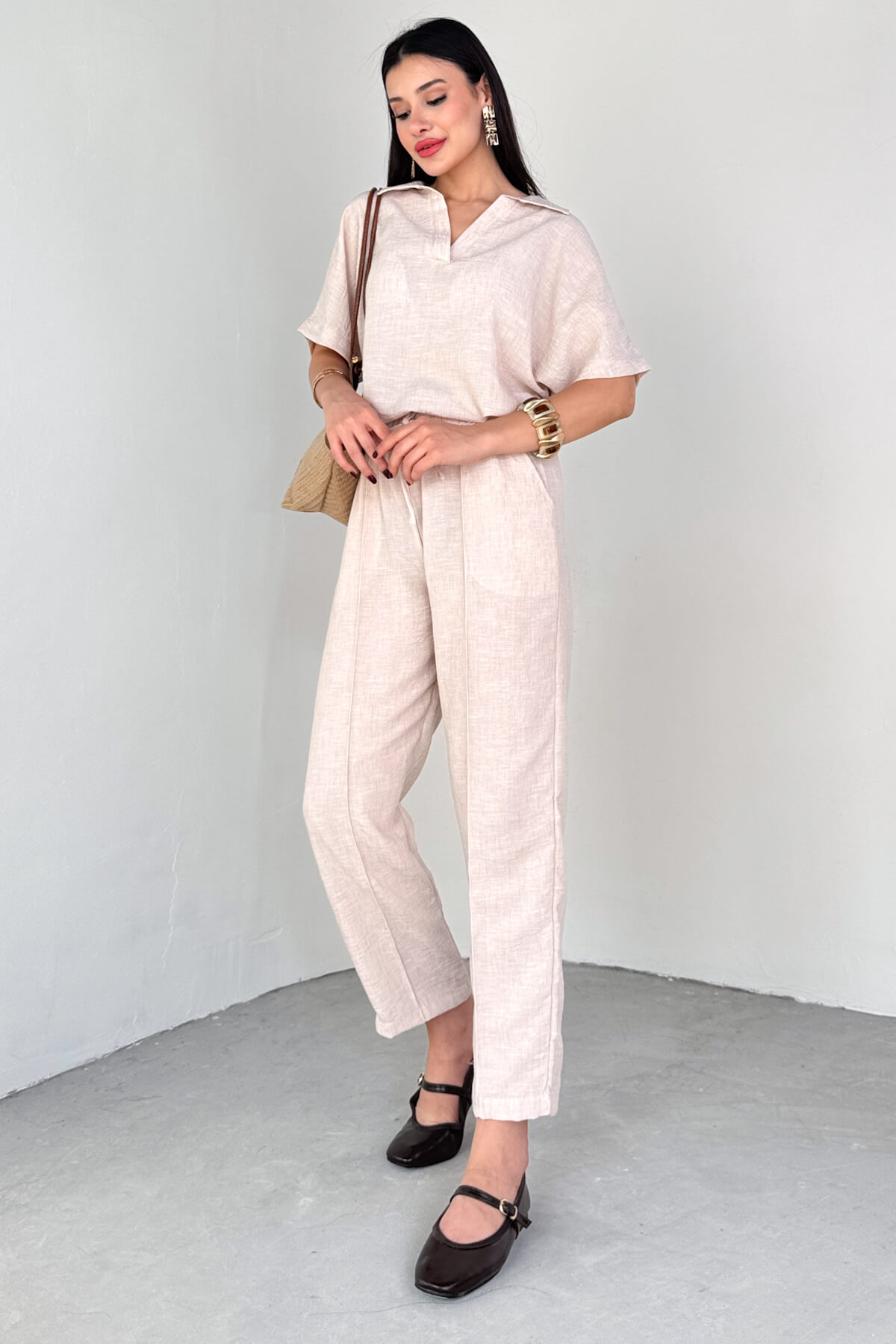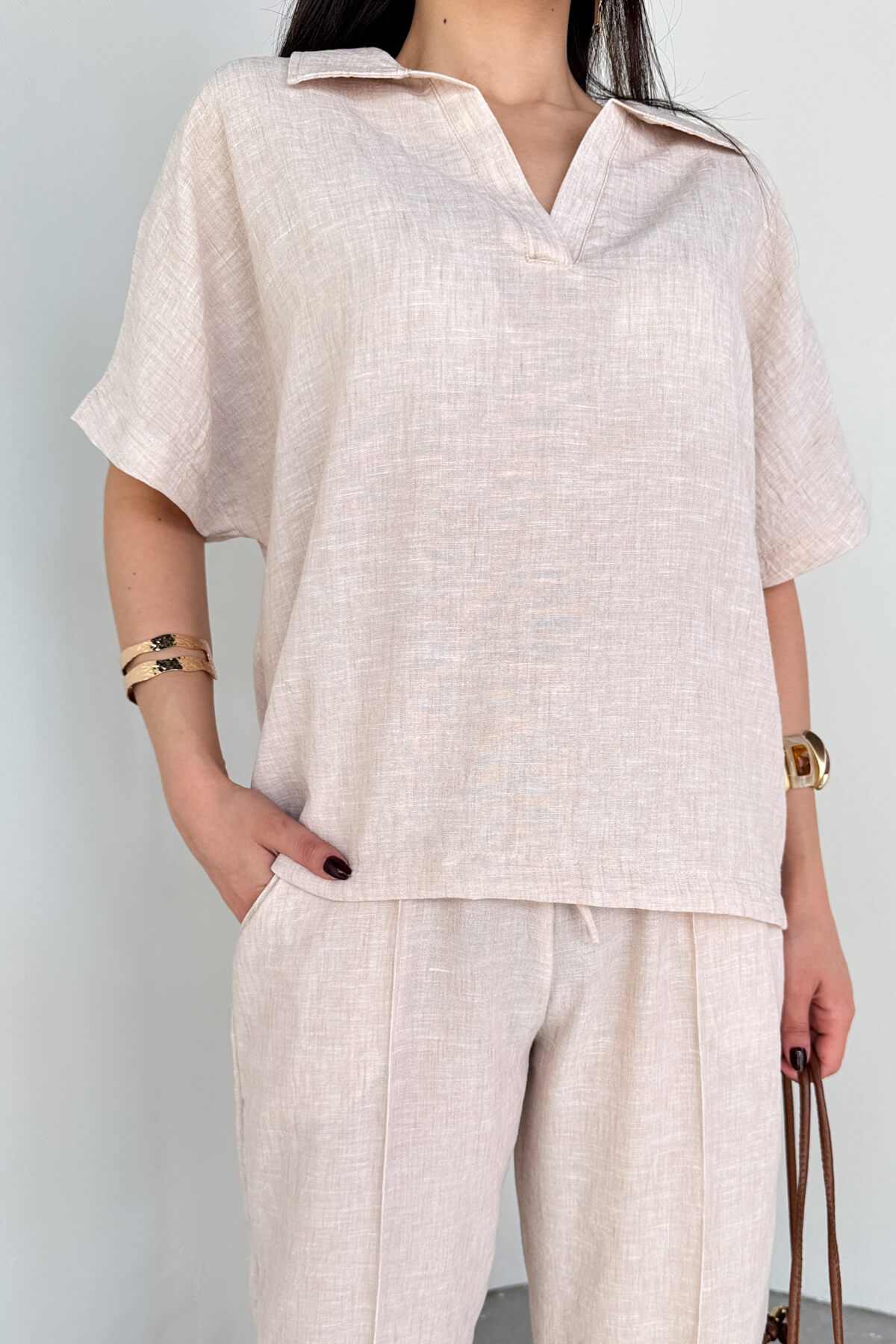 ✔ Üst parça, oversize kesimi ve polo yaka detayıyla sade ama modern bir tarz sunar.