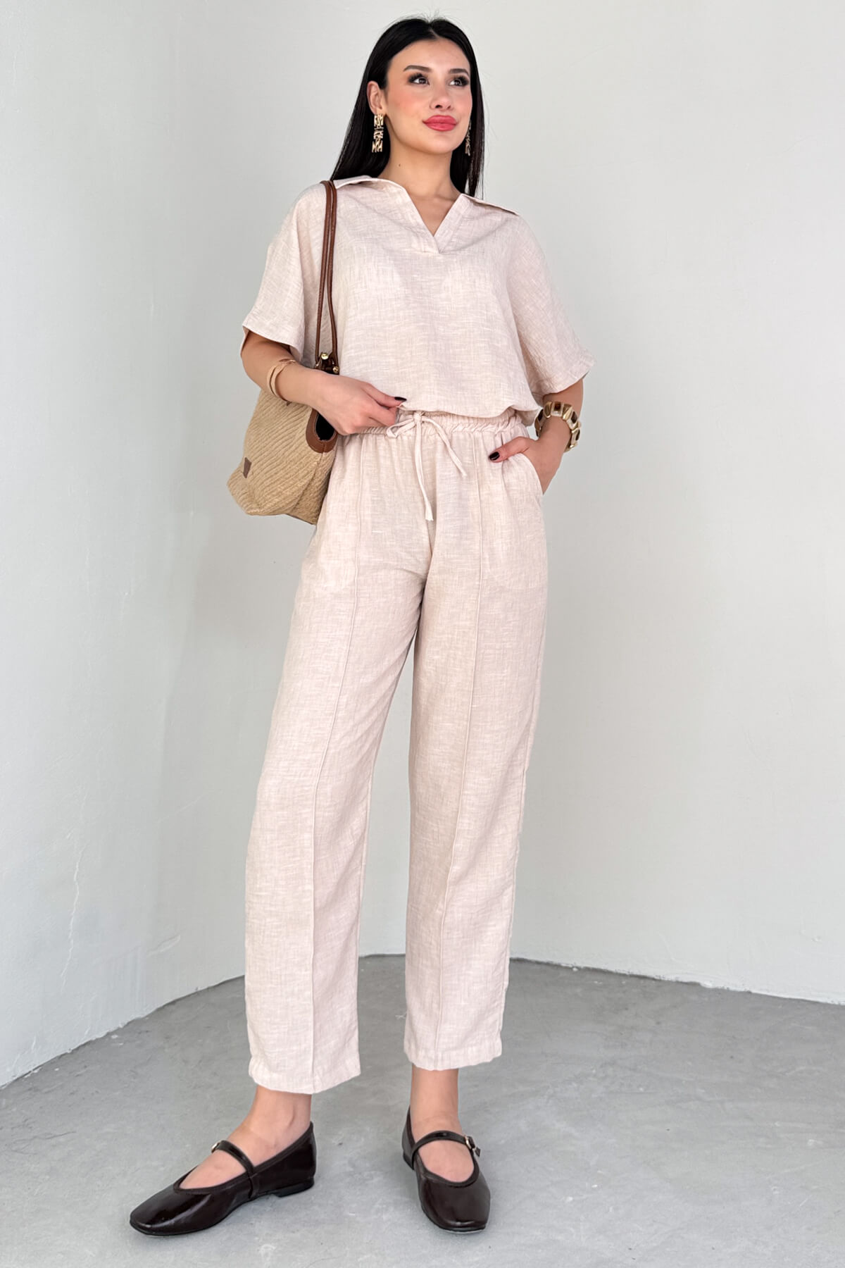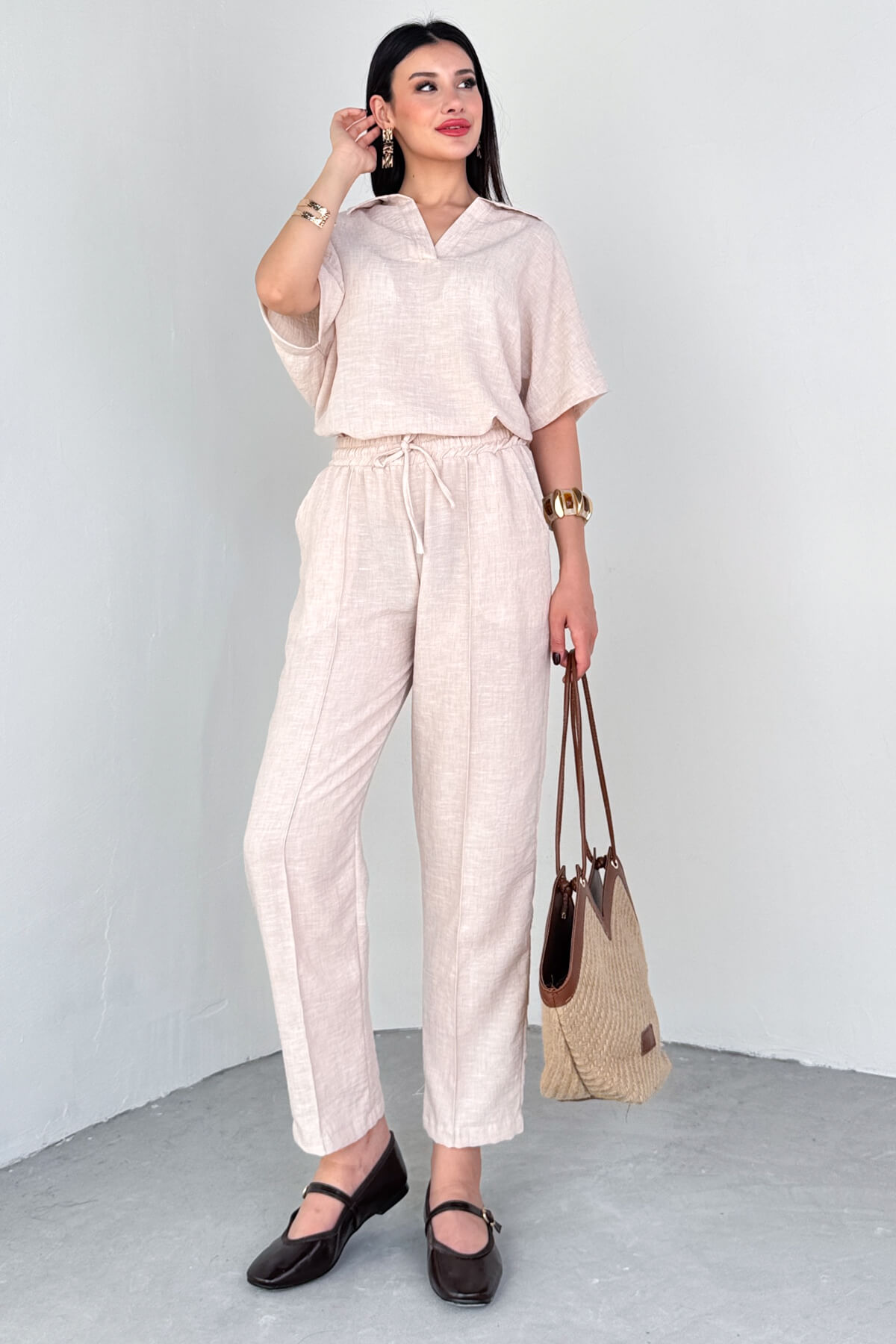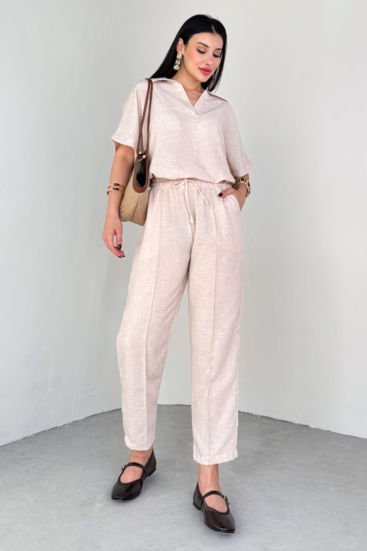 ✔ Pantolon, çimalı havuç kesimi, bel lastiği ve bağlama detayıyla konforu maksimuma çıkarır.