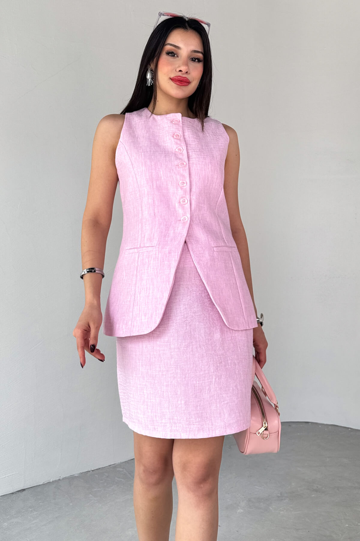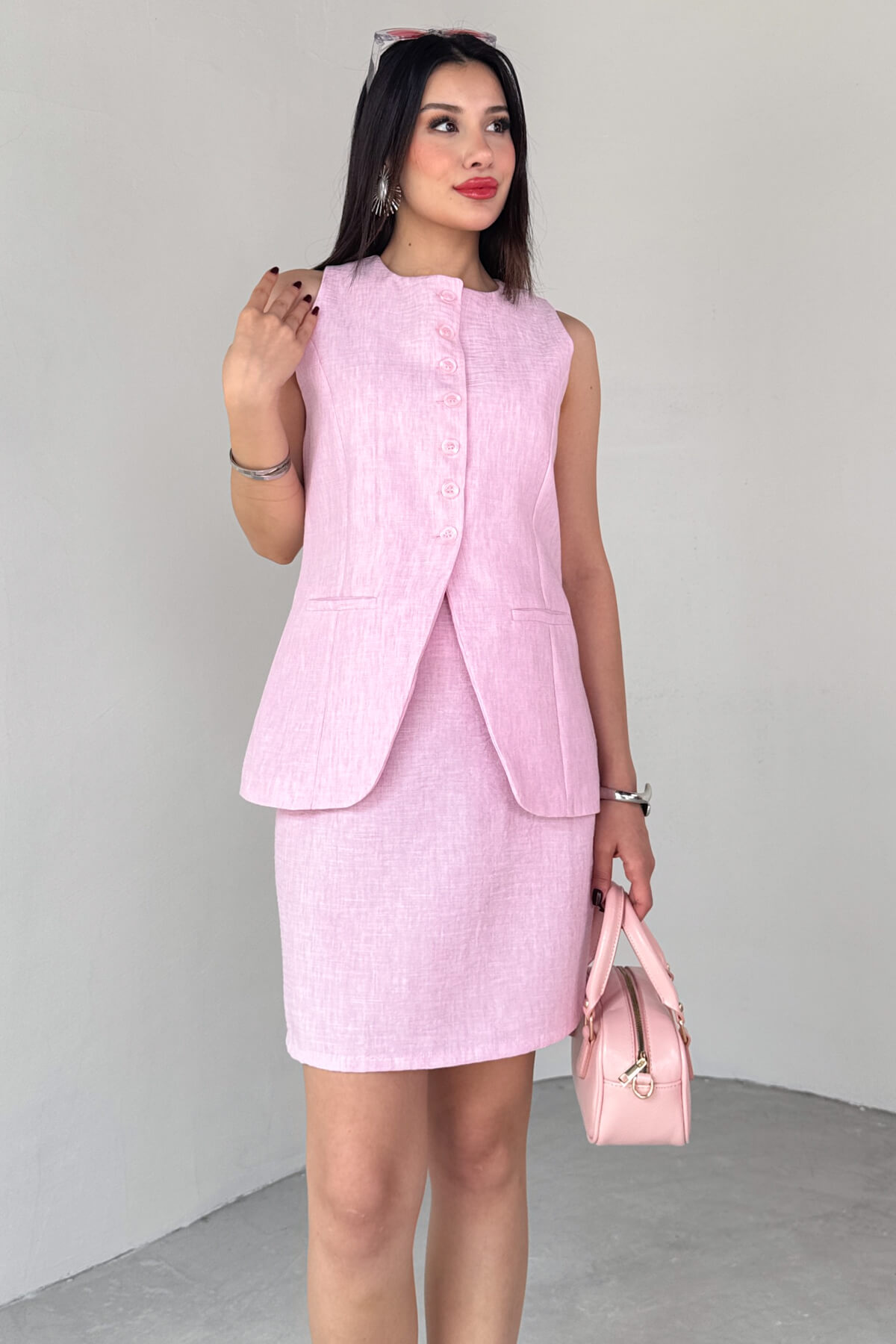 ✔ Modern kesimli yelek, önde yer alan düğme detayı ve içe doğru kıvrımlı formuyla farklı bir siluet sunar.