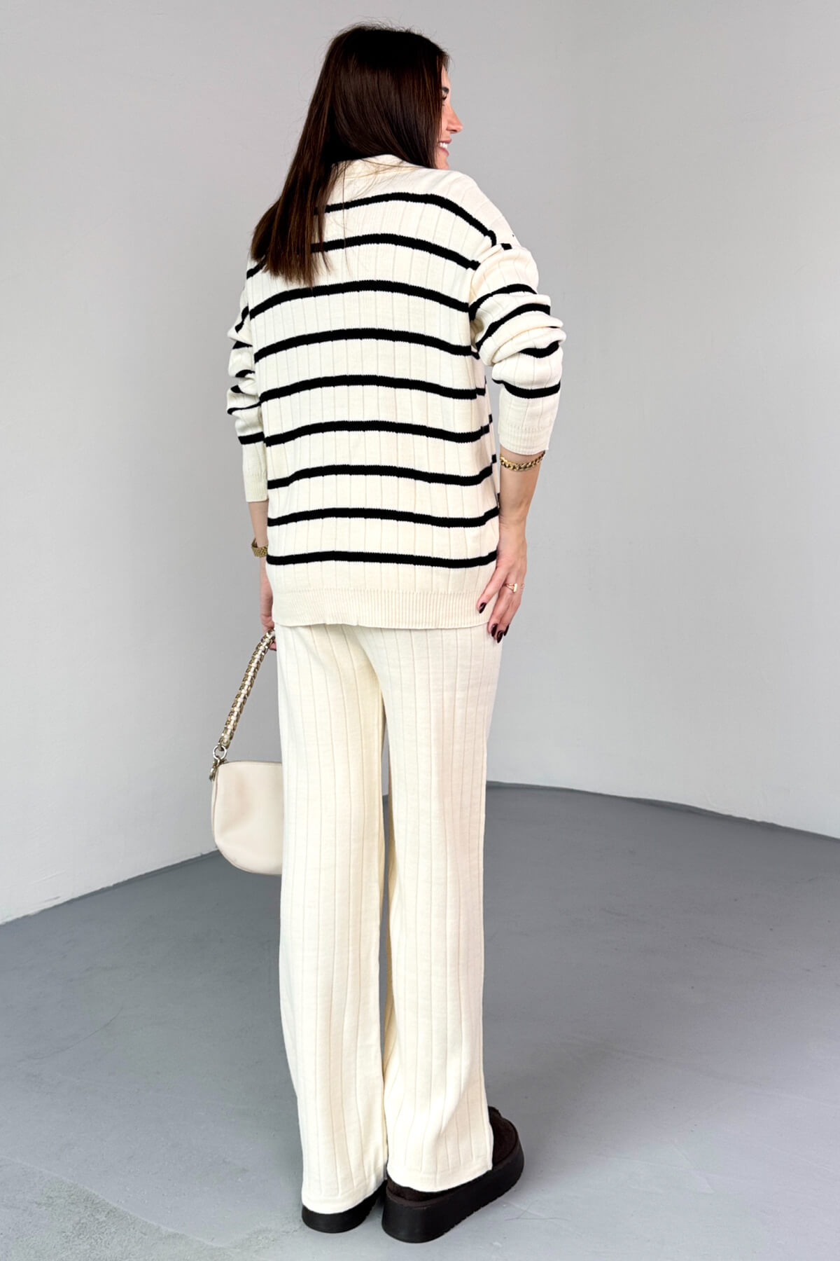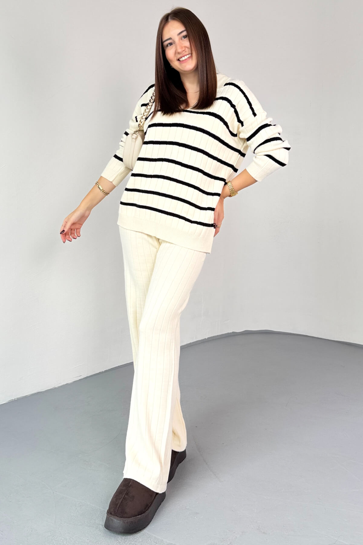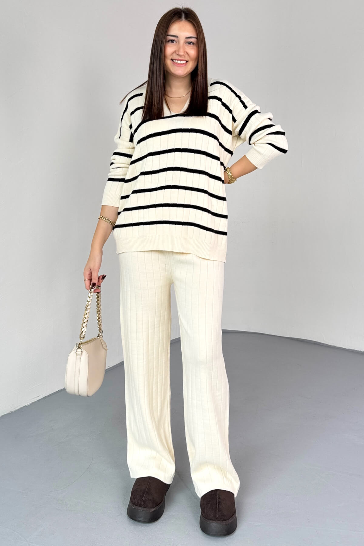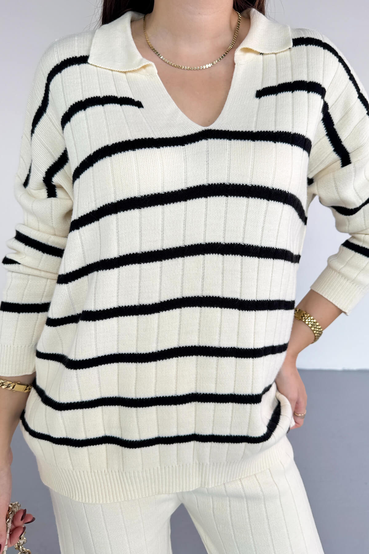 TKM-13340 Ekru Yatay Çizgili Polo Yaka Triko Takım