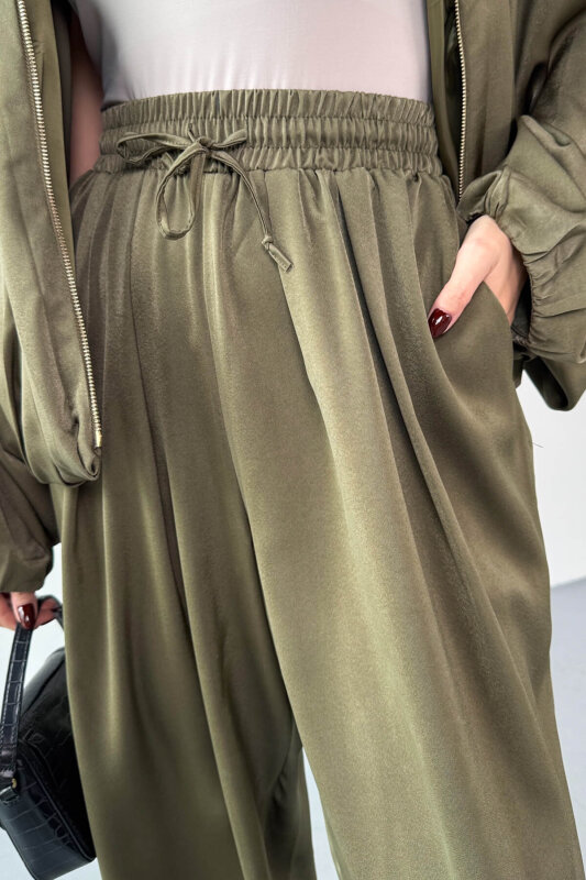 TKM-13350 Haki Özel Tasarım Saten Bomber Ceket & Şalvar Pantolon İkili Takım