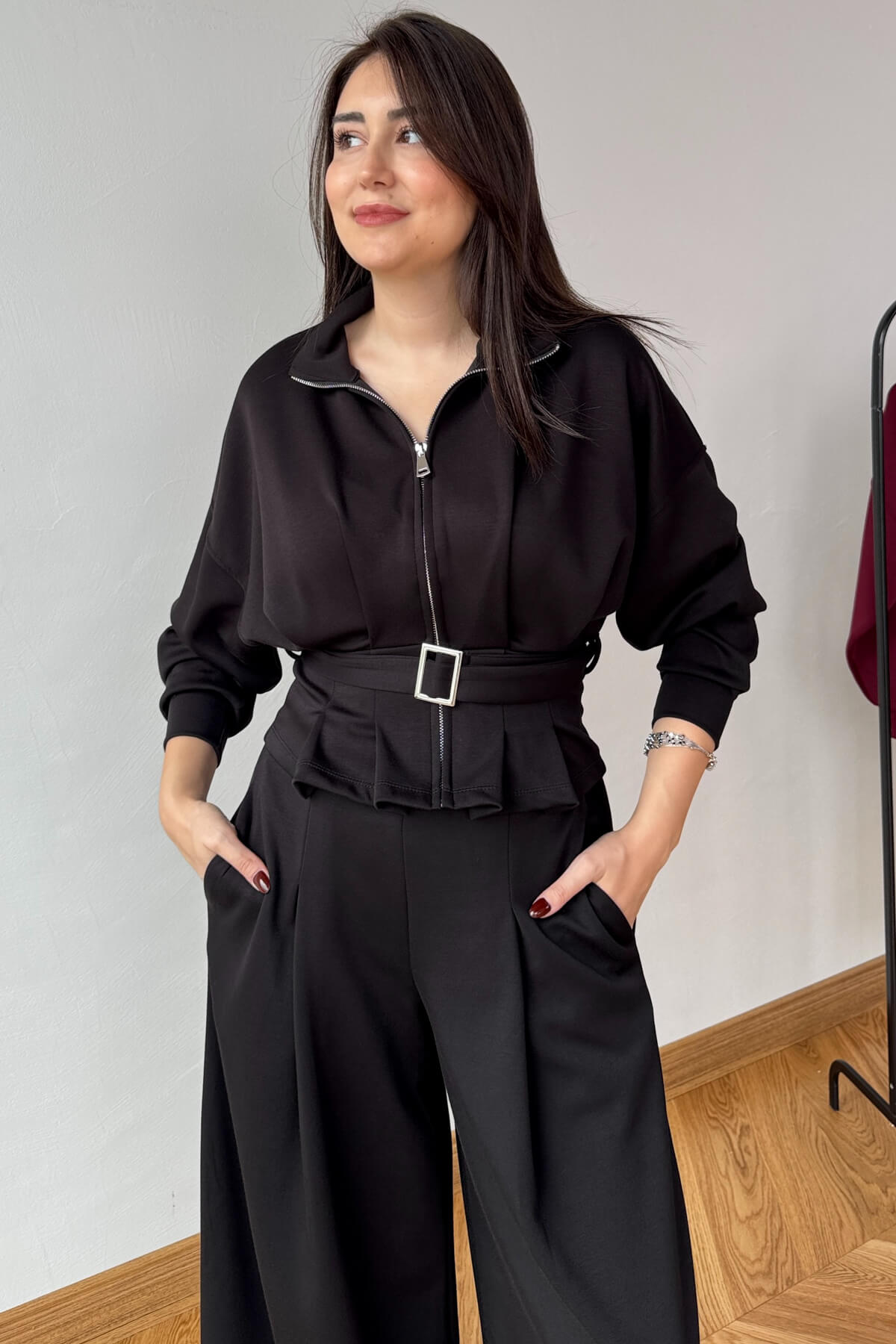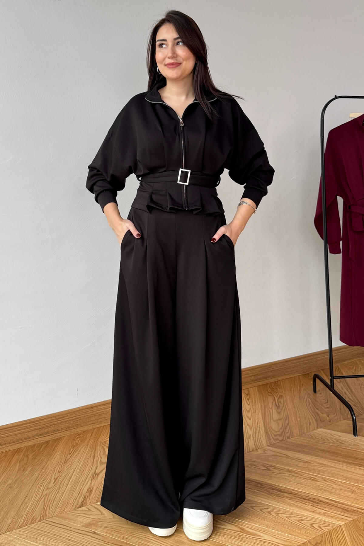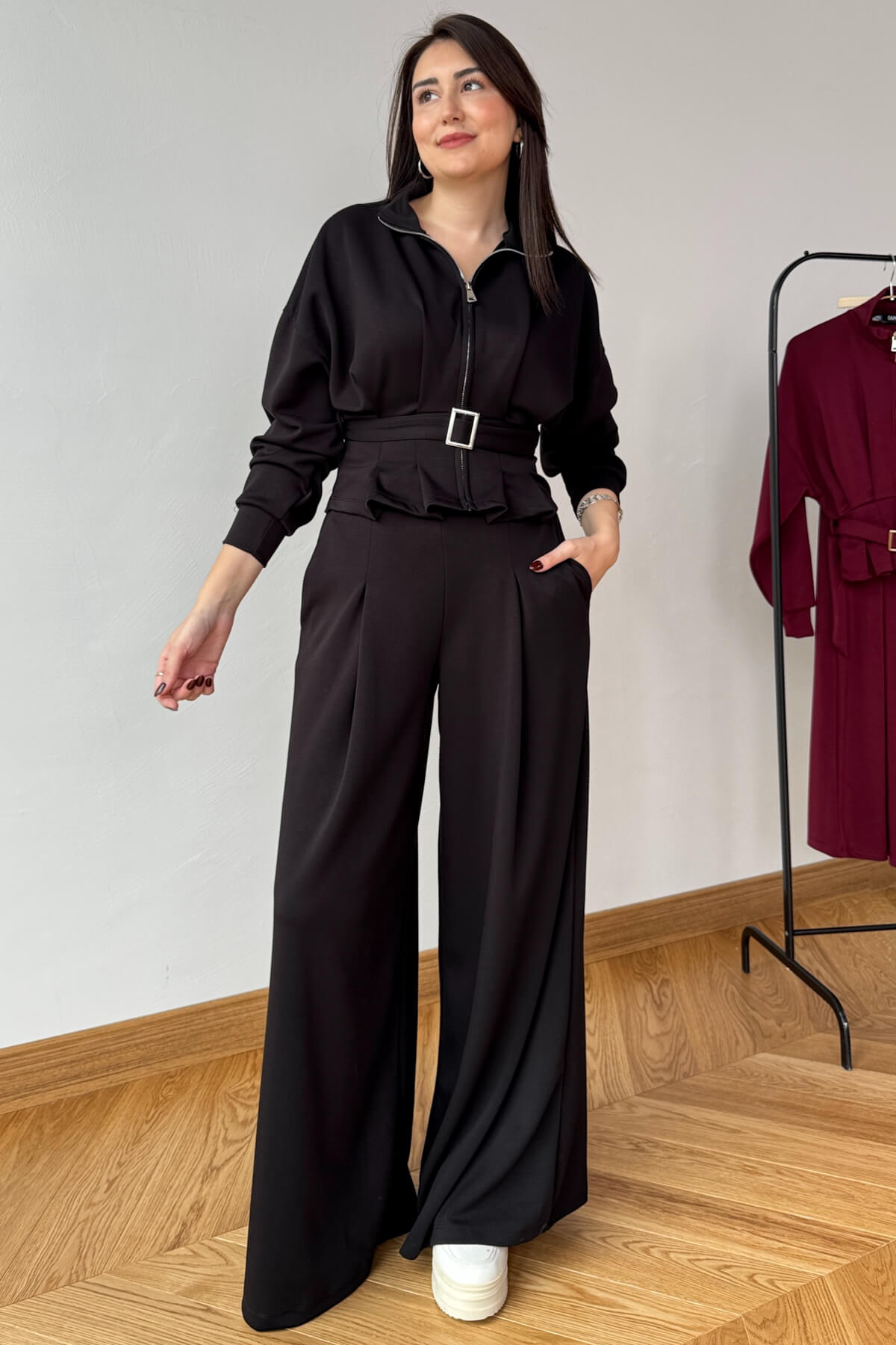 Üst parça fermuarlı, 50 cm boy ölçüsüyle modern görünüm