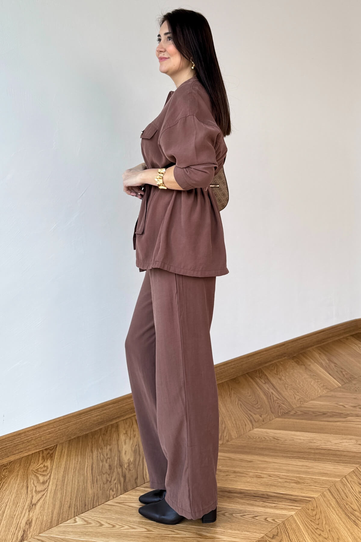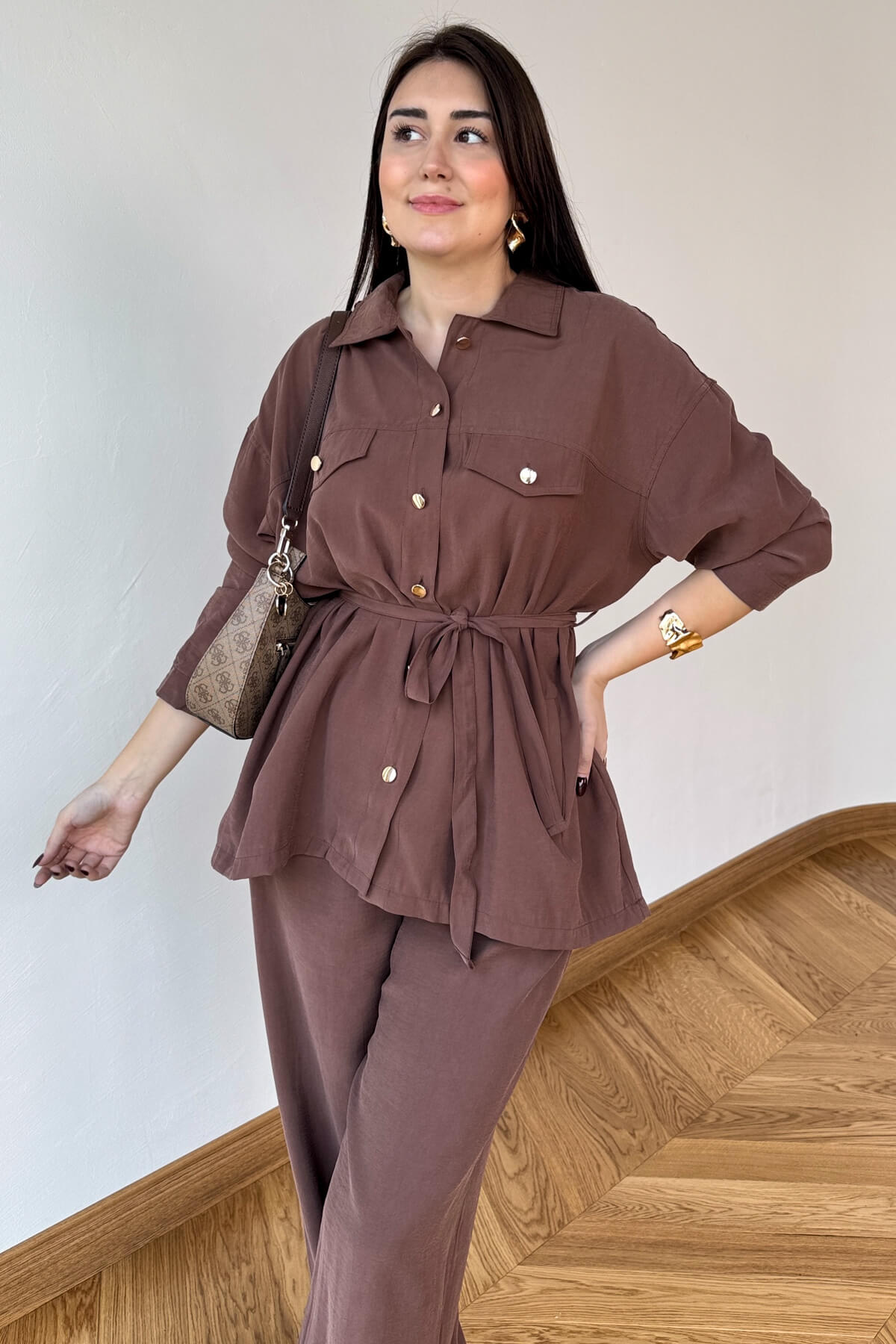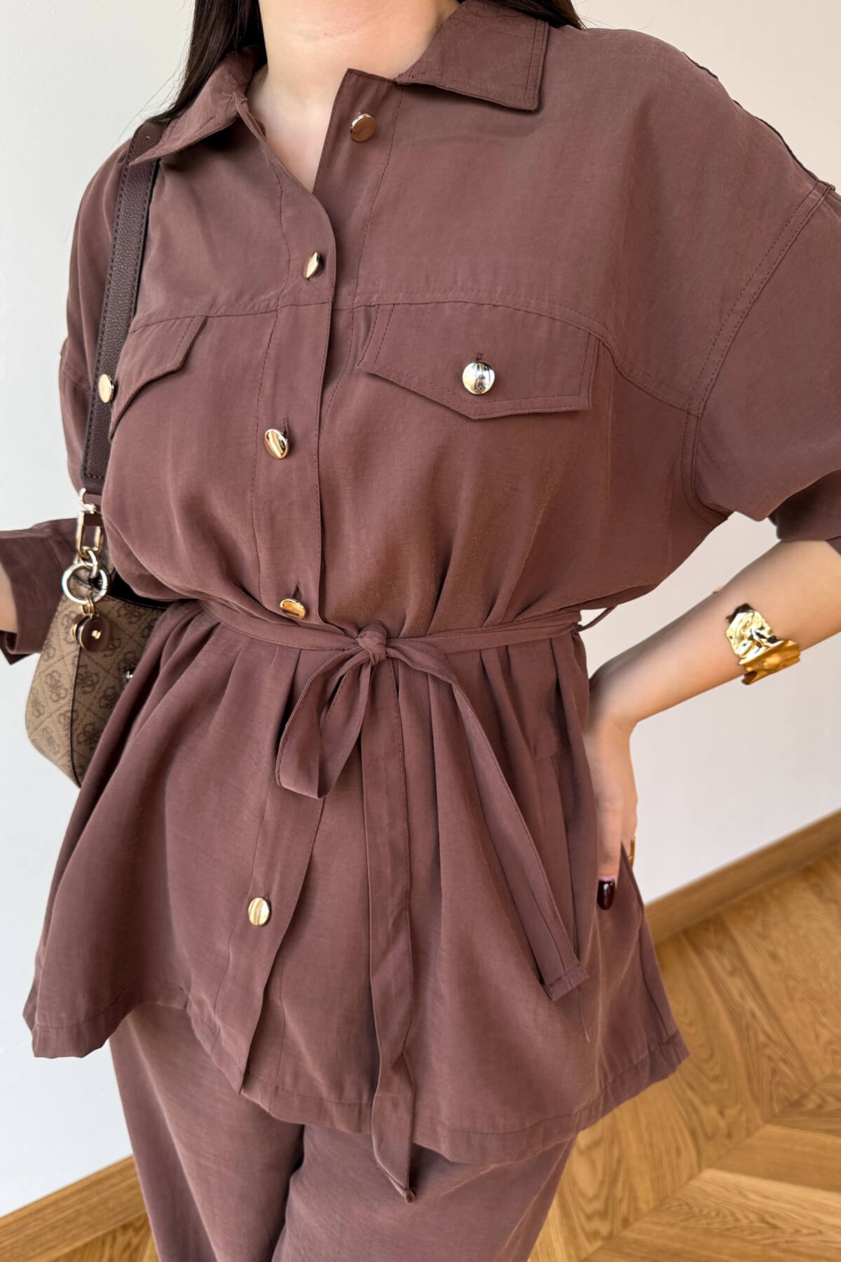 TKM-13354 Açık Kahve Buruşuk Kumaş Kuşaklı Gömlek Pantolon İkili Takım
