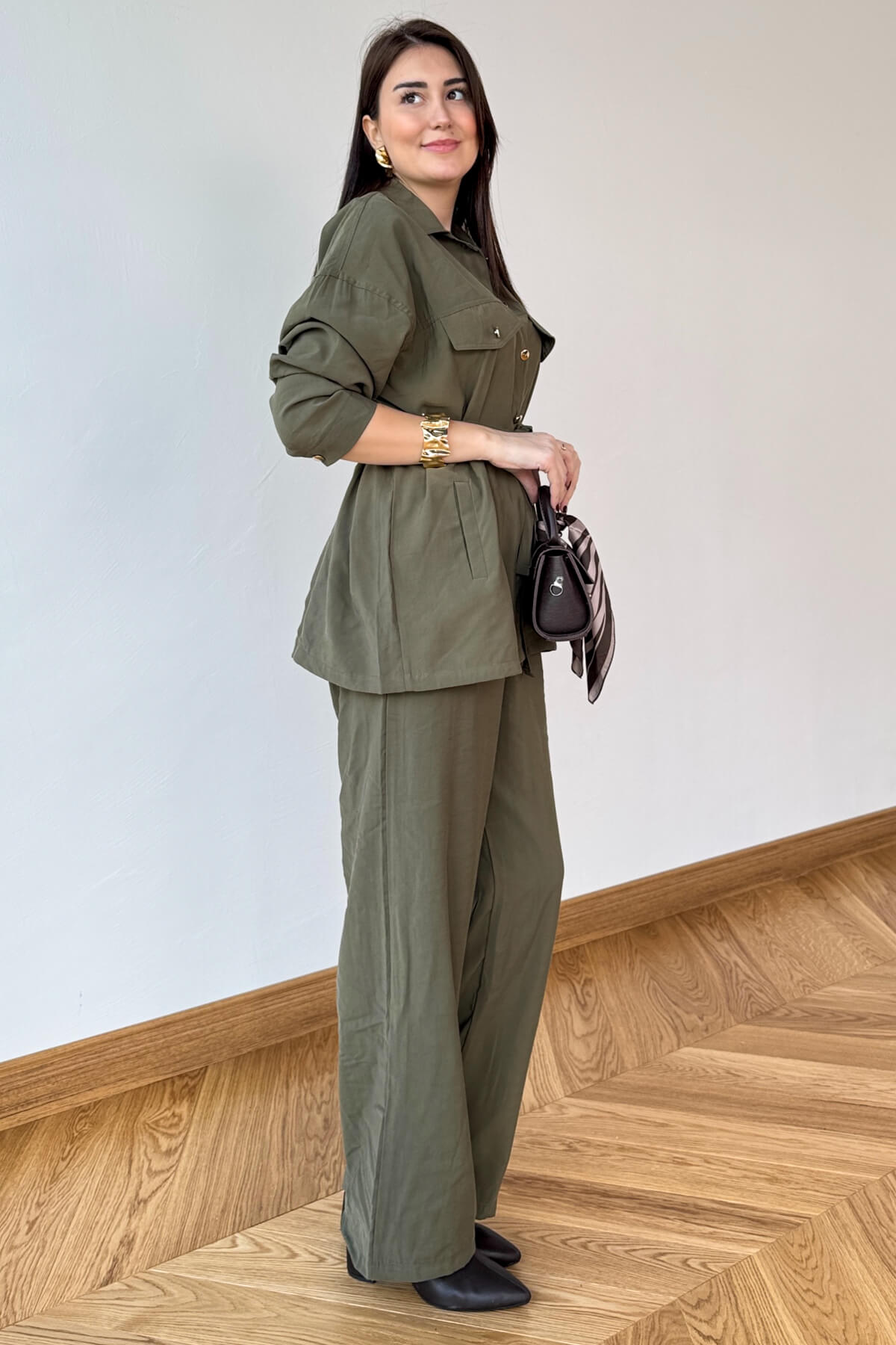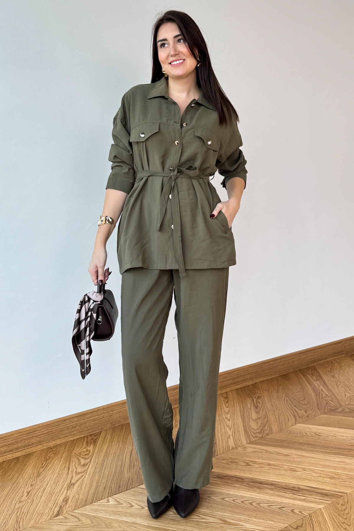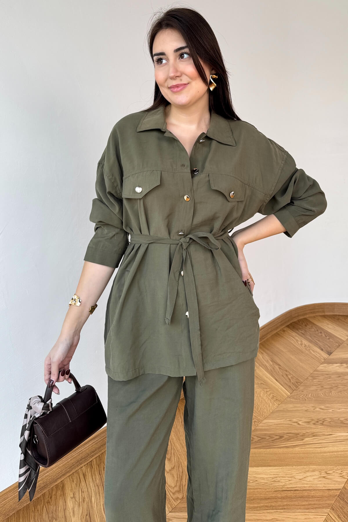 TKM-13354 Haki Buruşuk Kumaş Kuşaklı Gömlek Pantolon İkili Takım