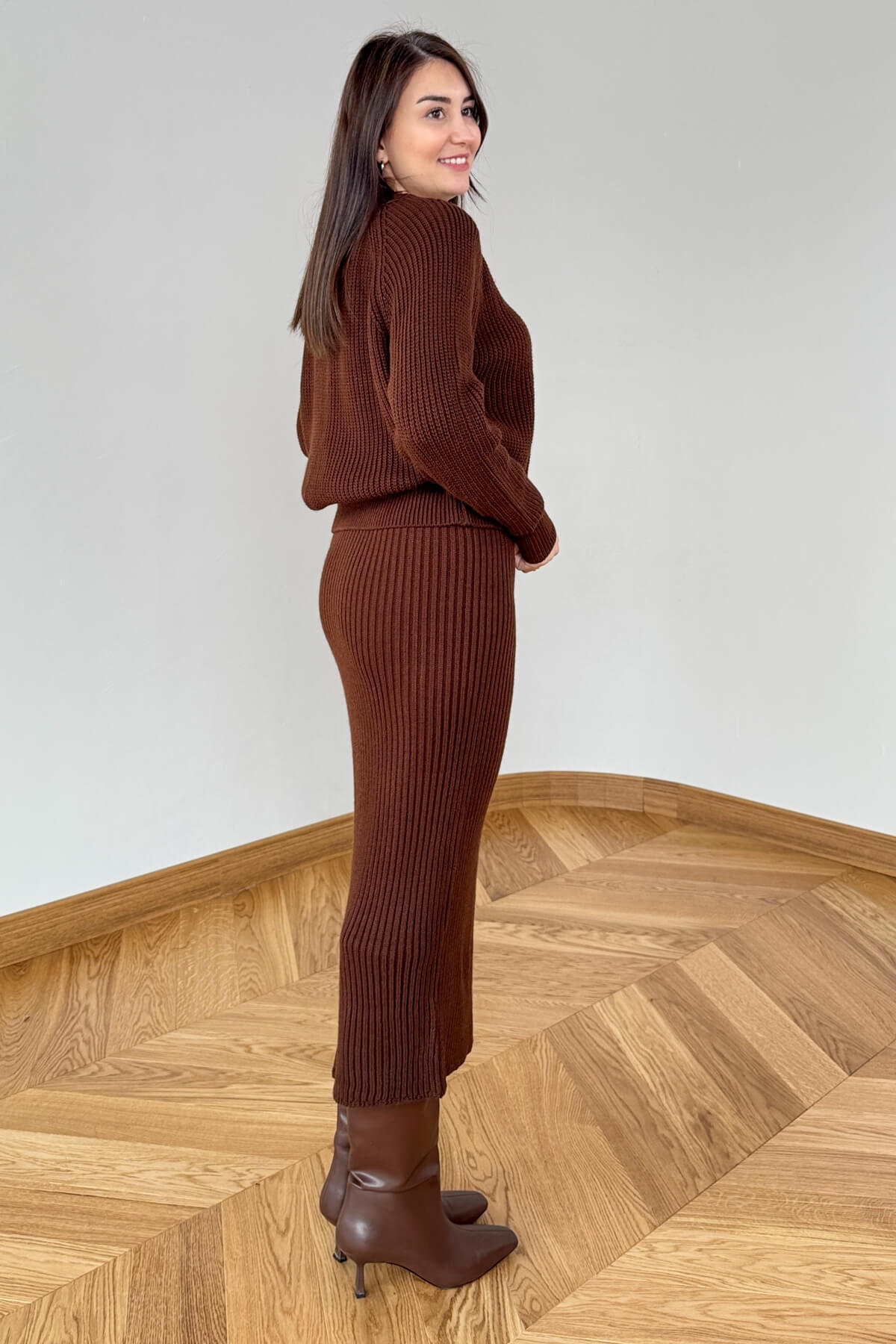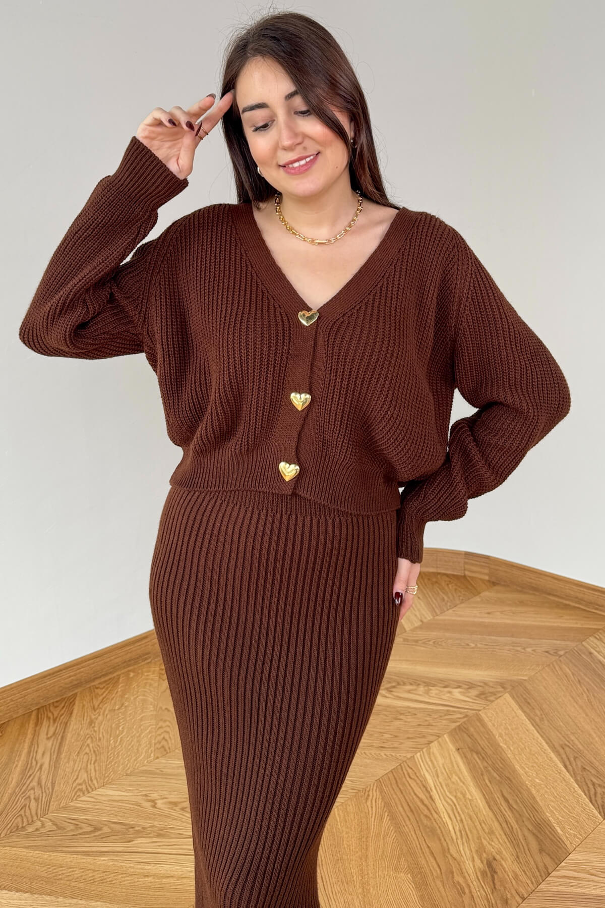 TKM-13357 Acı Kahve Kalpli Düğmeli Hırka & Etek Oversize Triko Takım