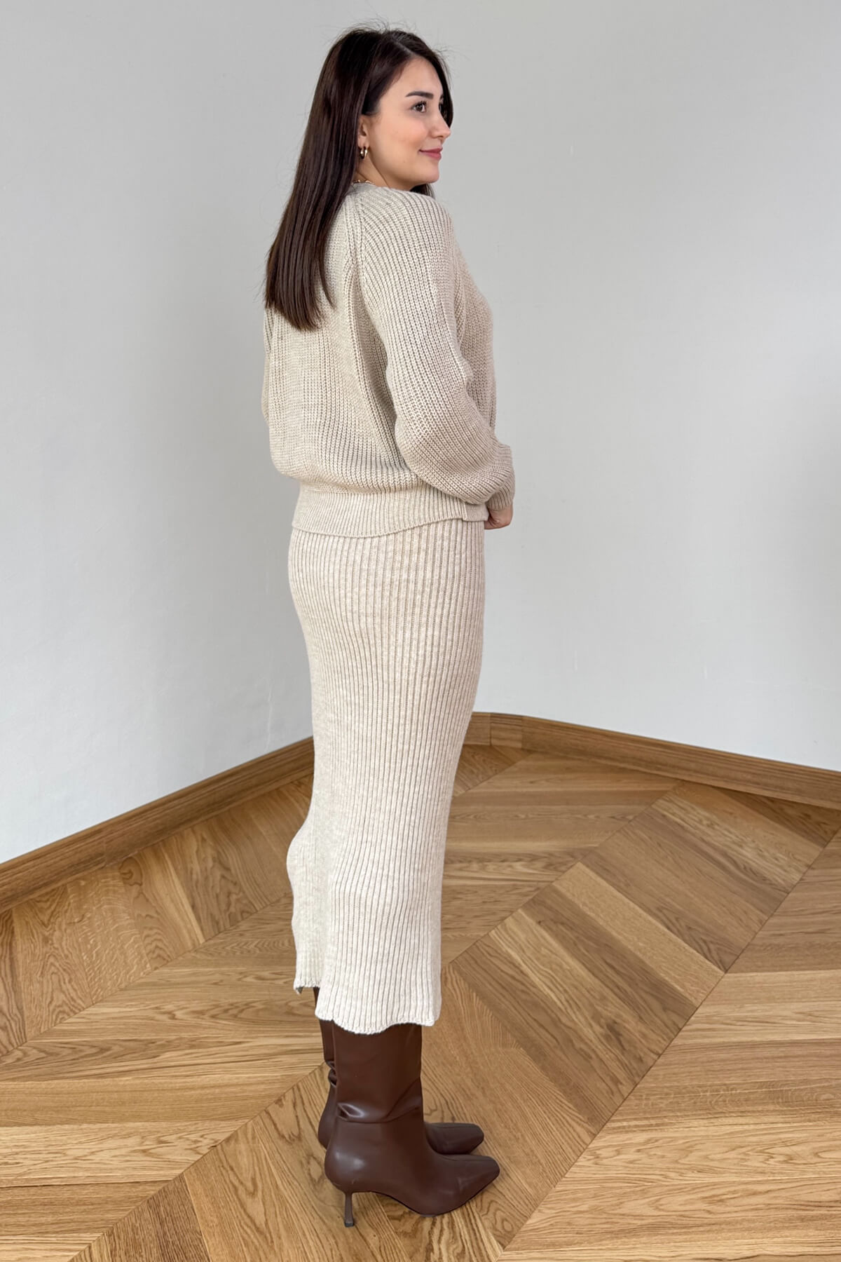 Yırtmaçlı triko etek, hem hareket konforu hem zarif bir duruş sunar.